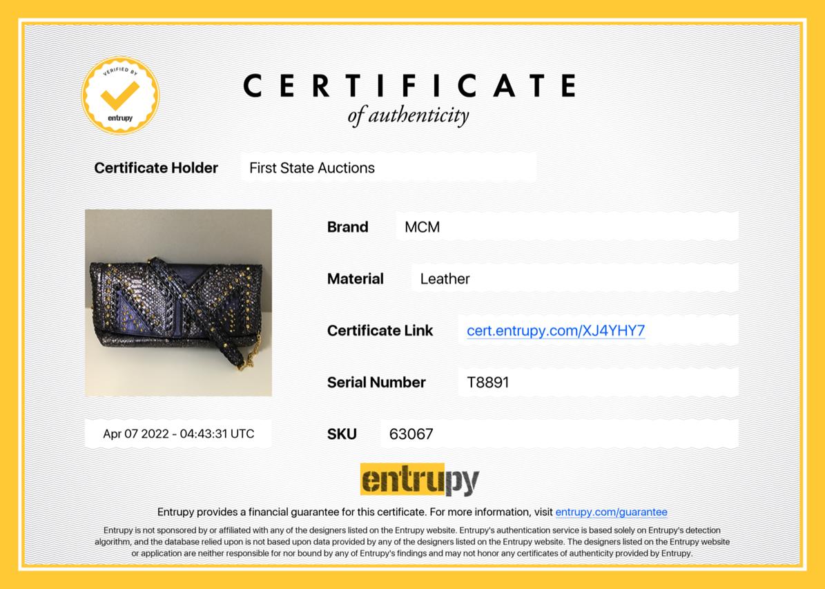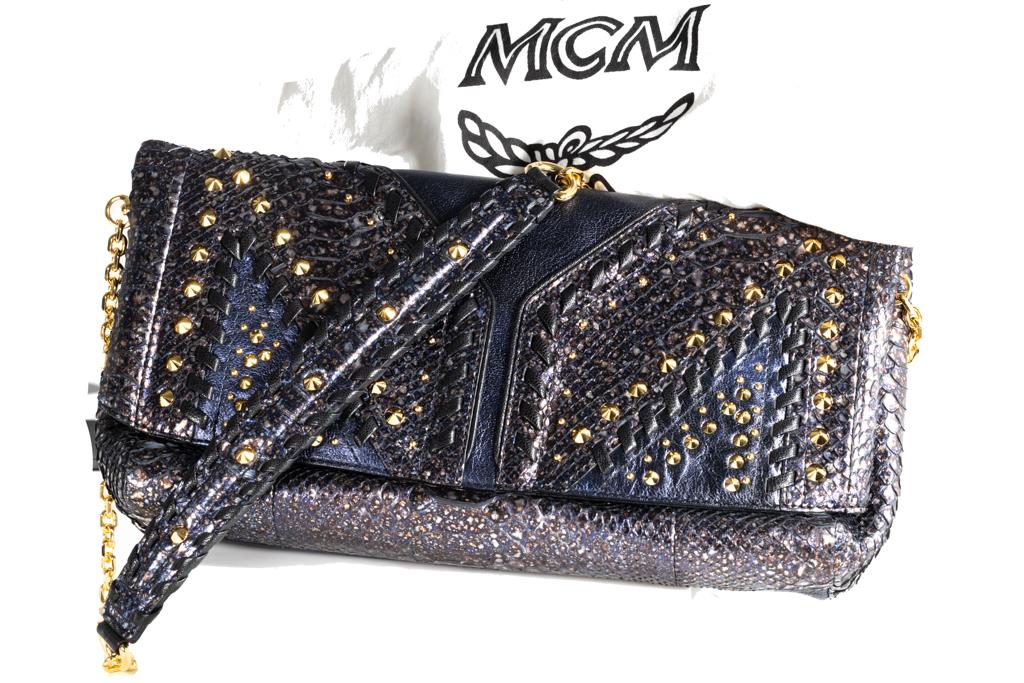 MCM Metallic Navy Leather Crossbody Bag. Featuring gold-tone studs and chain. Approximate dimensions: 32cm (W) x 15cm (H) x 7.5cm (D). Accompanied by MCM dust bag and Entrupy Certificate of Authenticity. (As New)