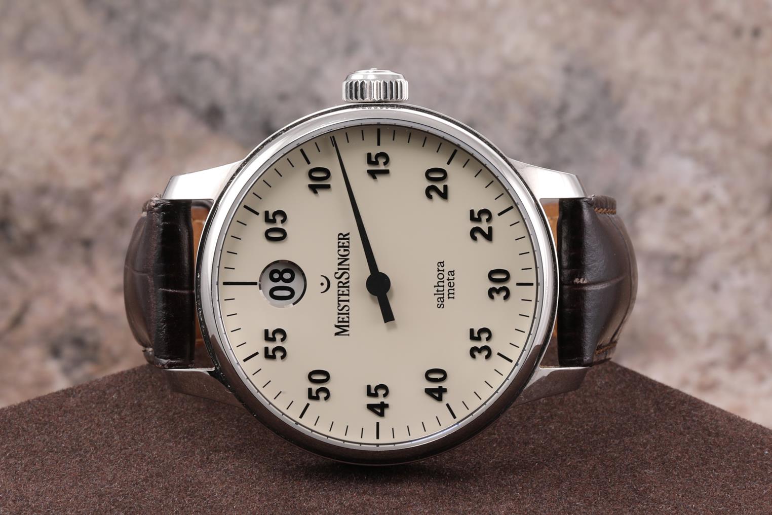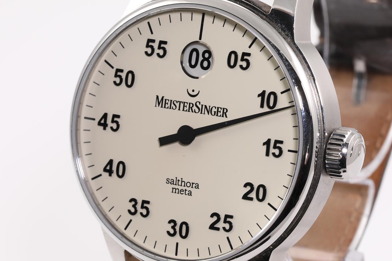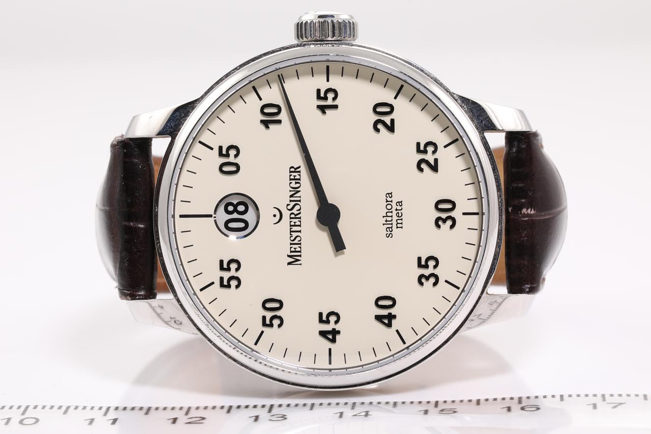 Meistersinger Salthora Meta Jumping Hour stainless steel automatic watch. Cream colour dial, case diameter: 43mm, length: 21cm, Swiss made. Ref# SAM901. With Meistersinger black leather strap and clasp. With Certificate of Authenticity, Meistersinger warranty service & handbook and Meistersinger box. 3 month FSA warranty. (Pre-owned)