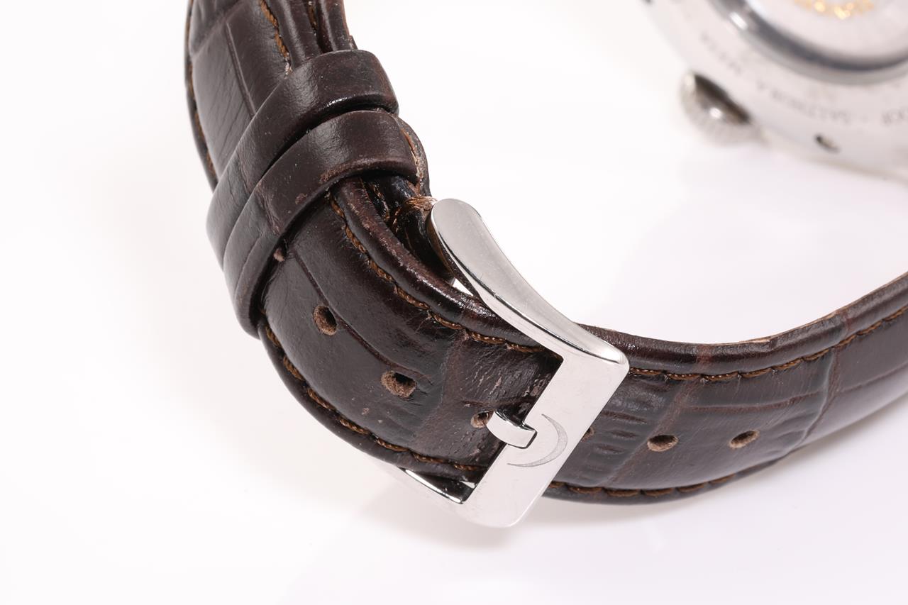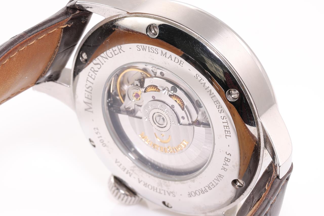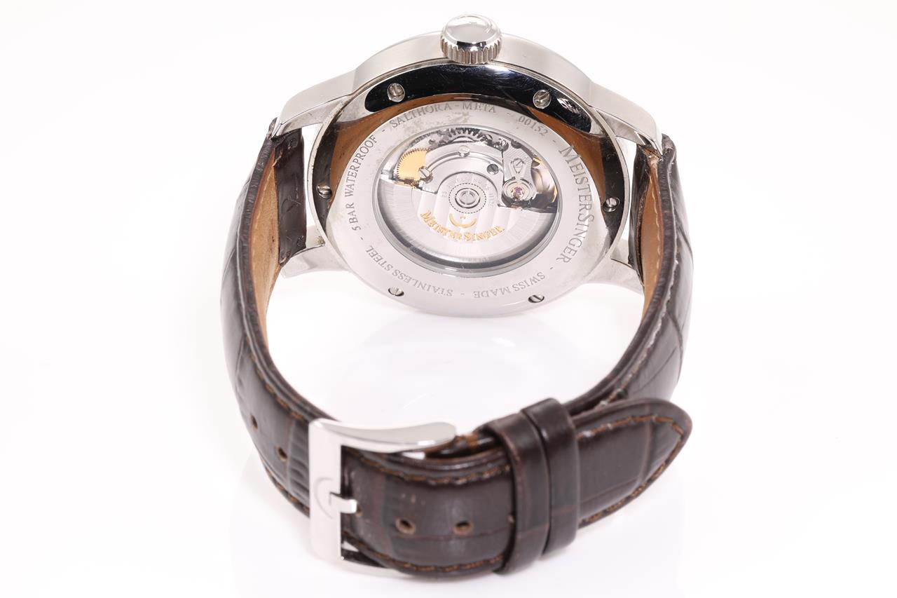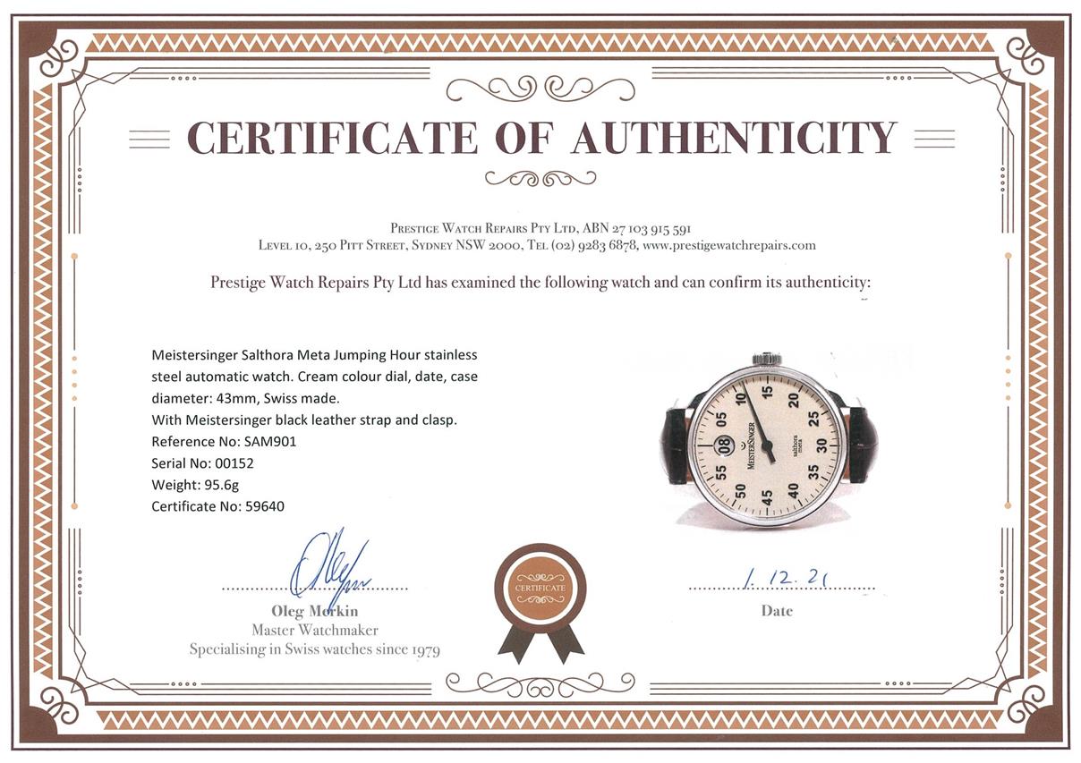 Meistersinger Salthora Meta Jumping Hour stainless steel automatic watch. Cream colour dial, case diameter: 43mm, length: 21cm, Swiss made. Ref# SAM901. With Meistersinger black leather strap and clasp. With Certificate of Authenticity, Meistersinger warranty service & handbook and Meistersinger box. 3 month FSA warranty. (Pre-owned)