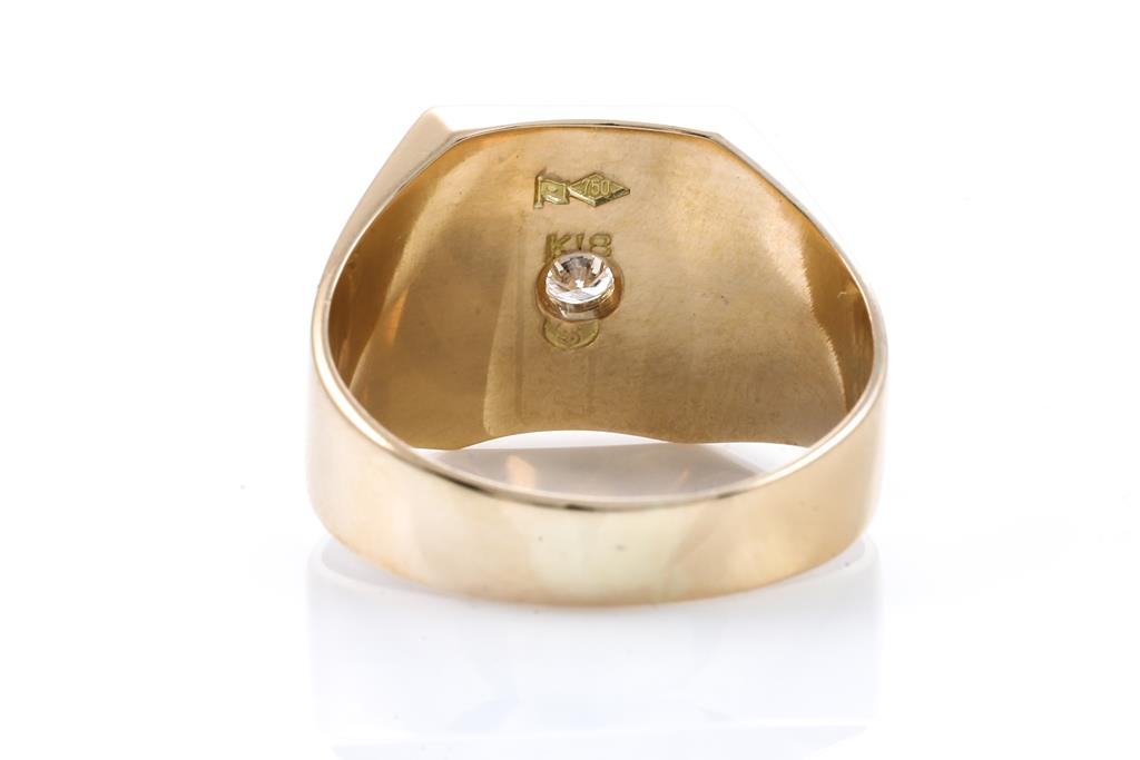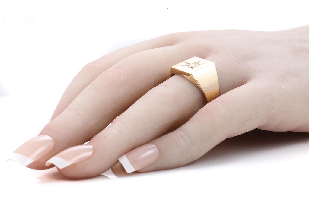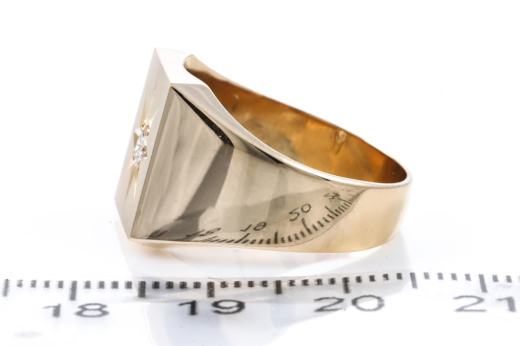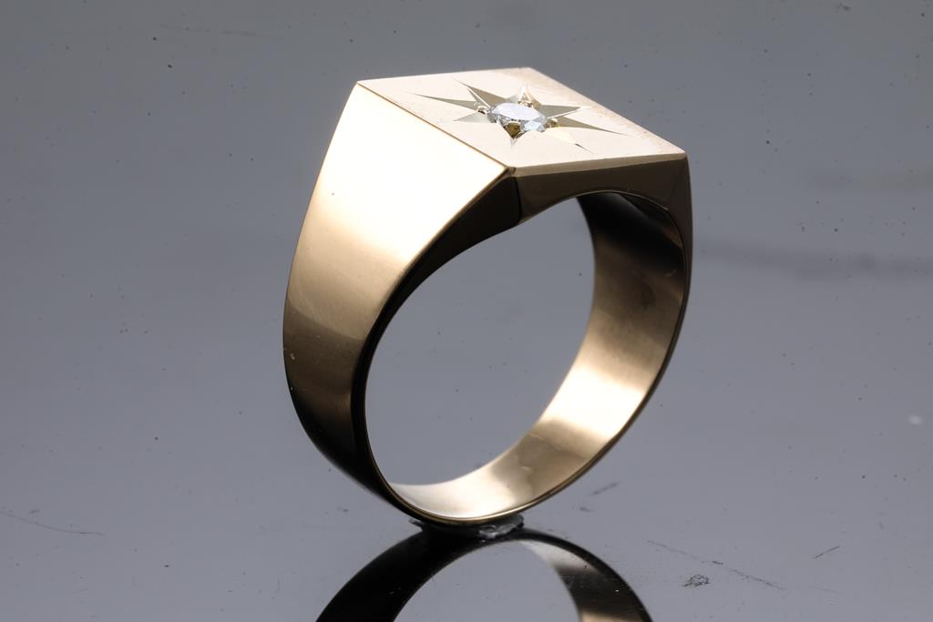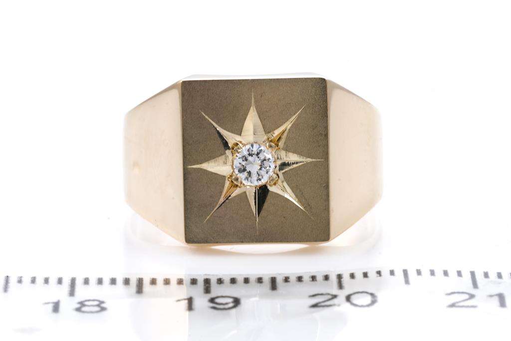 Mens Diamond ring with a round Diamond of 0.12ct (Estimated grading: H VS). 18ct yellow gold. Ring size Q. Weight: 11g. (Pre-owned)