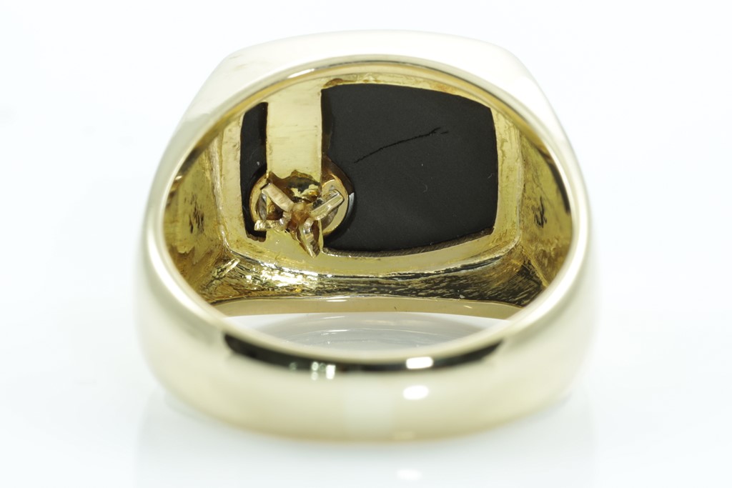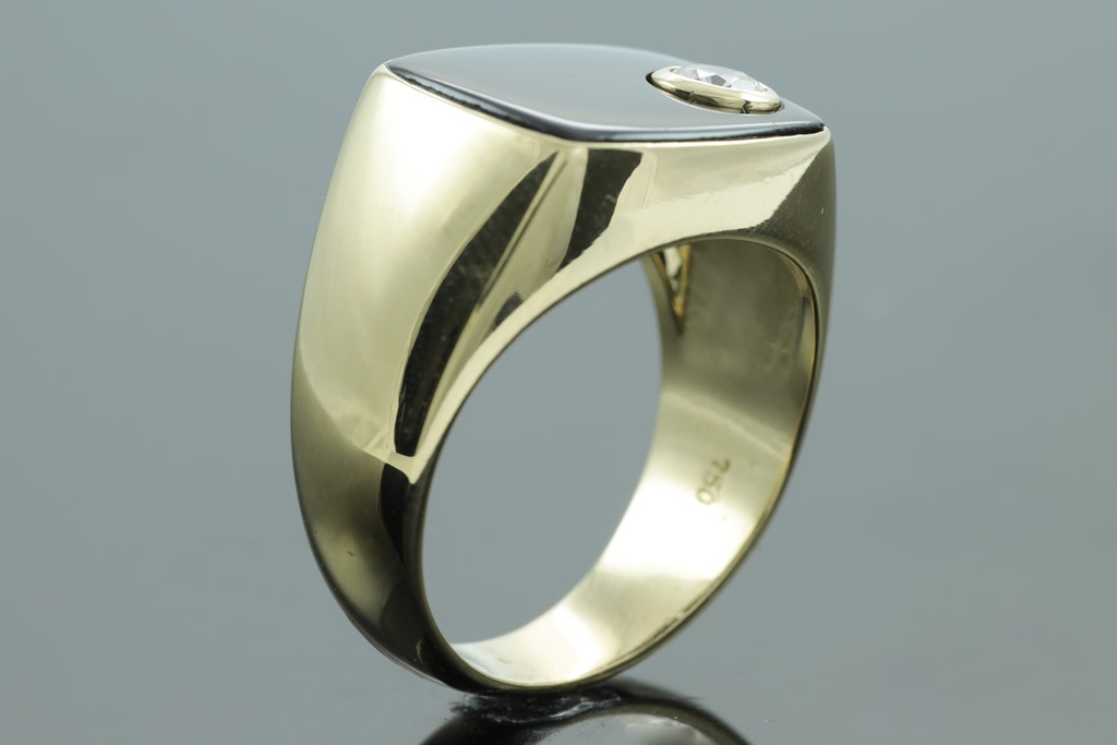 Mens ring with Onyx and a round Diamond of approximately 0.30ct (Estimated grading: G-H VS). 18ct yellow gold. Ring size Q1/2 - ring resizing is not recommended. Weight: 13.3g. (Pre-owned).