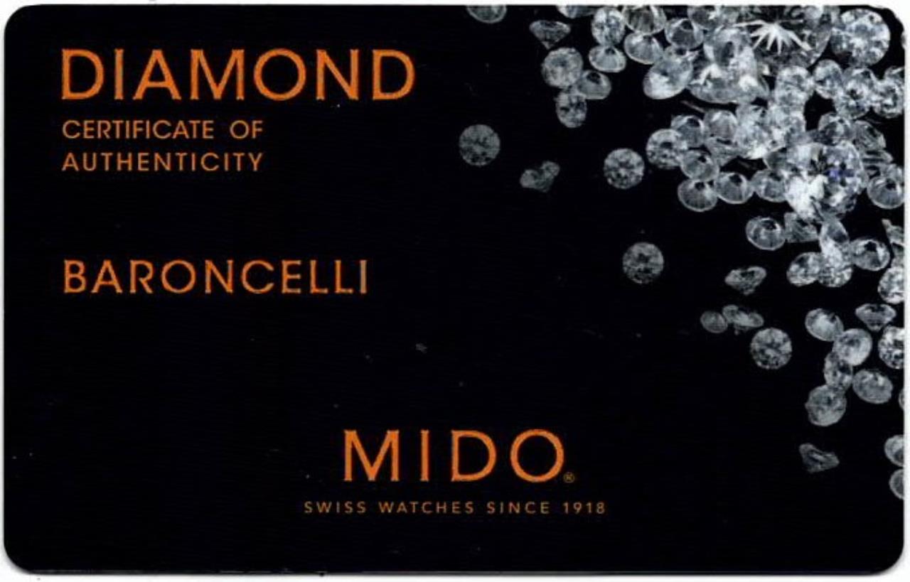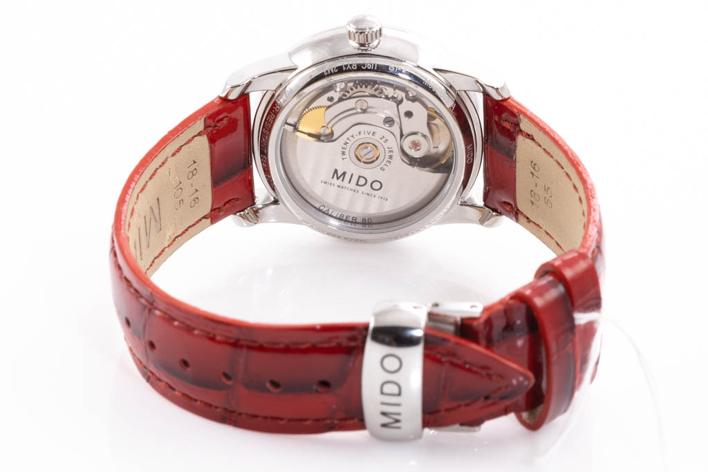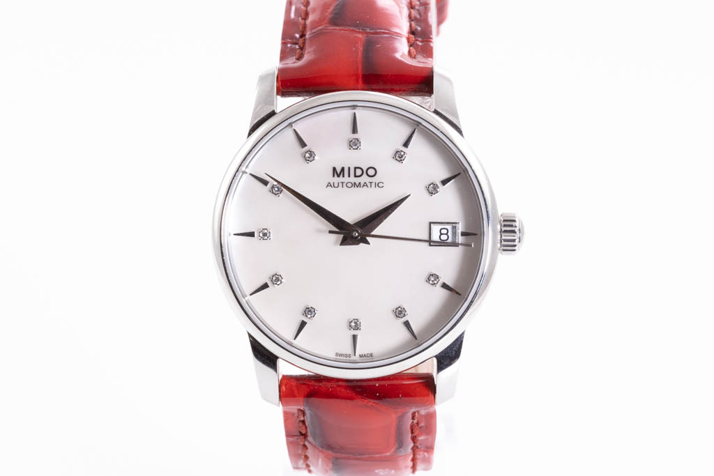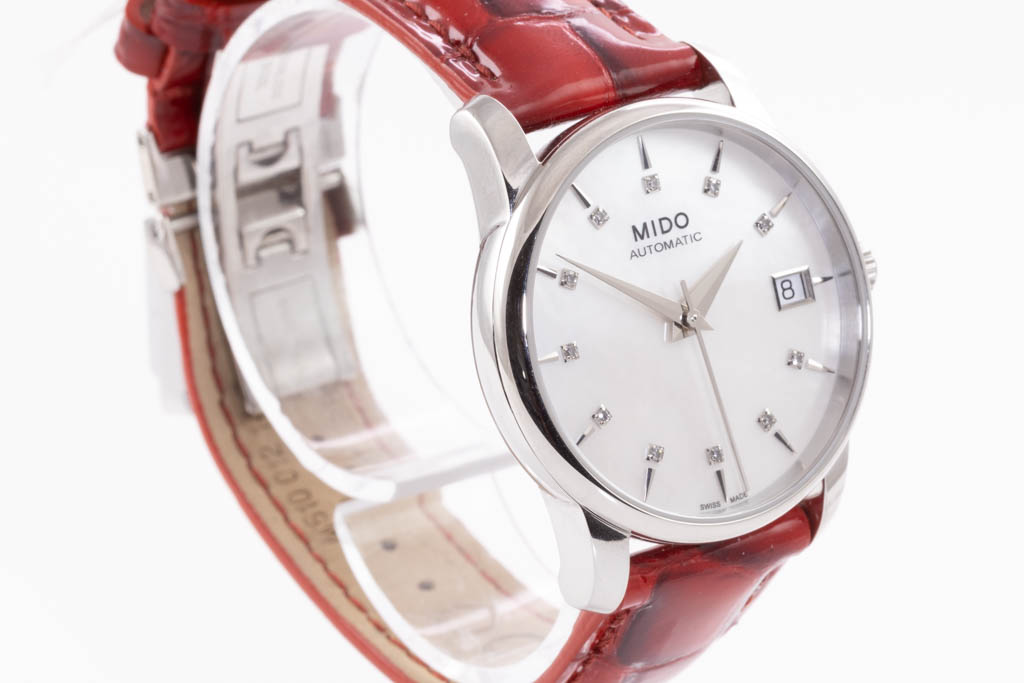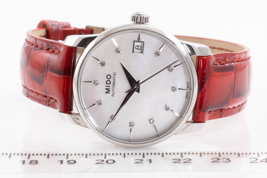 Mido Baroncelli III stainless steel automatic ladies watch. Mother of Pearl dial, Diamond indicators, date, case diameter: 33mm, strap length: 17cm, Swiss made. Ref# M007.207.16.106.00. With Mido red leather strap and buckle. 3 month FSA warranty. With 2-Year International Warranty card - card is not stamped so Mido warranty does not apply. With Mido Diamond Certificate of Authenticity. (As new, NOTE: minor scratches on watch case and wear on strap due to being display stock)