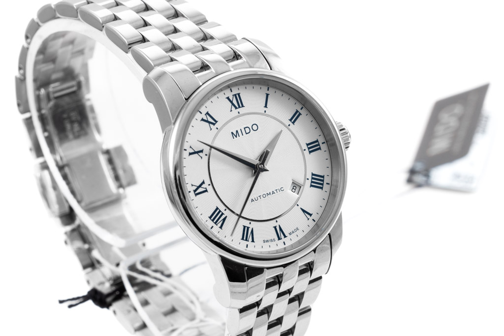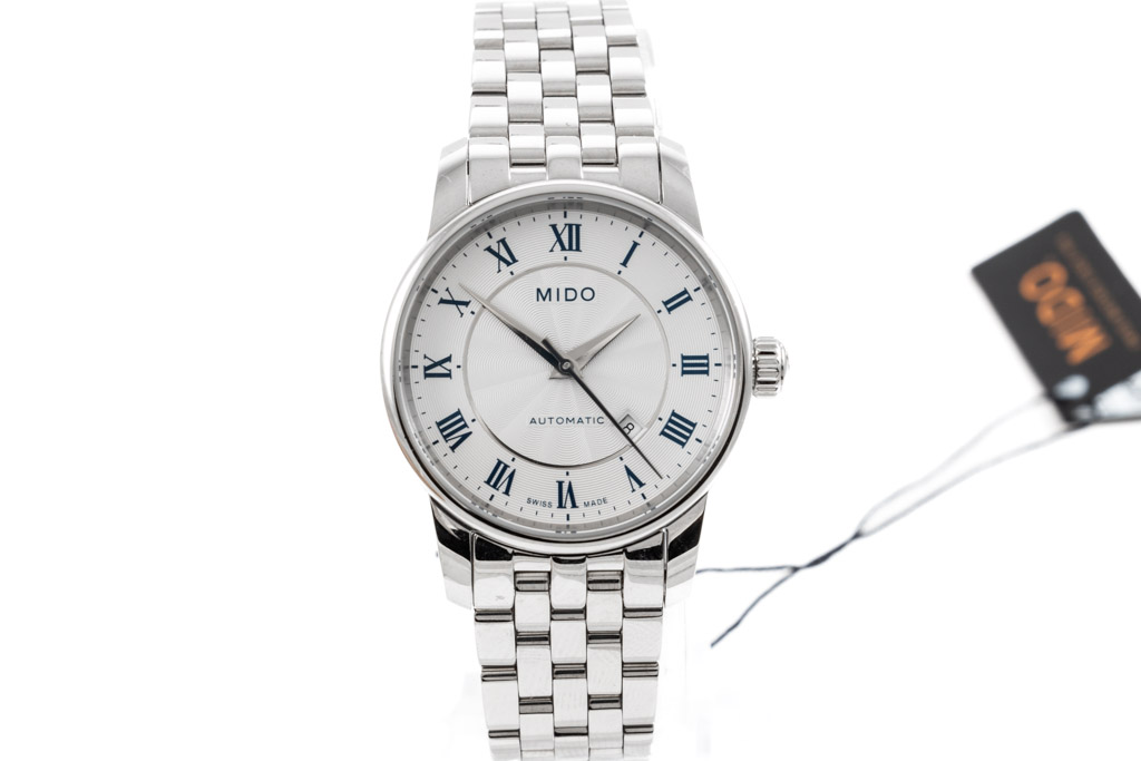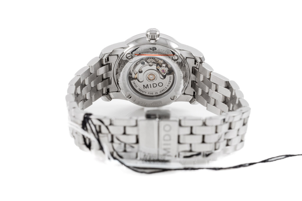 Mido Baroncelli stainless steel automatic ladies watch. Silver dial, date, case diameter: 29mm, Wrist size: 16.5cm, Swiss made. Ref# M7600.4.21.1. With stainless steel bracelet and clasp. With 2 Year International Warranty Card - the card is not stamped so Mido warranty does not apply. Box is not provided. 3 month FSA warranty. 9As New, NOTE: minor scratches on case and bracelet due to being display stock)