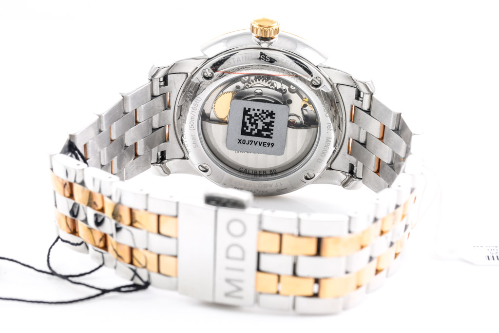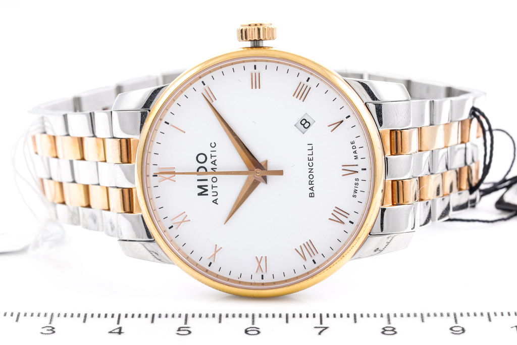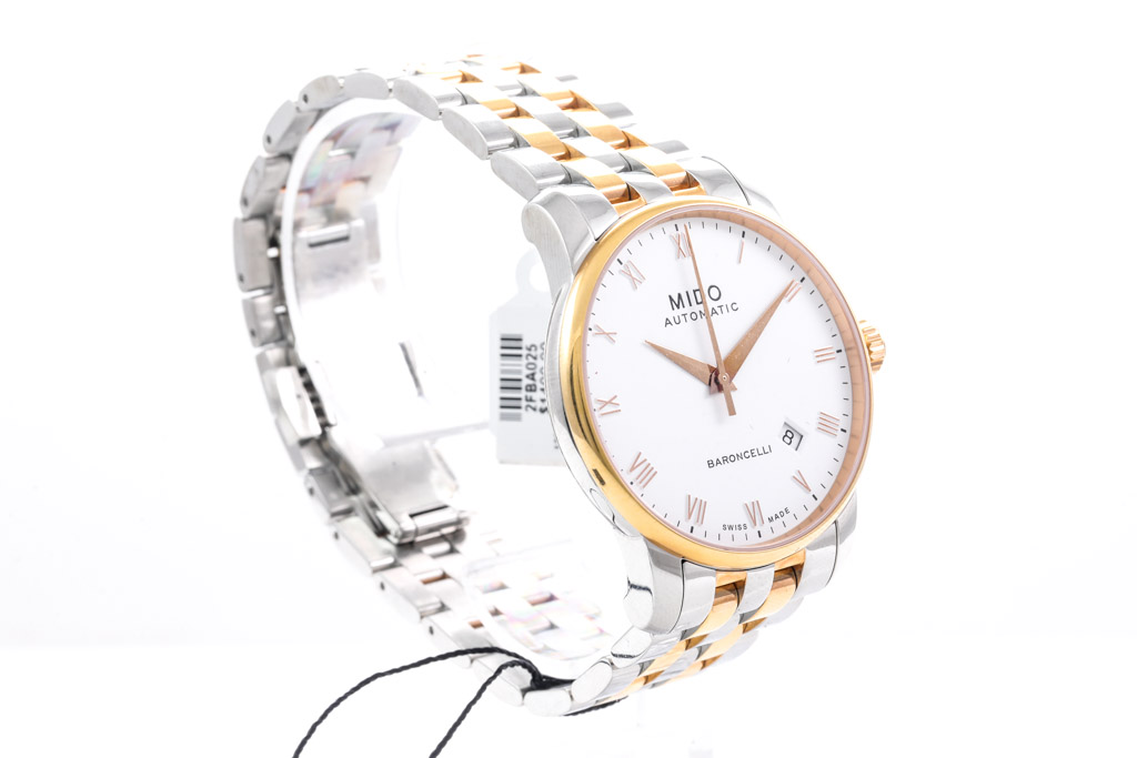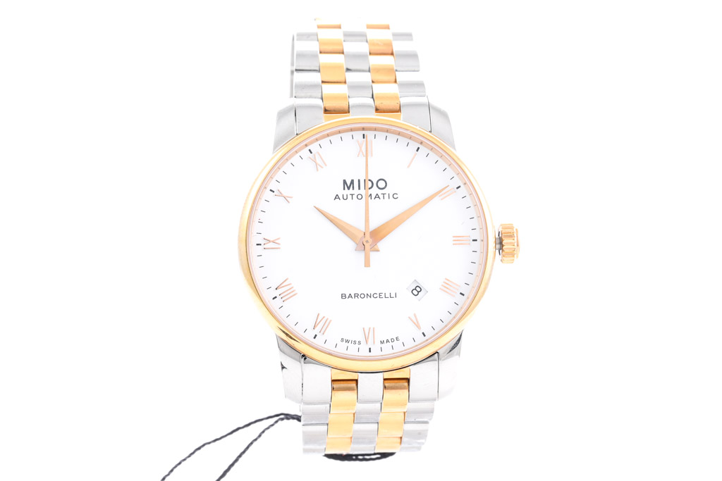 Mido Baroncelli rose gold PVD coating and stainless steel automatic mens watch. White dial, date, case diameter: 38mm, wrist size: 19cm, Swiss made. Ref# M8600.9.N6.1. With Mido two tone bracelet and clasp. With 2-year International Warranty Card - the card is not stamped so Mido warranty does not apply. No box provided. 3 month FSA warranty. (As New, NOTE: minor scratches on case and bracelet due to being display stock)