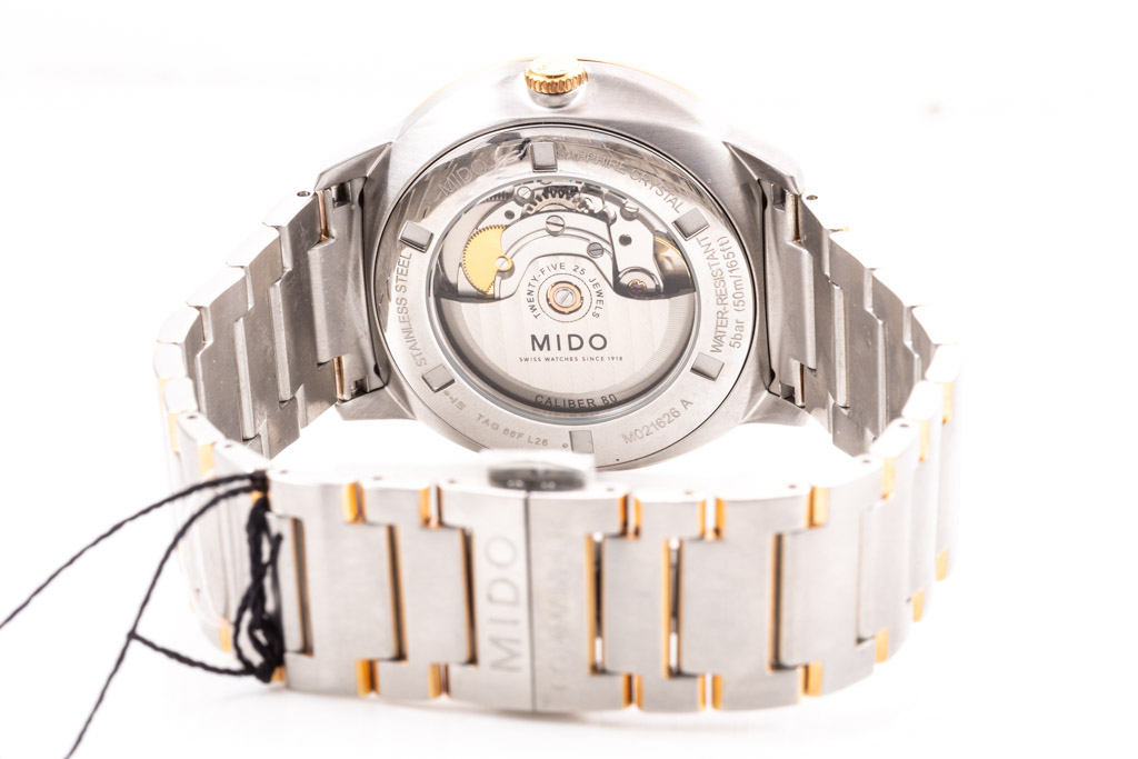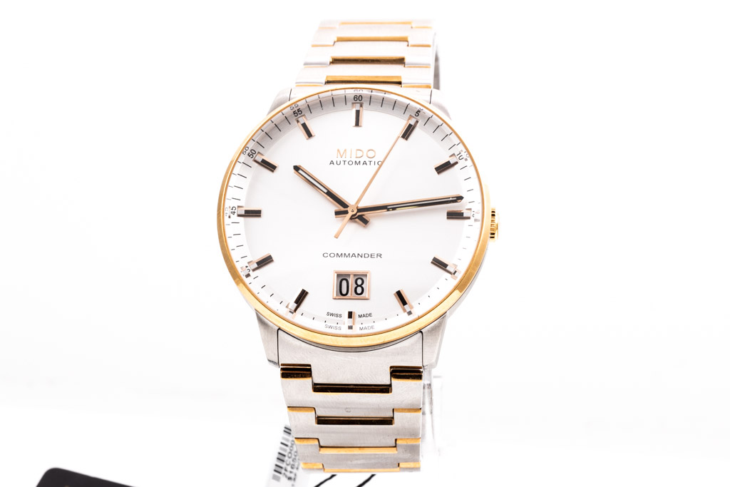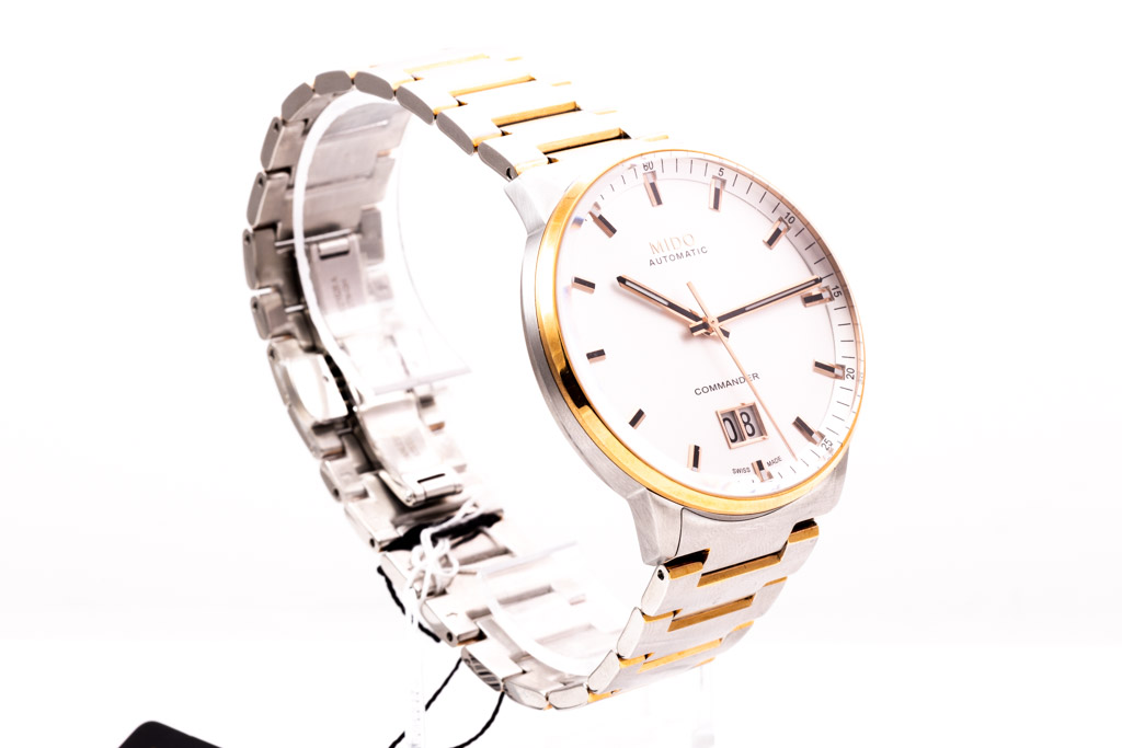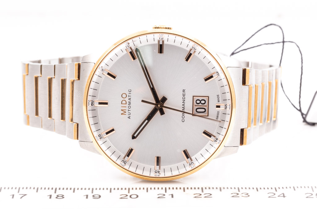 Mido Commander Big Date stainless steel with rose gold PVD coating automatic mens watch. Silver dial, date, case diameter: 42mm, wrist size: 20cm, Swiss made. Ref# M021.626.22.031.00. With Mido two tone bracelet and clasp. With 2-Year International Warranty Card - the card is not stamped so the Mido warranty does not apply. No box provided. 3 month FSA warranty. (As new, Note: minor scratches on case and bracelet due to being display stock)