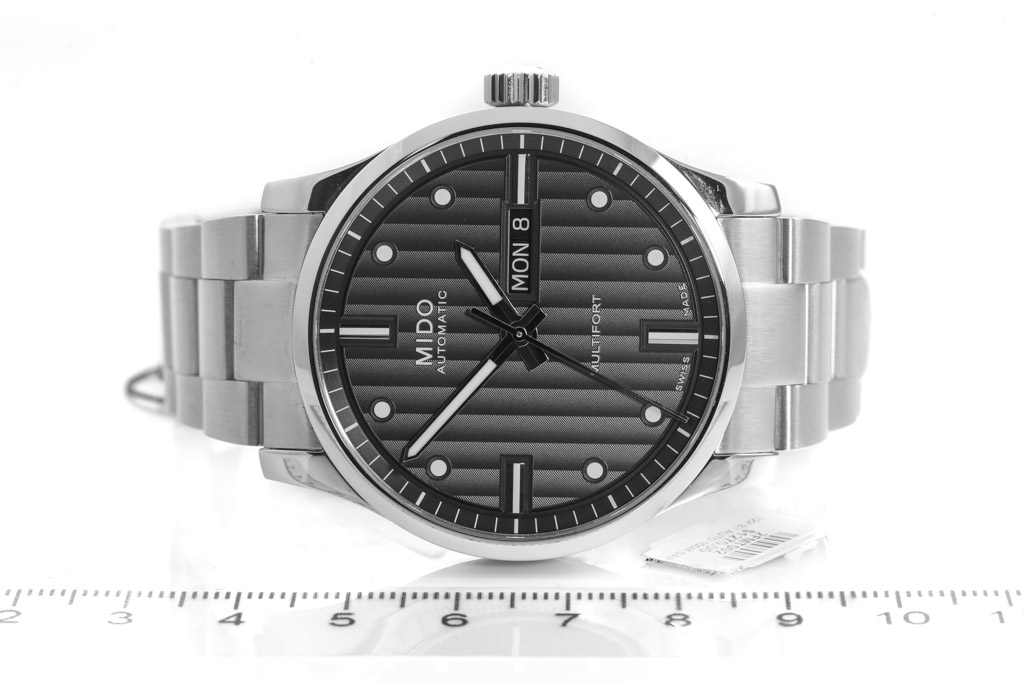 Mido Multifort stainless steel automatic mens watch. Dark grey dial, day & date, case diameter: 42mm, wrist size: 19cm, Swiss made. Ref# M005.430.11.061.80. With Mido stainless steel bracelet and clasp. With 2-Year International Warranty Card - card is not stamped so Mido warranty does not apply. No box provided. 3 month FSA warranty. (As New, Note: minor scratches on watch case and bracelet due to being display stock)