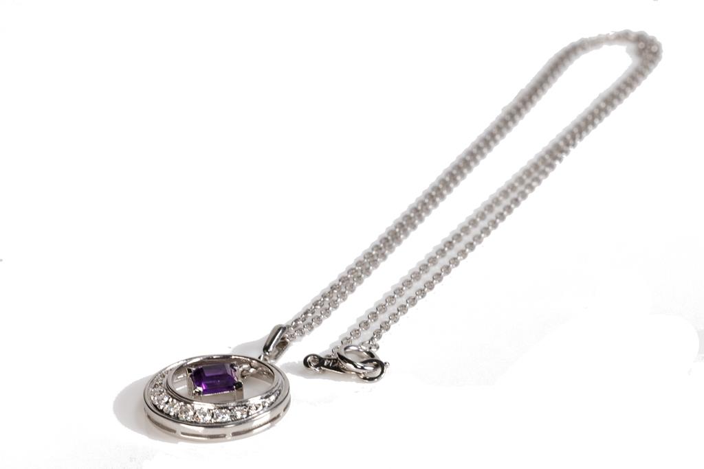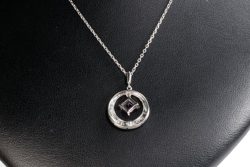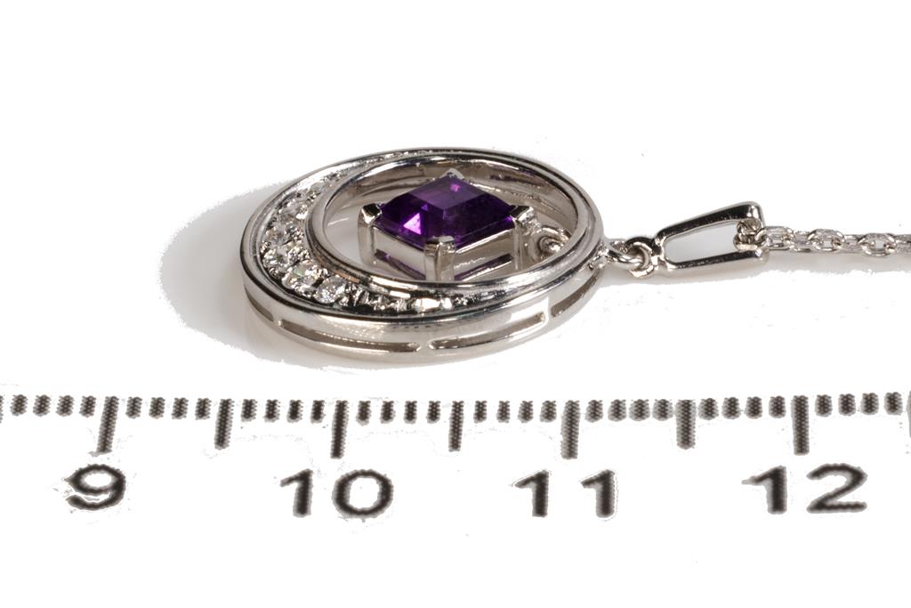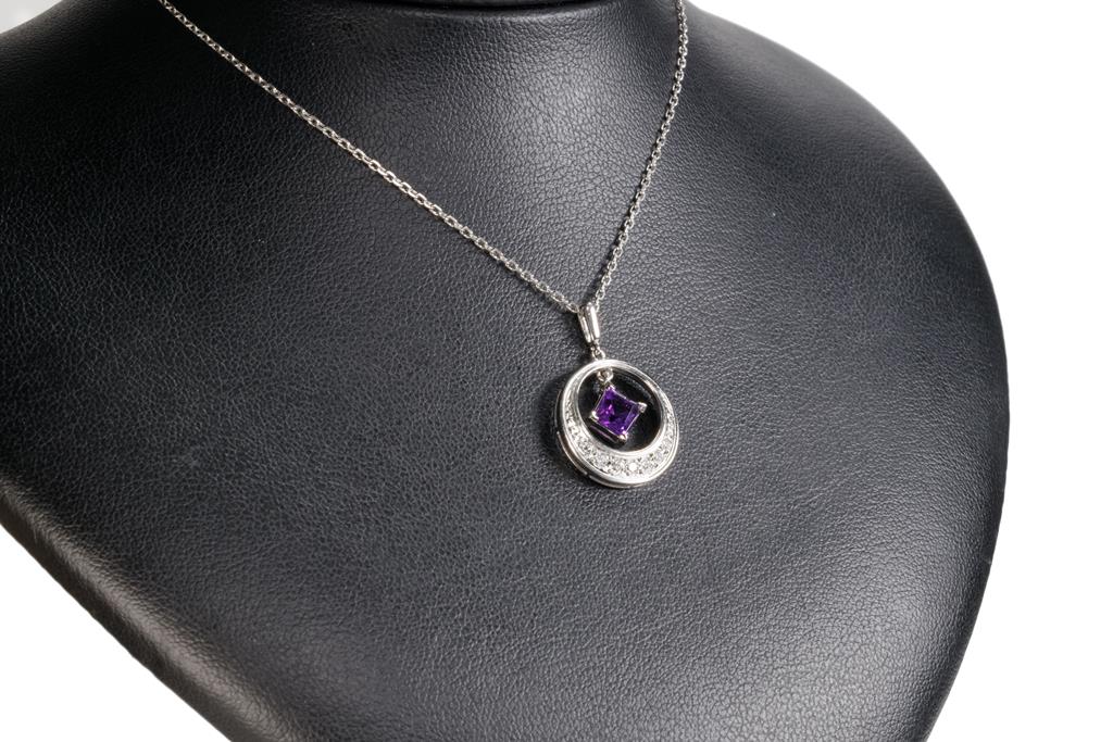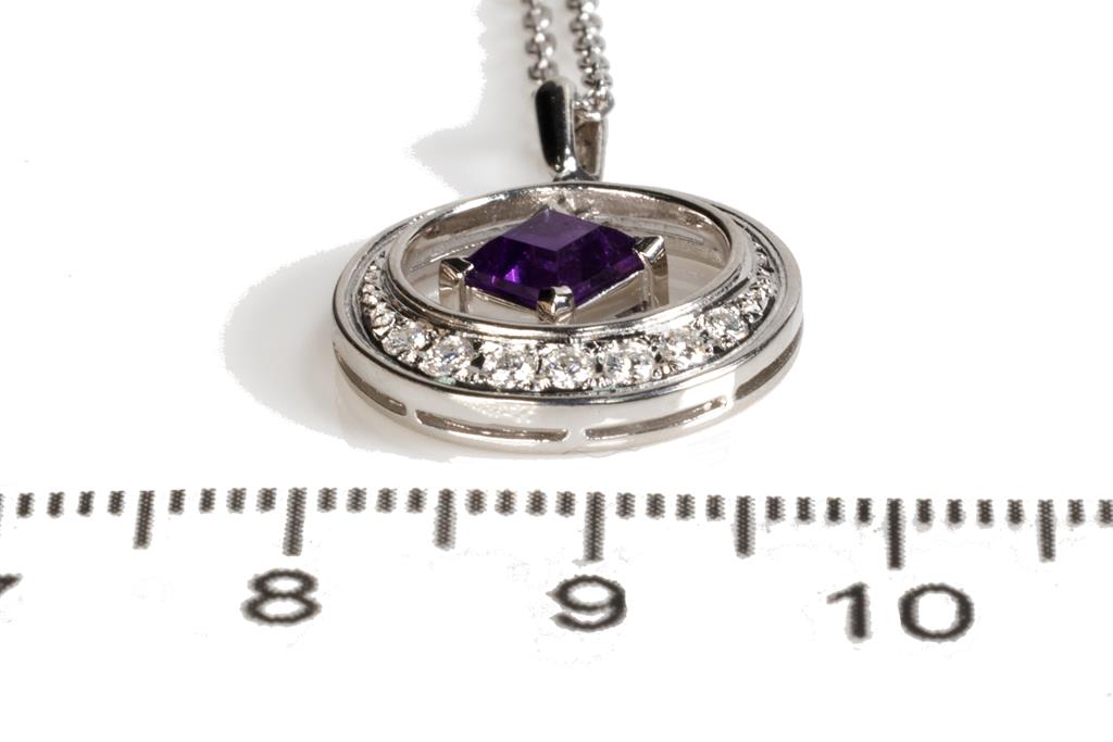 Mikimoto Amethyst and Diamond pendant with a carre cut Amethyst of approximately 0.40ct and round Diamonds totalling approximately 0.19cts. 14ct white gold with 45cm 14ct white gold unbranded chain. Weight: 4.6g. (Pre-owned)