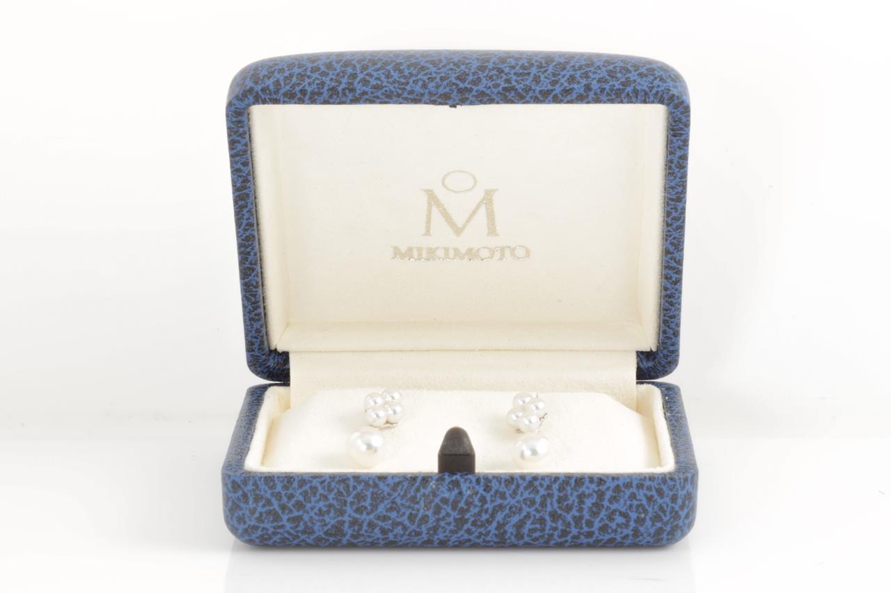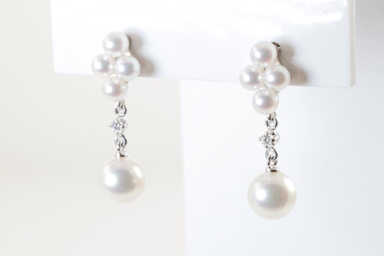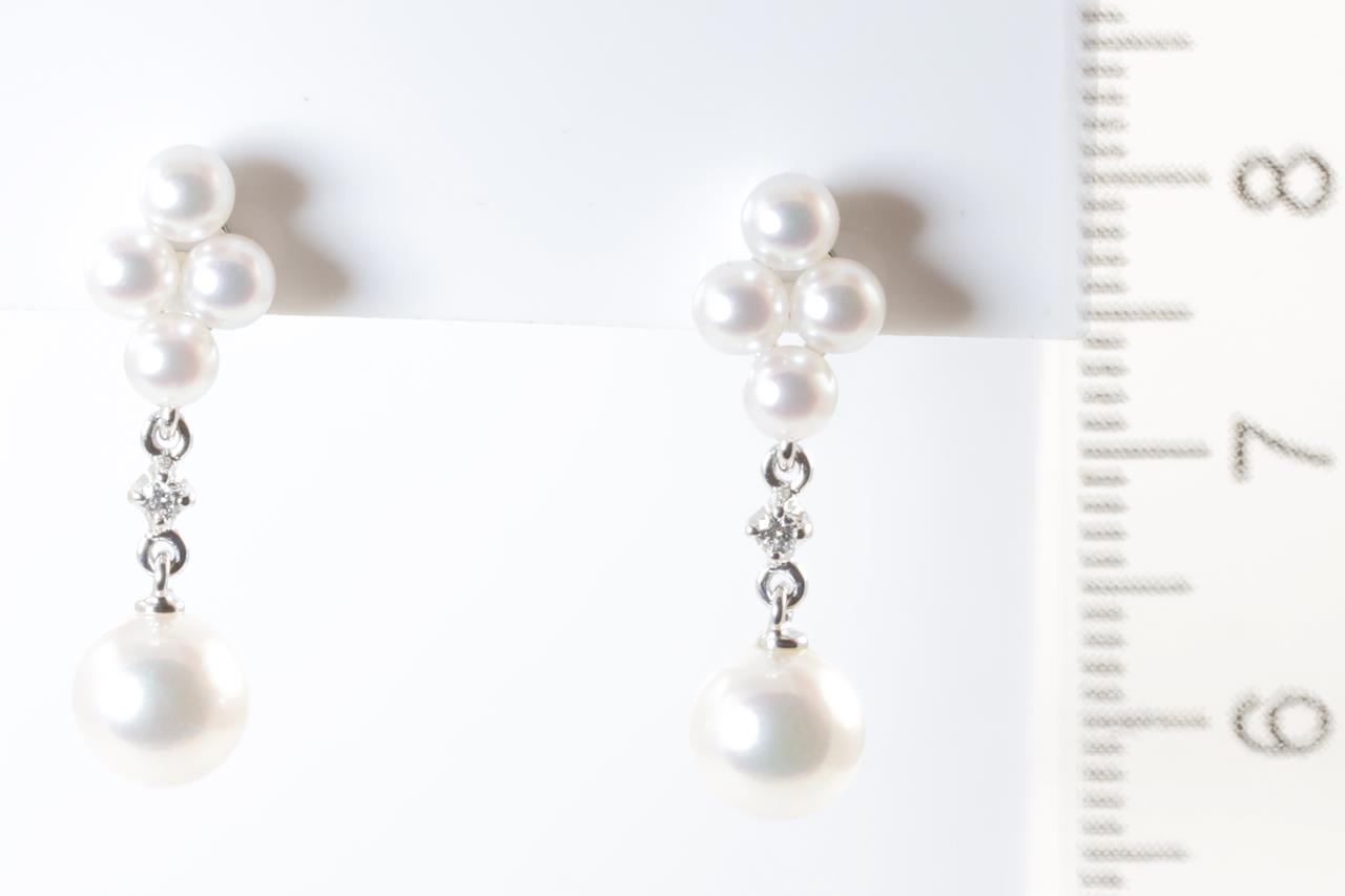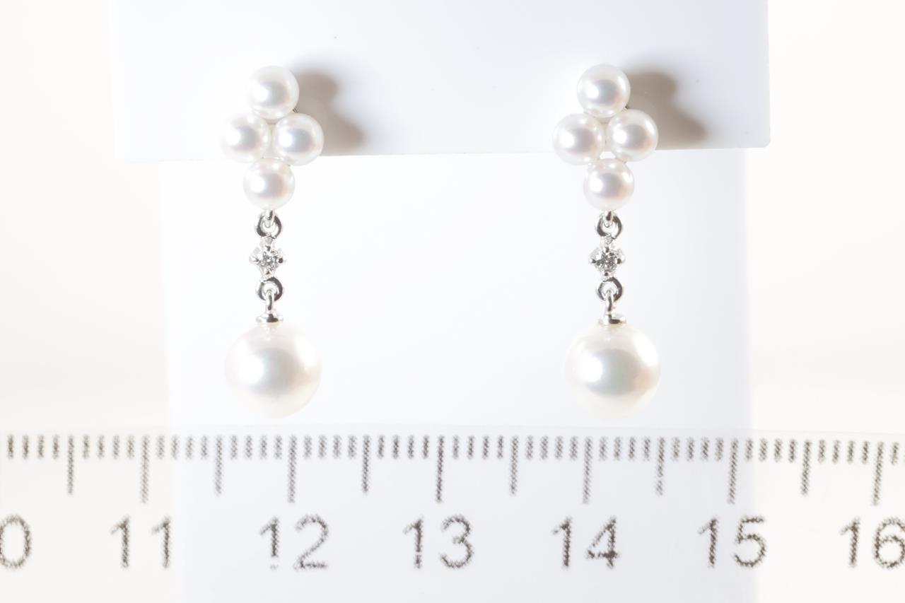 Mikimoto Diamond and Pearl earrings with cultured Pearls of 6.6mm and 2 diamonds totalling approximately 0.05cts. 18ct white gold. Weight: 3.2g. With Mikimoto box. (Pre-owned)