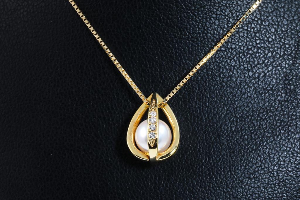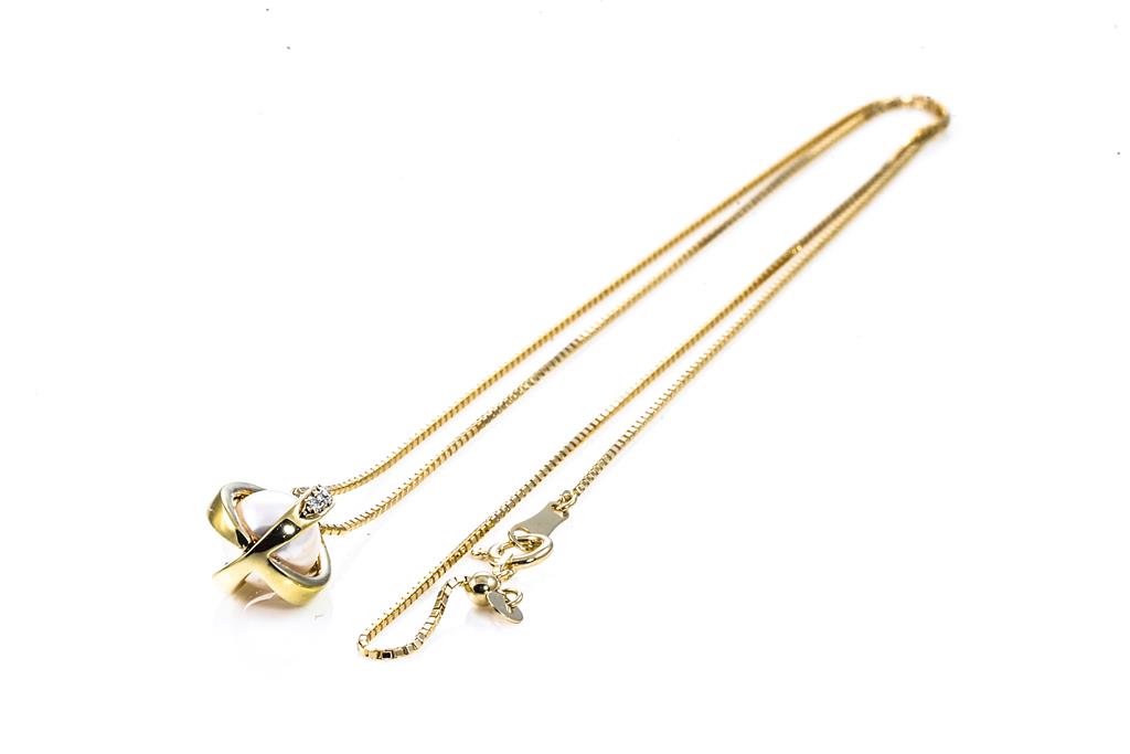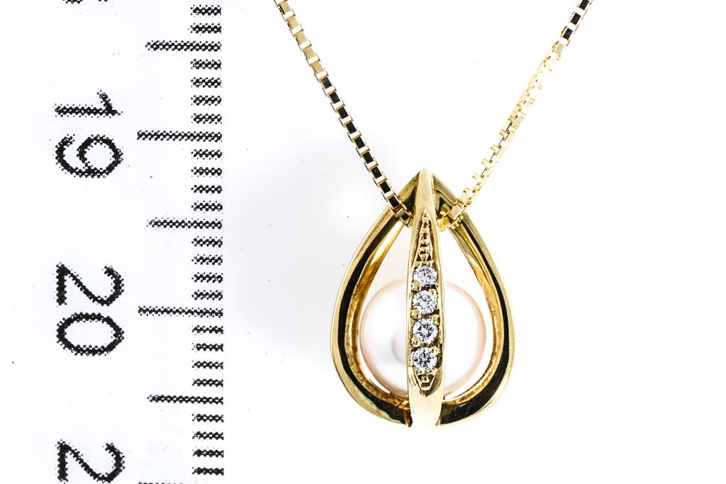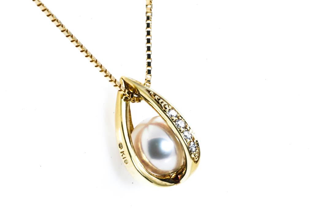 Mikimoto Pearl and Diamond pendant with Akoya Pearl of 7.00mm and 4 round Diamonds totalling approximately 0.04cts. 18ct yellow gold with 18ct yellow gold adjustable 44cm unbranded chain. Weight: 4.8g. (Pre-owned)