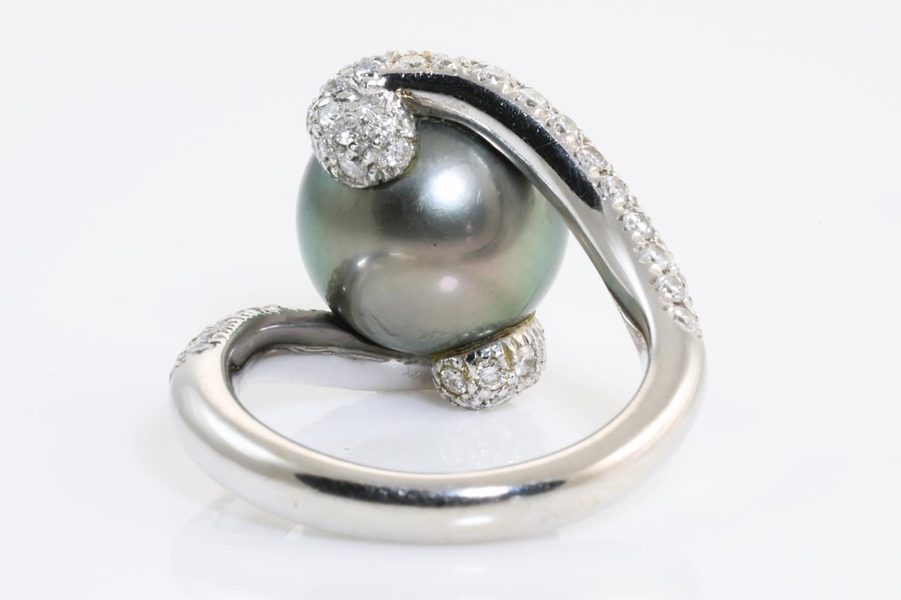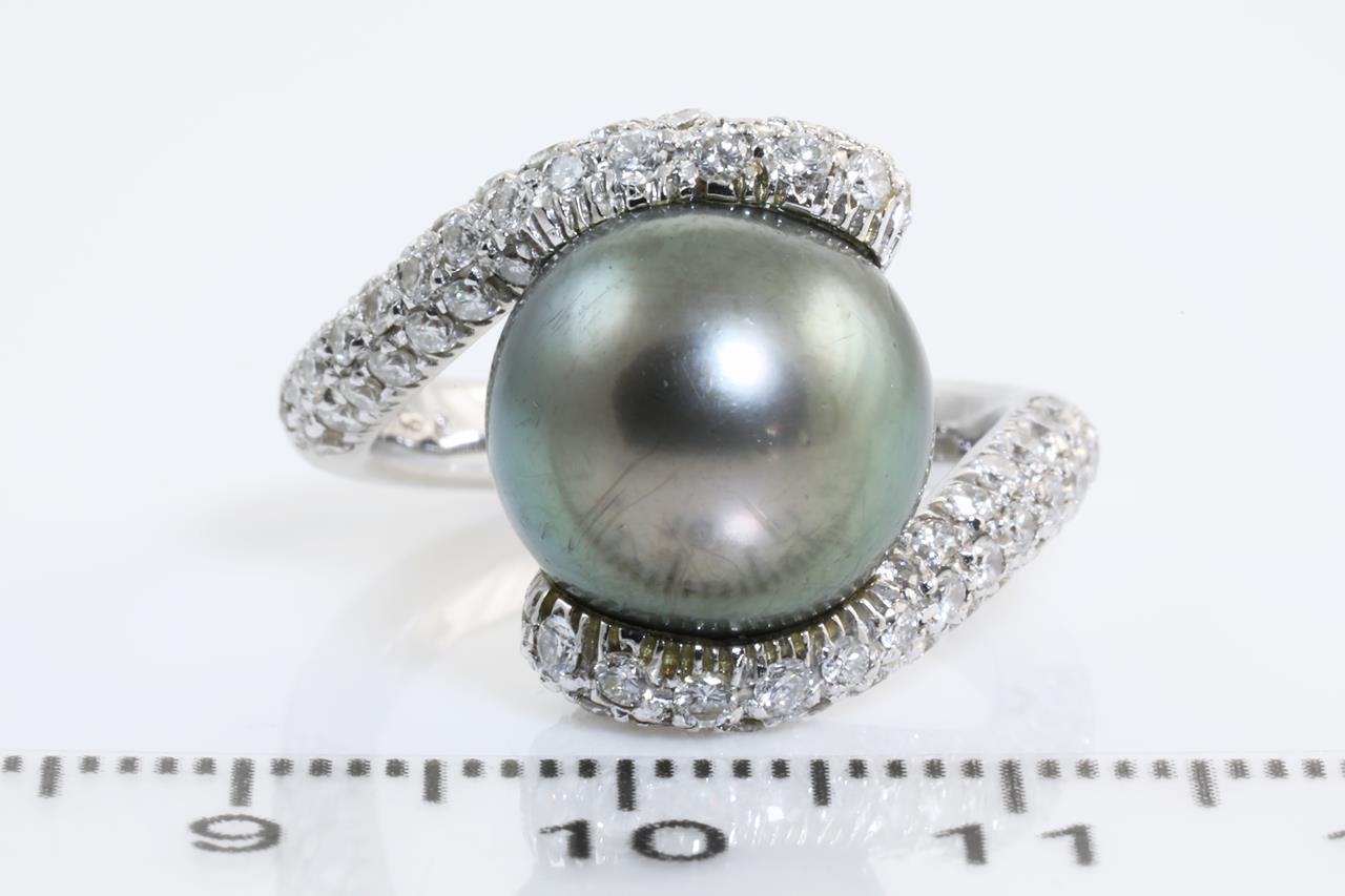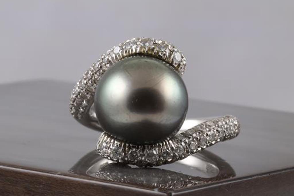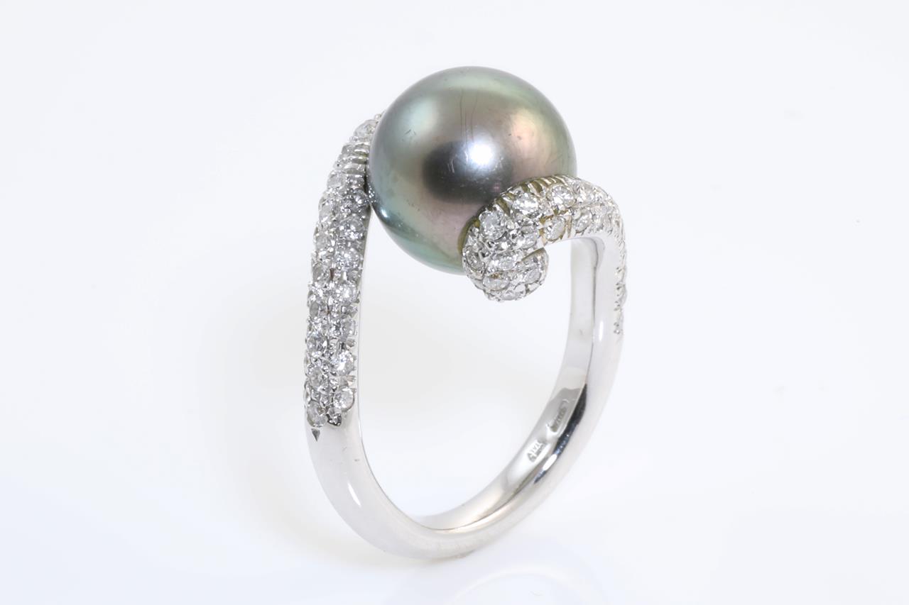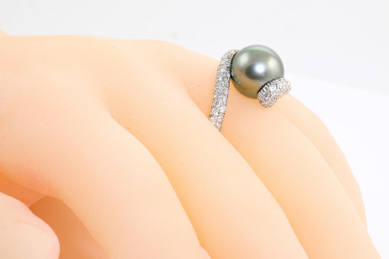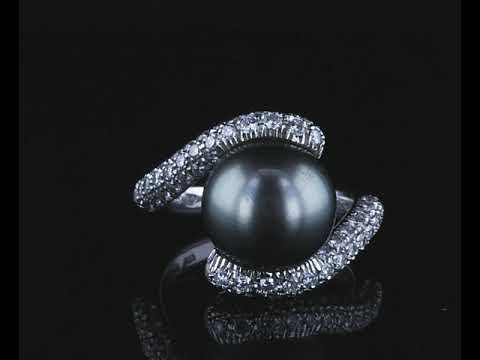 Mikimoto Pearl and Diamond ring with Tahitian Pearl of 11.8mm and round Diamonds totalling approximately 1.00cts (Estimated grading: H SI). 18ct white gold. Ring size L1/2 - Ring resizing is not recommended. Weight: 9.8g (Pre-owned)