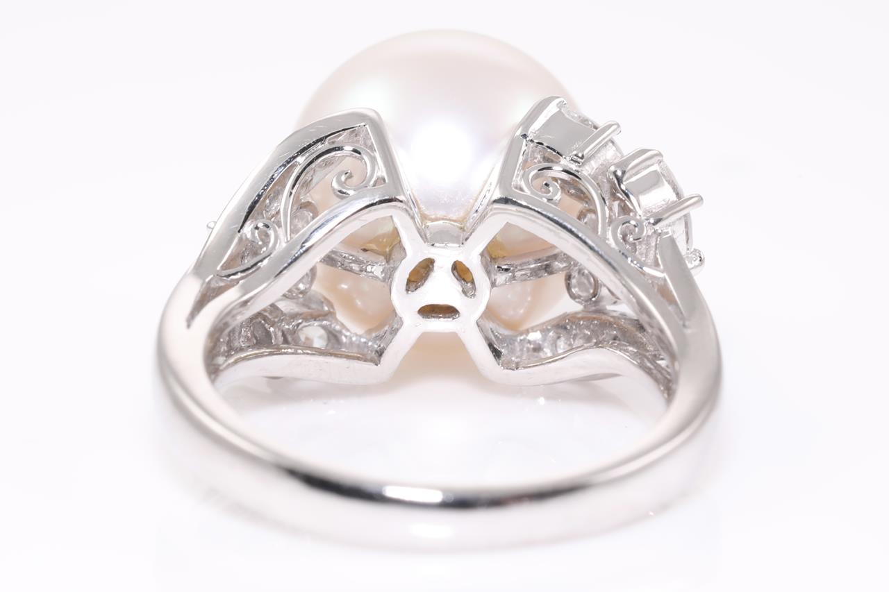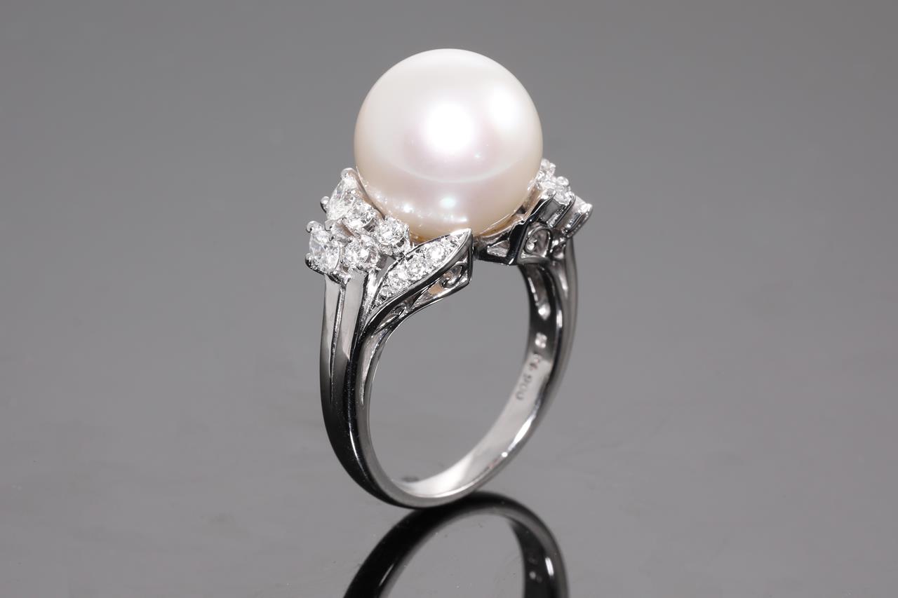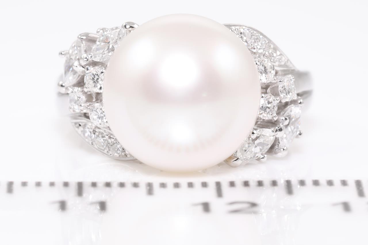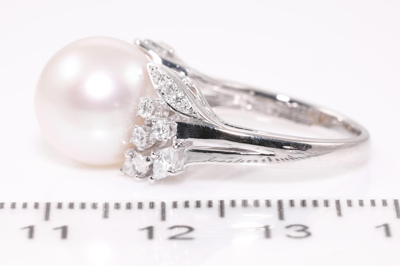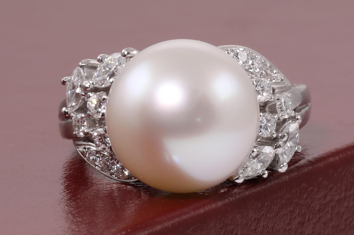 Mikimoto Pearl and Diamond ring with Pearl of 11.5mm with round and marquise cut Diamonds totalling 0.48cts (Estimated grading: G-H VS-SI). Platinum. Ring size: J. Weight: 8.7g (Pre-owned)