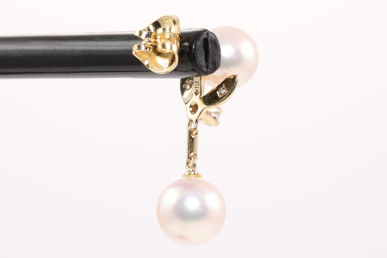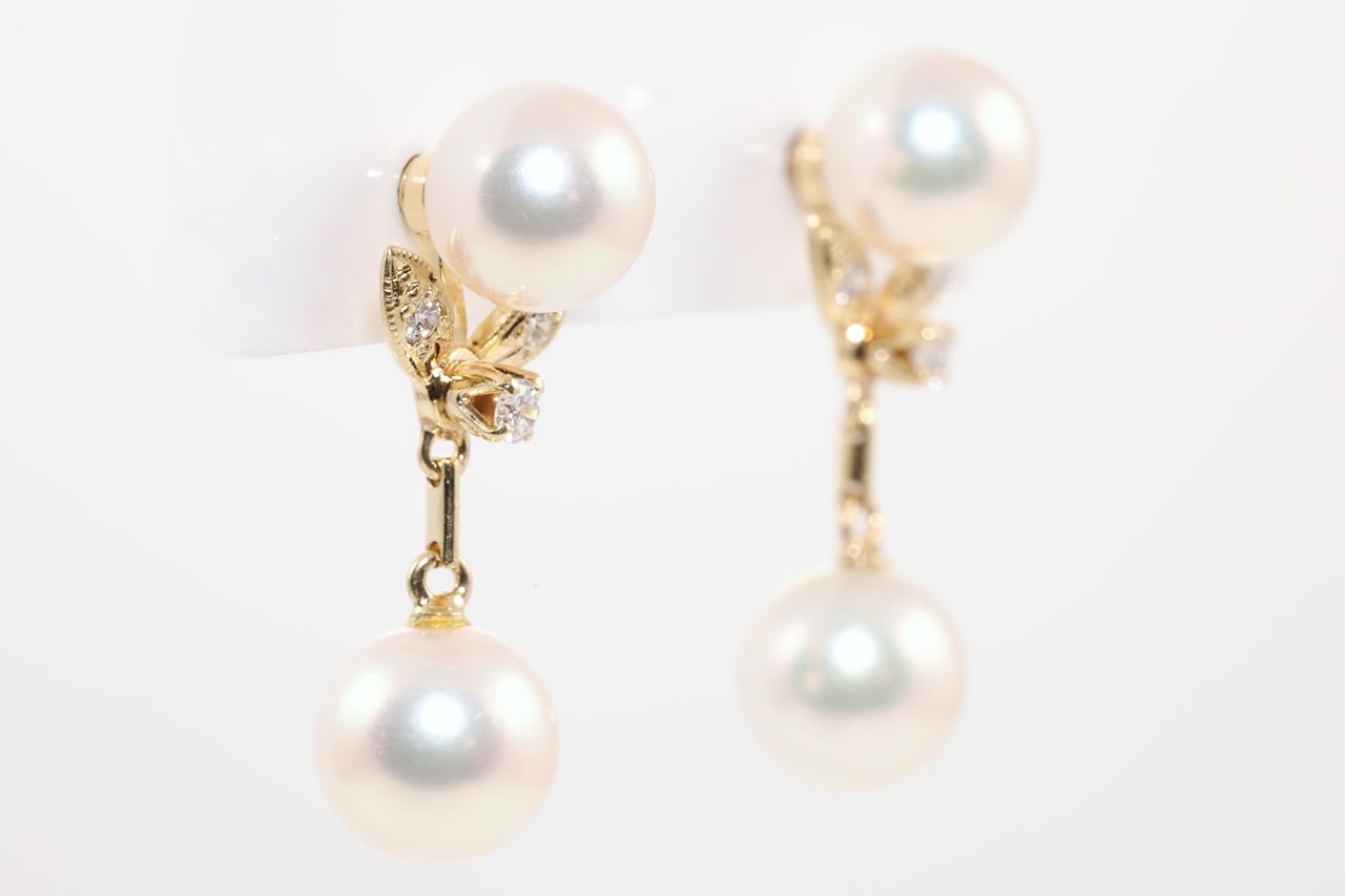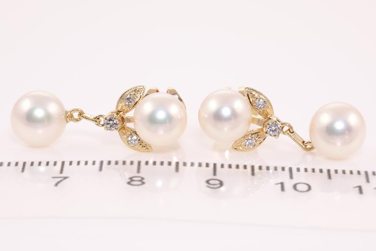 Mikimoto Pearl and Diamond earrings with Akoya pearls of 7.0mm-7.5mm and Diamonds totalling approximately 0.16cts. 14ct yellow gold. Weight: 4g. Note one butterfly engraved Tasaki. (Pre-owned)