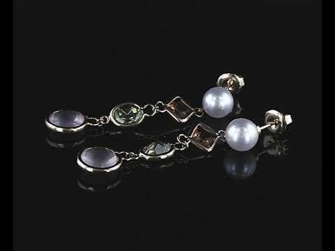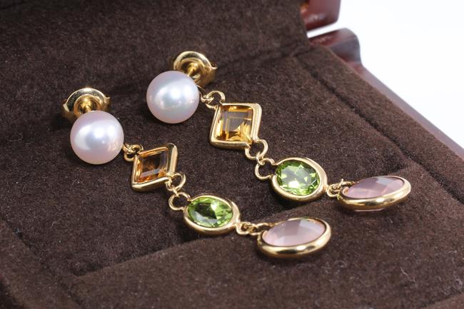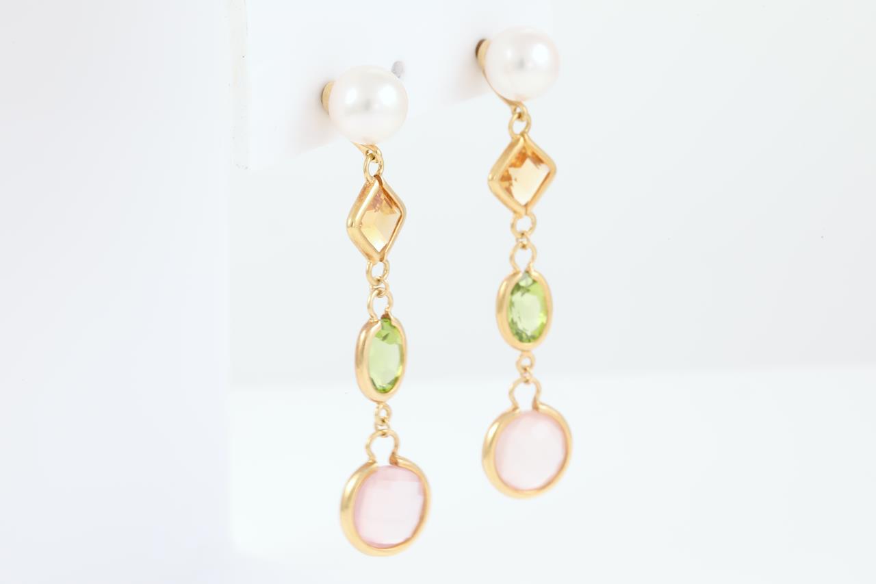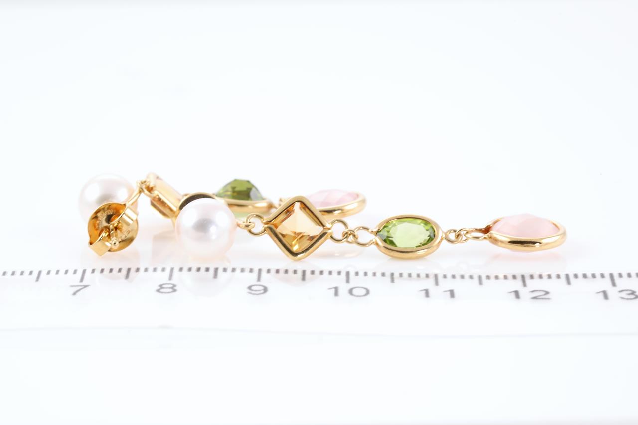 Mikimoto earrings with Akoya Pearls of 7.1mm, Rose Quartz totalling 2.62cts, Peridot totalling 1.40cts and Citrine totalling 1.00cts. 18ct yellow gold. Weight 5.6g. (Pre-owned)