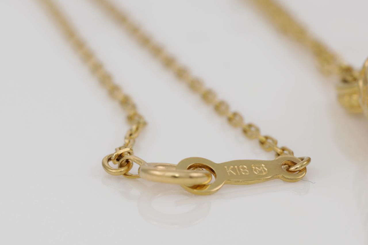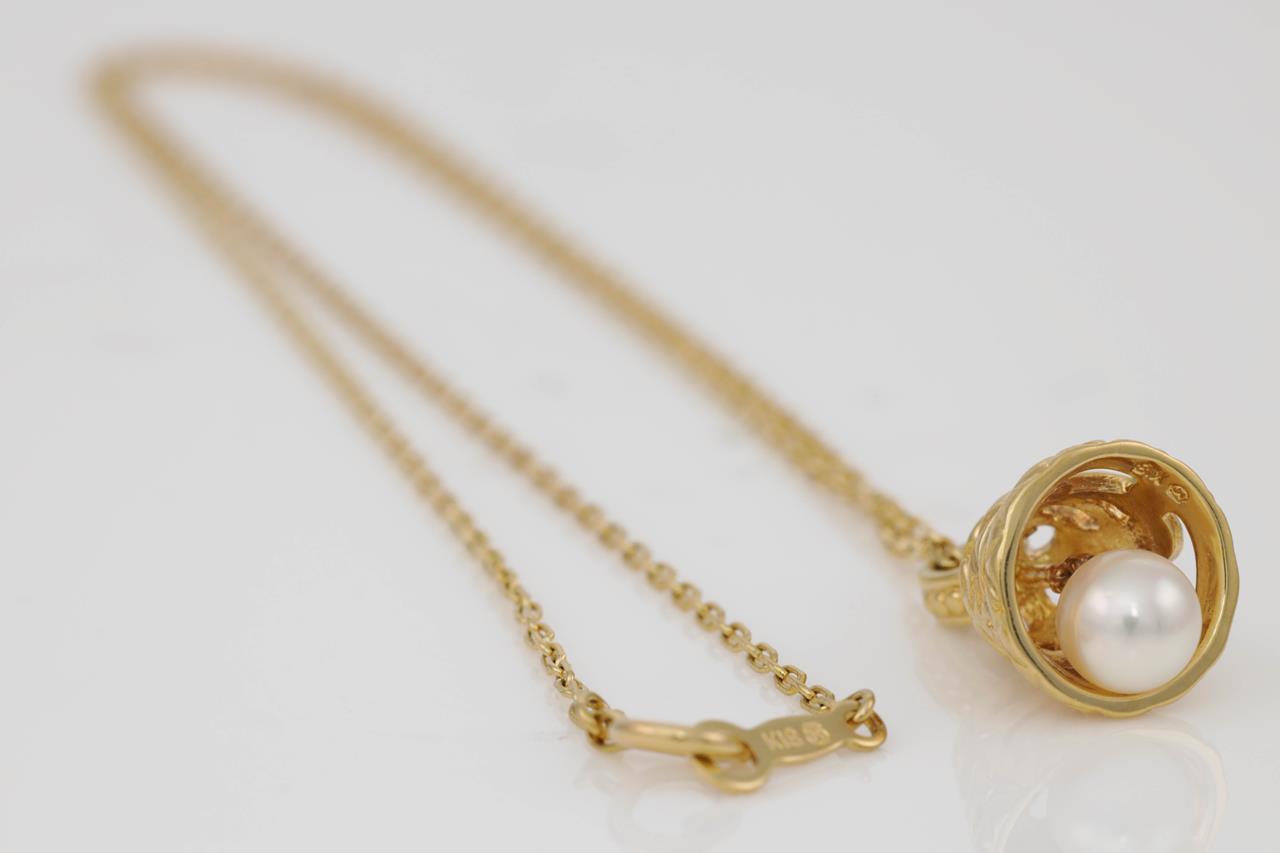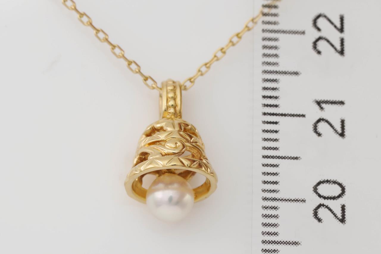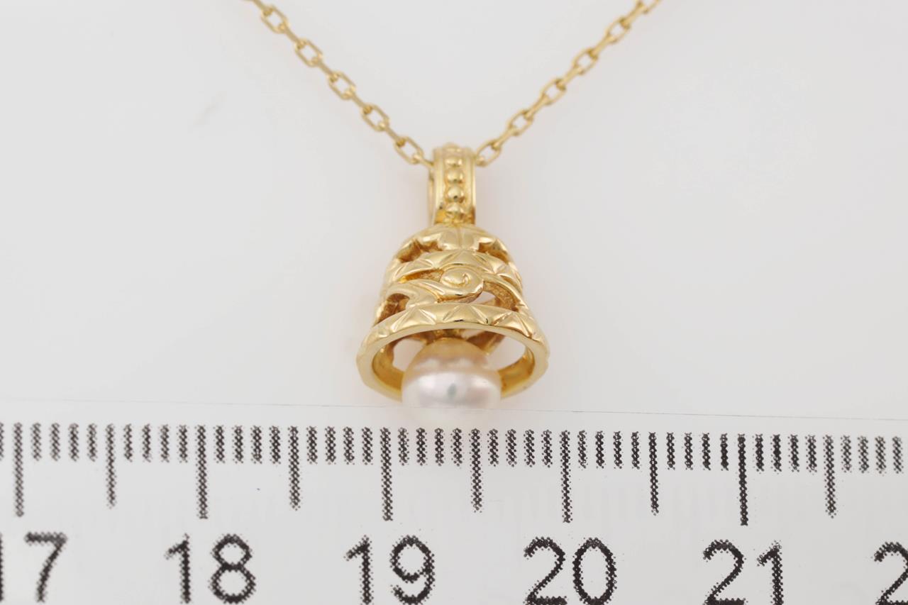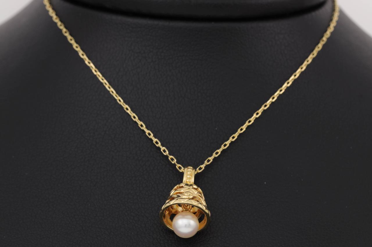 Mikimoto Pearl bell design pendant with a cultured pearl of 5.7mm. 18ct yellow gold with 40cm chain. With Mikimoto box. (Pre-owned)
