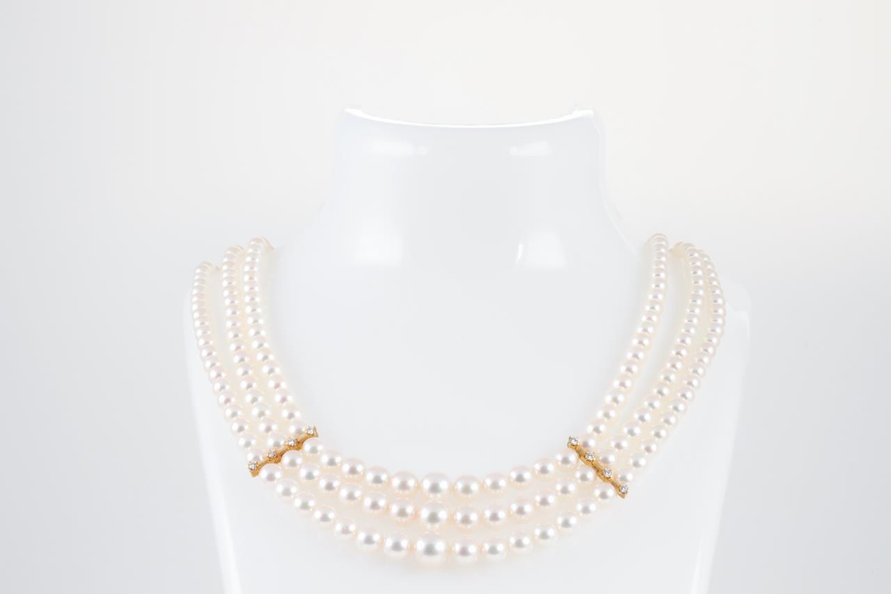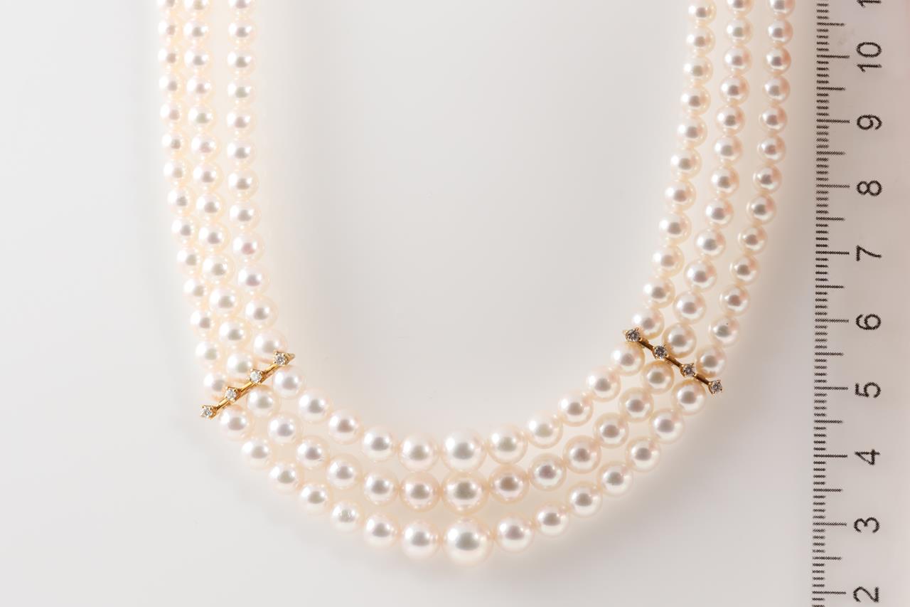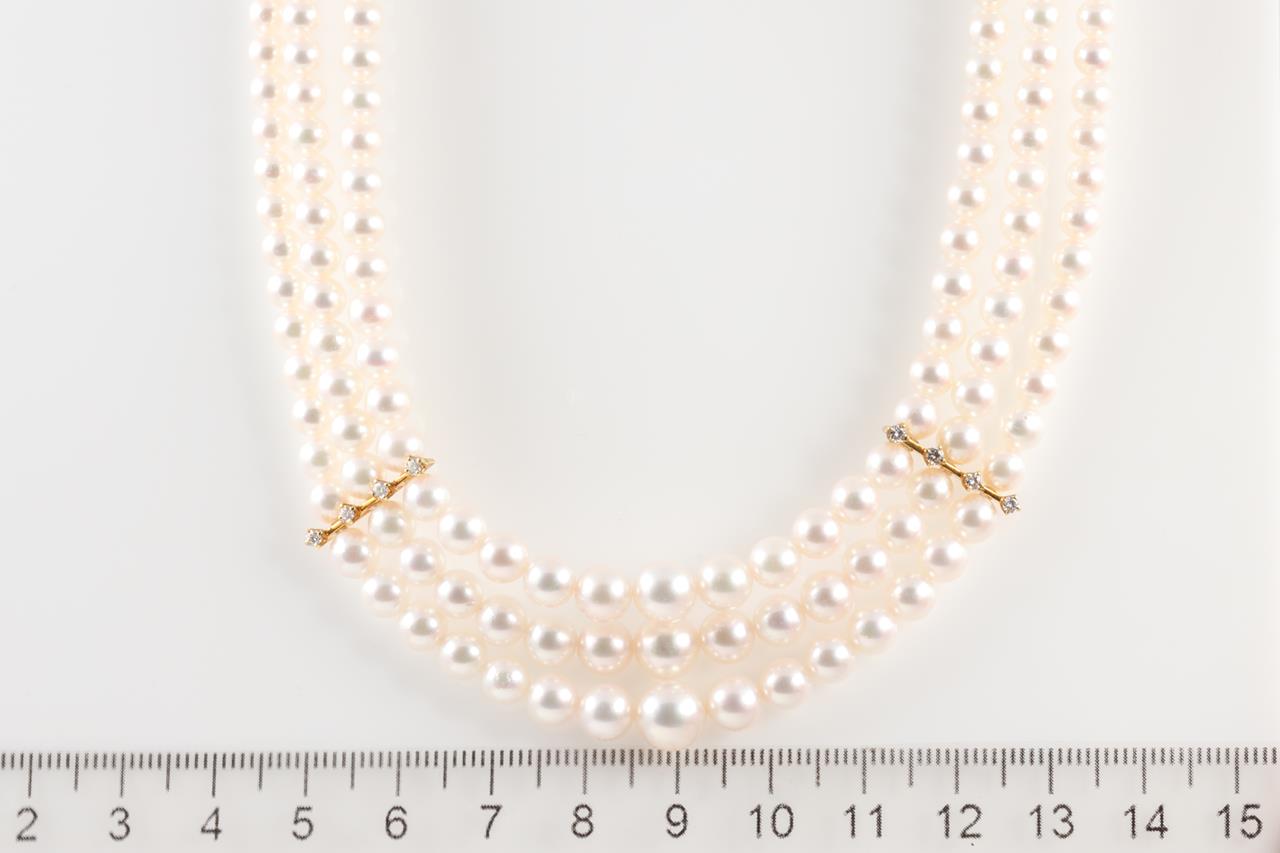 Mikimoto three strand necklace with graduated Akoya pearls of 3.5mm-7.6mm and Diamonds totalling 0.16cts (Estimated grading: G VS). 18ct yellow gold. Length: 40cm. Weight: 40.6g. With Mikimoto case and certificate #413970. (As New)