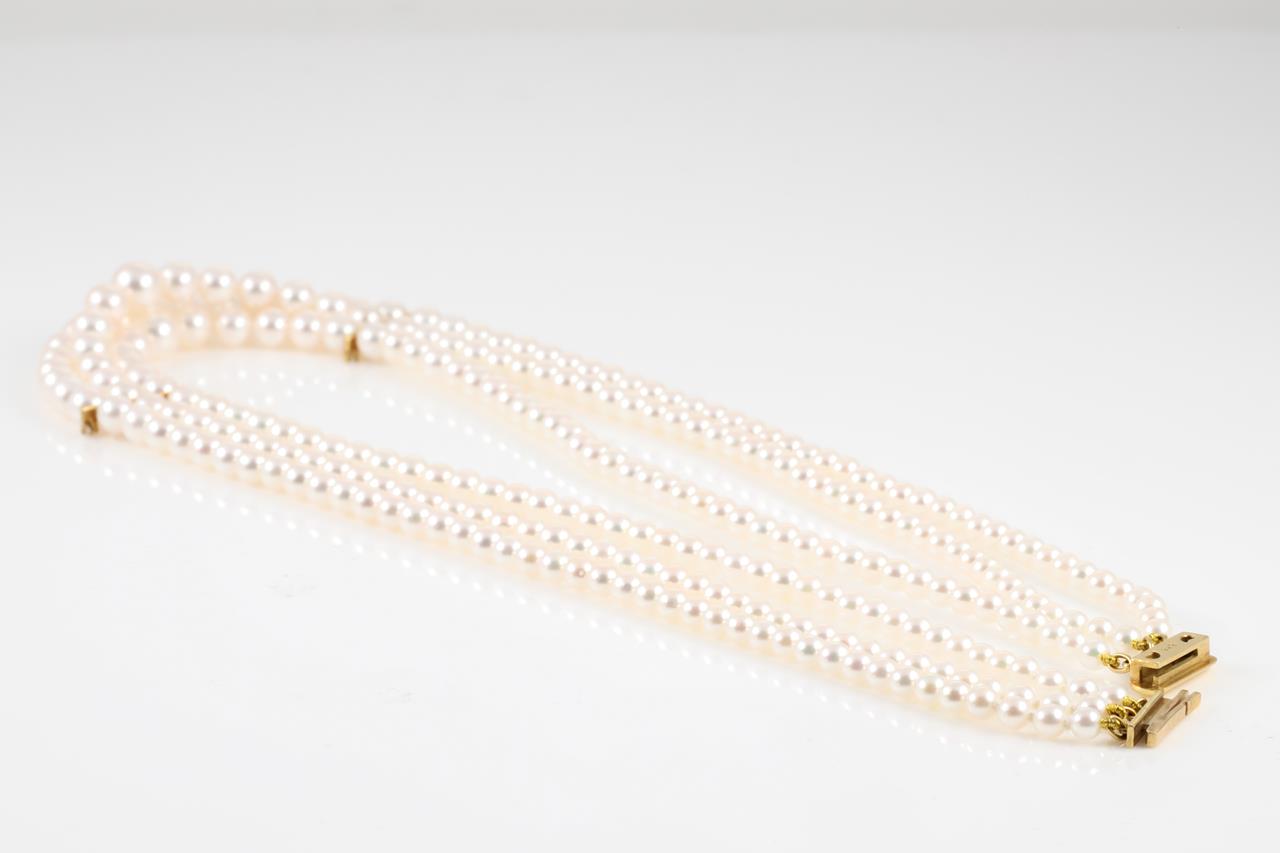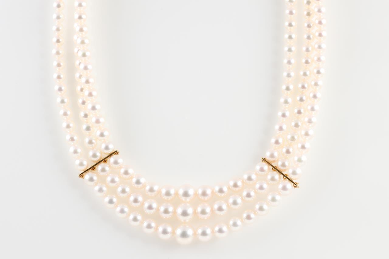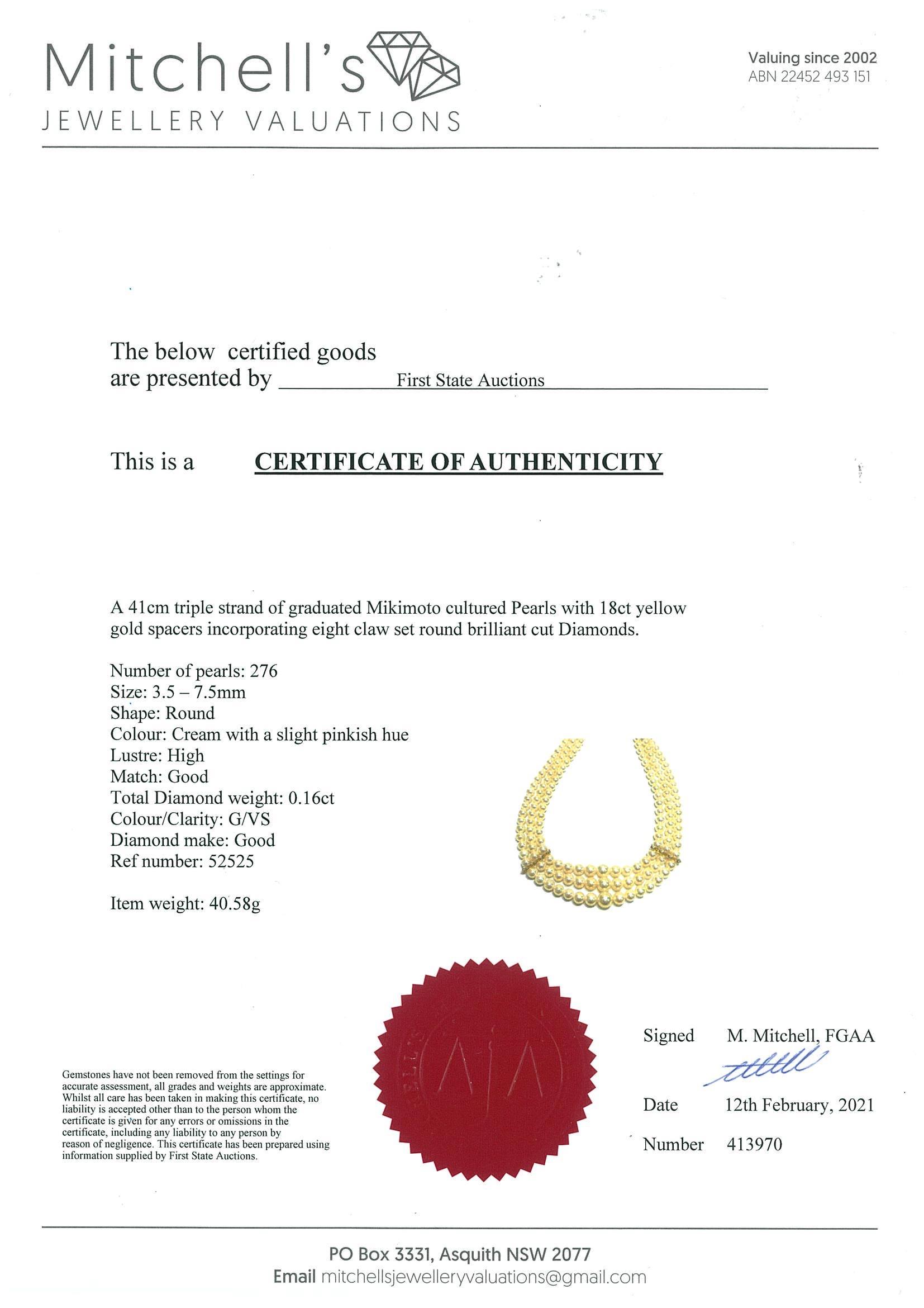 Mikimoto three strand necklace with graduated Akoya pearls of 3.5mm-7.6mm and Diamonds totalling 0.16cts (Estimated grading: G VS). 18ct yellow gold. Length: 40cm. Weight: 40.6g. With Mikimoto case and certificate #413970. (As New)