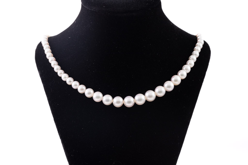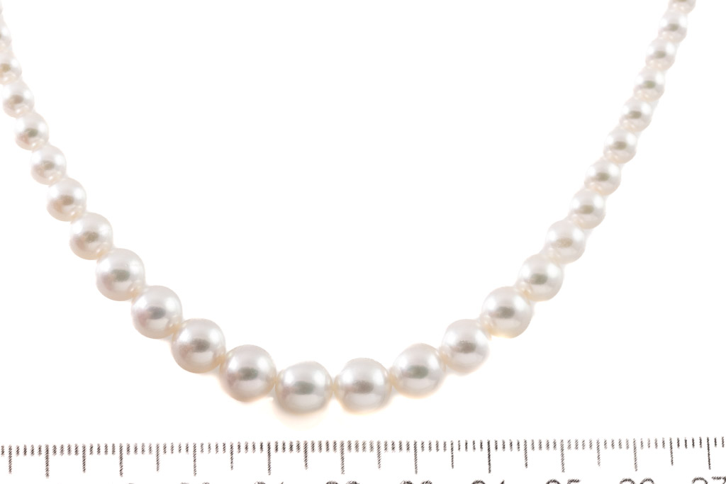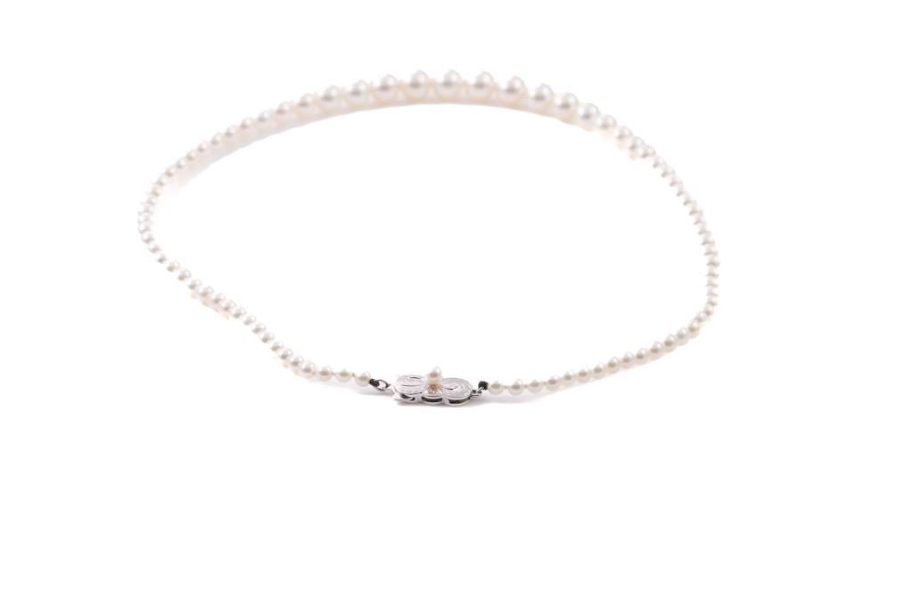 Mikimoto Pearl necklace with Pearls of 7.8mm - 3.6mm. With silver clasp. Length: 40cm. Weight: 17.5g. With Mikimoto box. (Pre-owned)