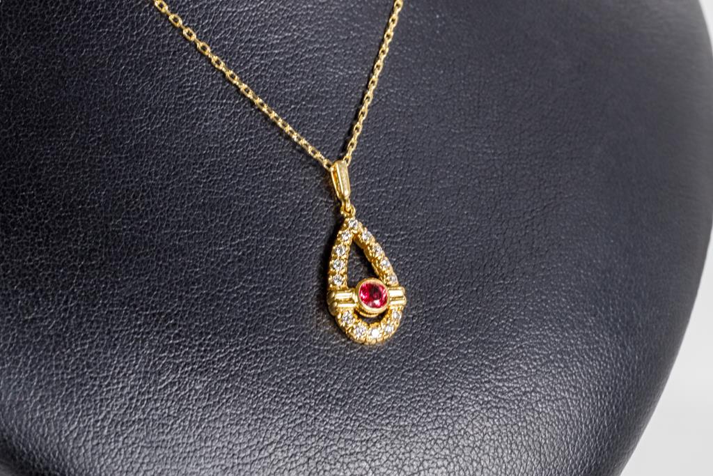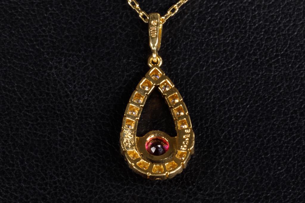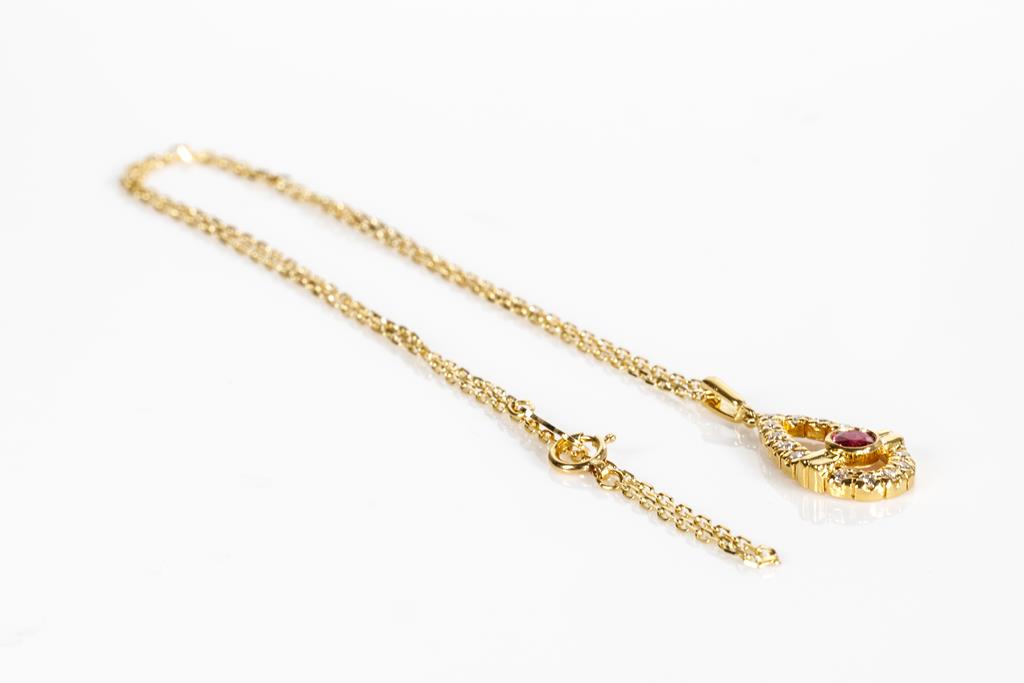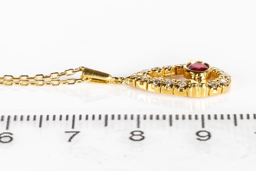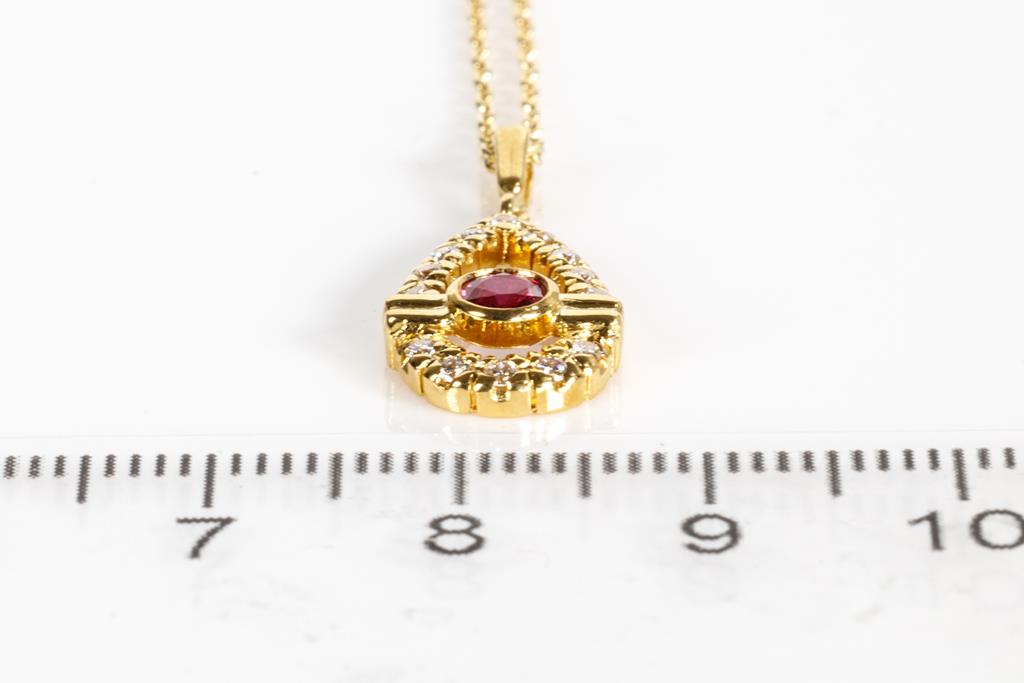 Mikimoto Ruby and Diamond pendant with a round Ruby of 0.22ct and round Diamonds totalling 0.18cts. 18ct yellow gold with 18ct yellow gold Mikimoto chain. Length: 40cm. Weight: 3.4g. (Pre-owned)