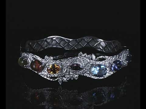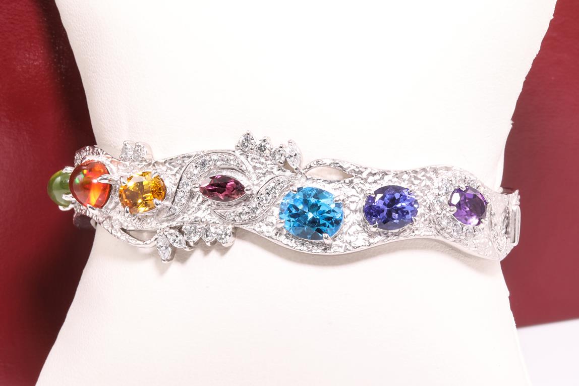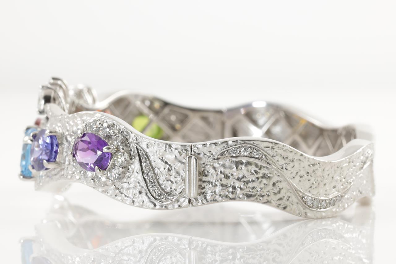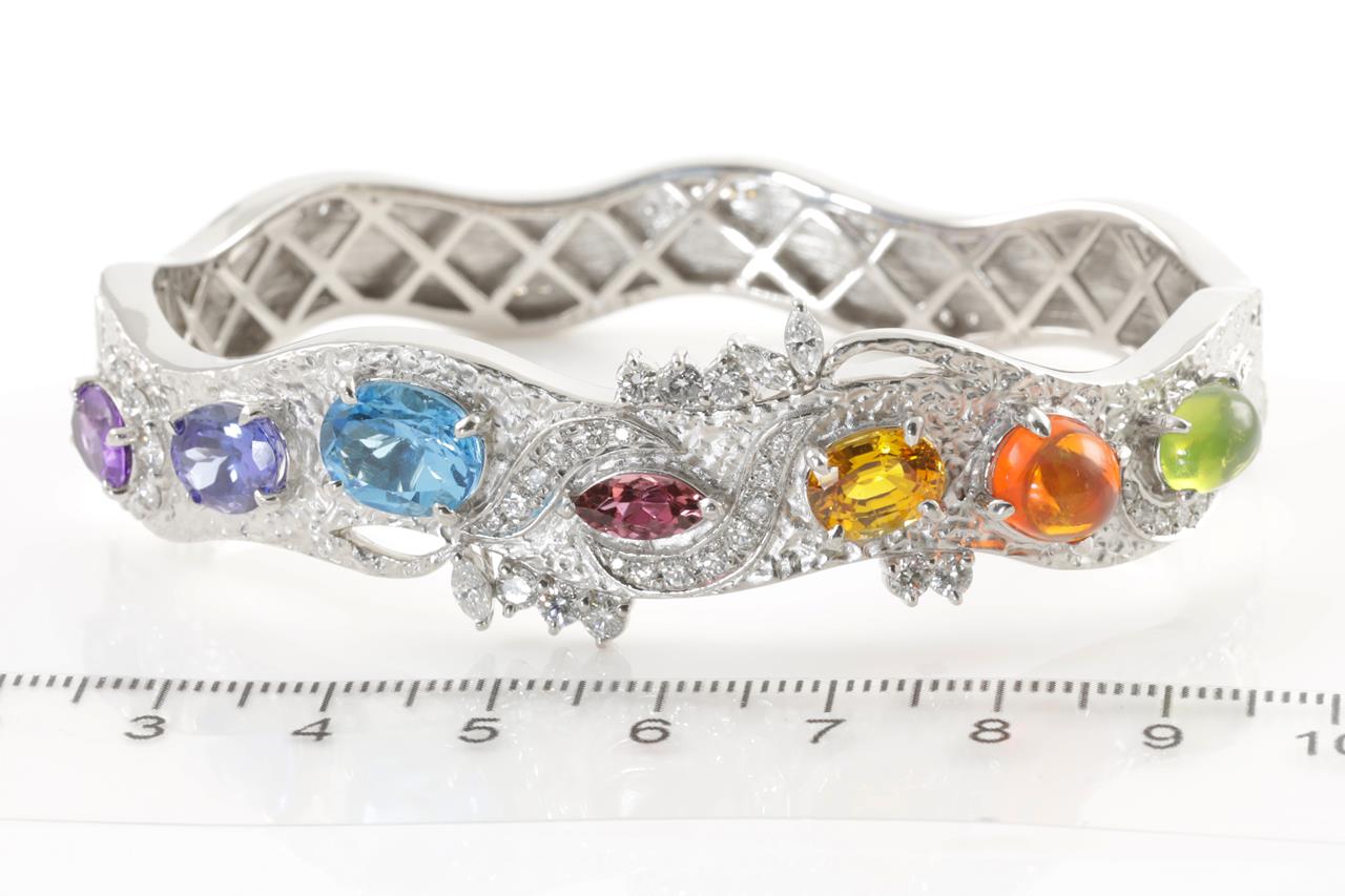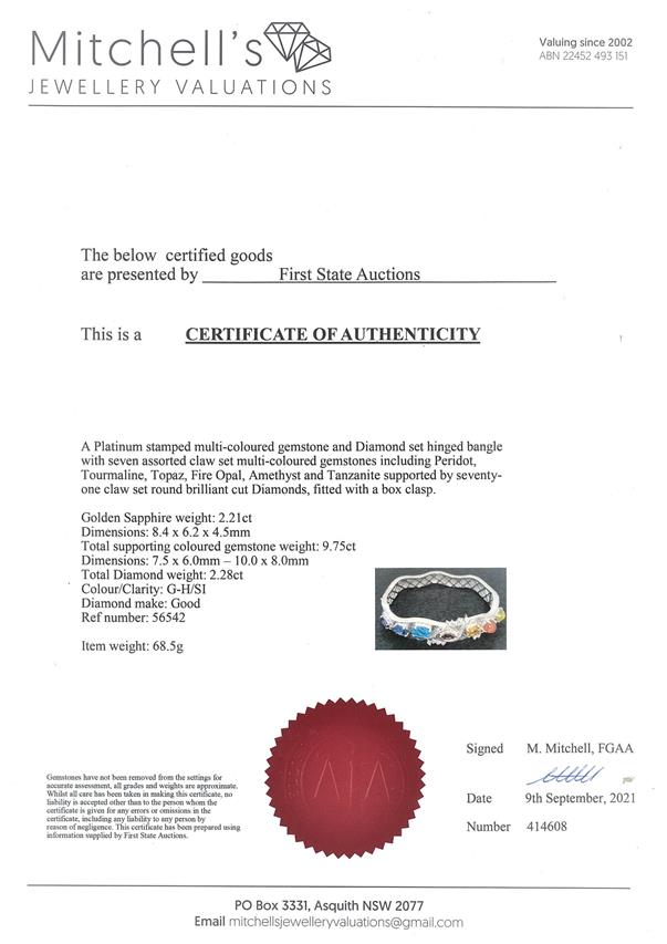 Bangle with a golden Sapphire of 2.21ct, Amethyst, Peridot, Tourmaline, Topaz, Tanzanite and Fire Opal totalling 9.75cts. Diamonds totalling 2.28cts (Estimated grading: G-H SI). Platinum. Circumference: 18cm. Weight: 68.5g. With certificate #414608. (Pre-owned)