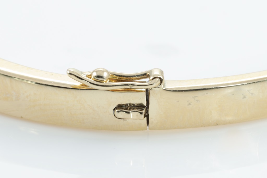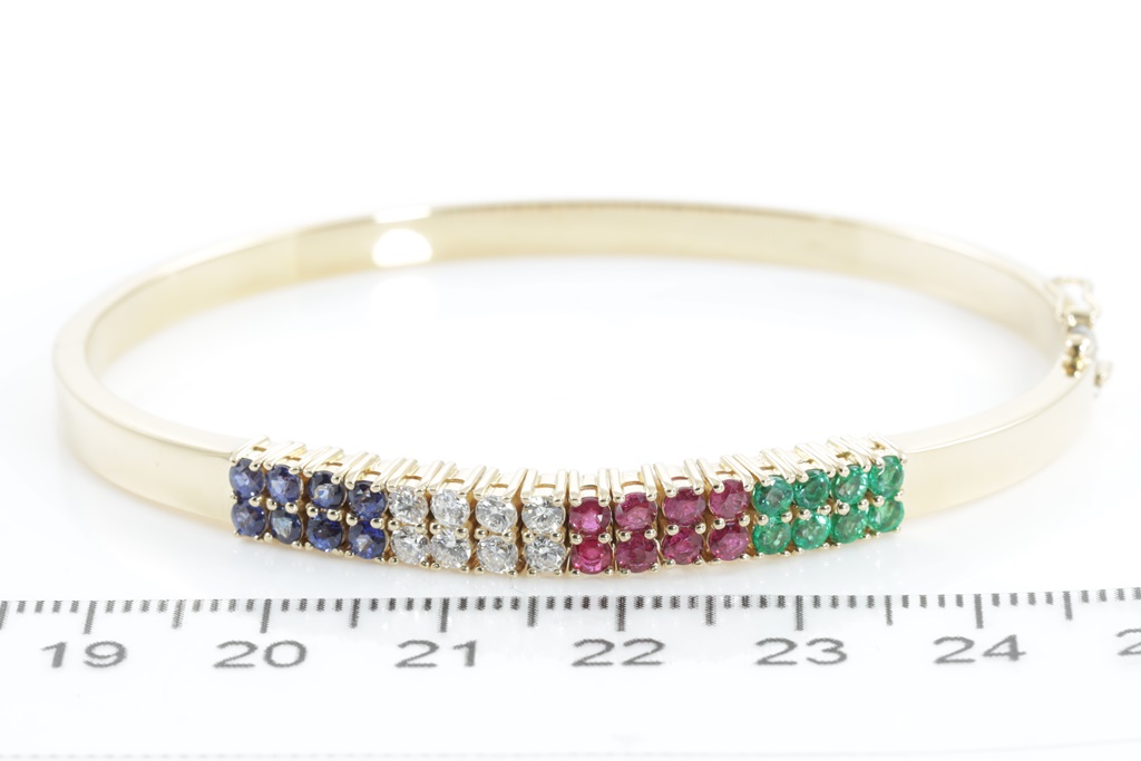 Mixed gemstone and Diamond bangle with round Emeralds totalling 0.50cts, Rubies totalling 0.58cts, blue Sapphires totalling 0.59cts & Diamonds totalling 0.42cts (Estimated grading: H-I SI). 18ct yellow gold. Circumference 16.5cm. Weight: 22g. (Pre-owned)