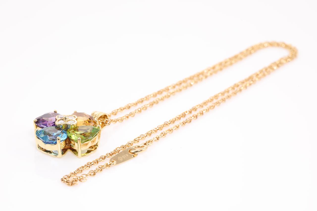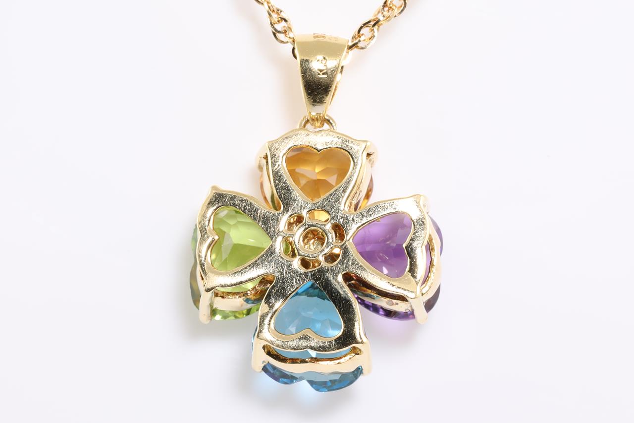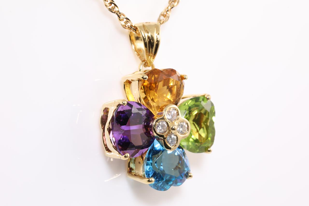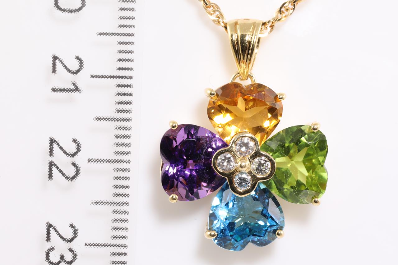 Mixed gemstone and Diamond pendant with heart shape Citrine, Amethyst, Peridot & Topaz totalling 10.00cts and Diamonds totalling 0.20cts. 18ct yellow gold with 45cm chain. Weight: 10.8g (Pre-owned)
