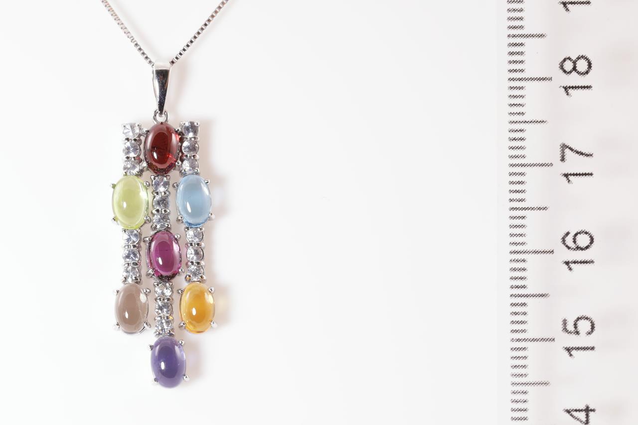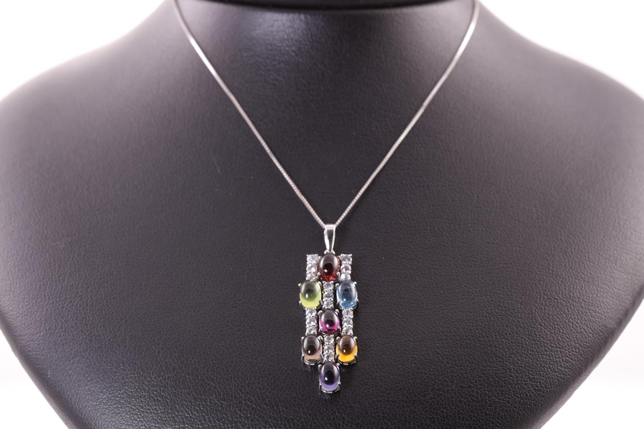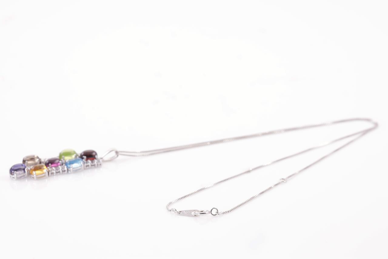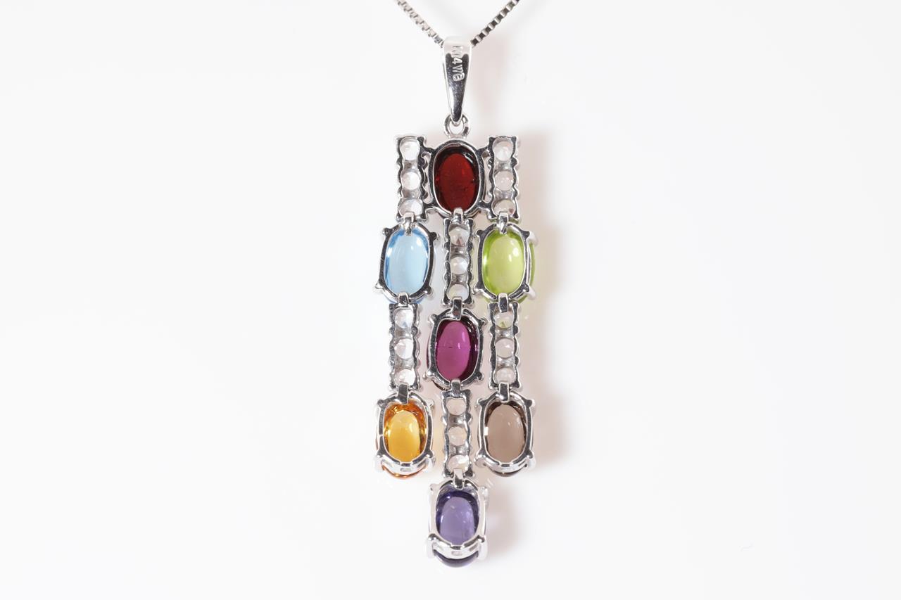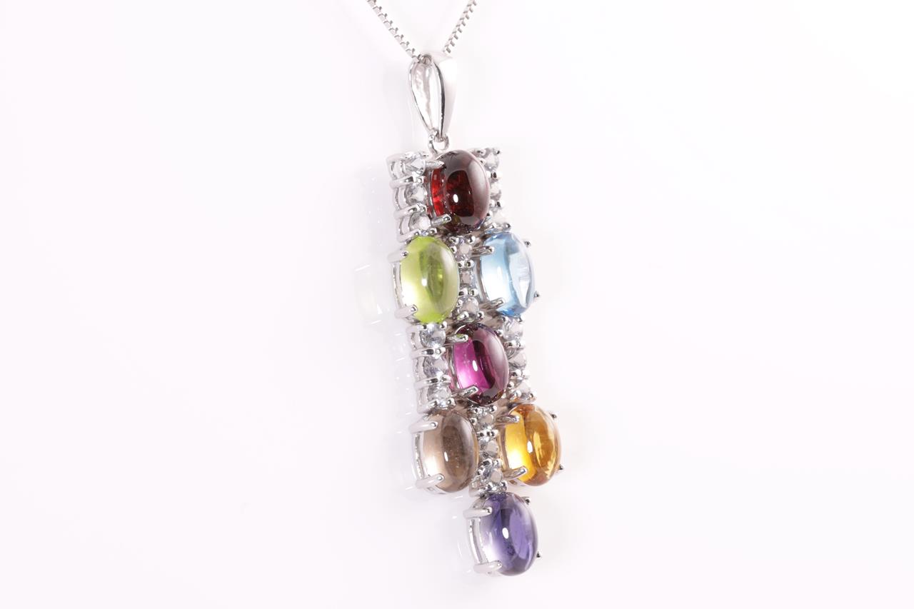 Mixed gemstone pendant with round white topaz of 2mm and oval cabochon cut Citrine, Peridot, Topaz, red Garnet, Amethyst, Smokey Quartz and pink Tourmaline (6mm x 4mm). 14ct white gold with adjustable 42cm chain. Weight: 4g. (Pre-owned)