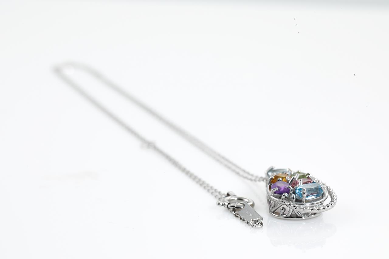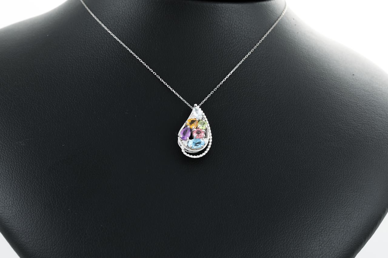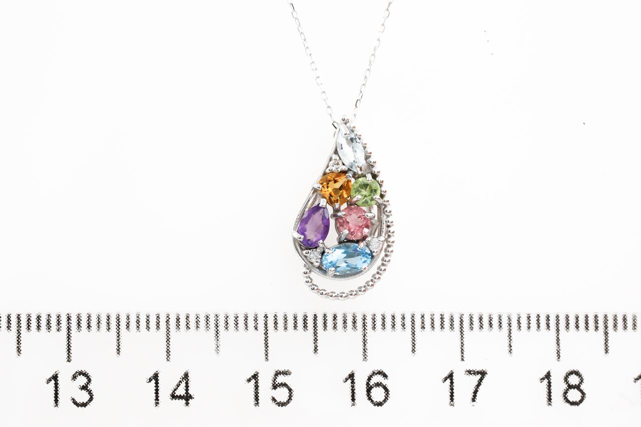 Mixed gemstone and Diamond pendant with mixed shape Topaz, Amethyst, Citrine, pink Tourmaline, Aquamarine & Peridot totalling 1.03cts and Diamonds totalling 0.03cts. 18ct white gold with adjustable 40cm chain. Weight: 2.2g. (Pre-owned)