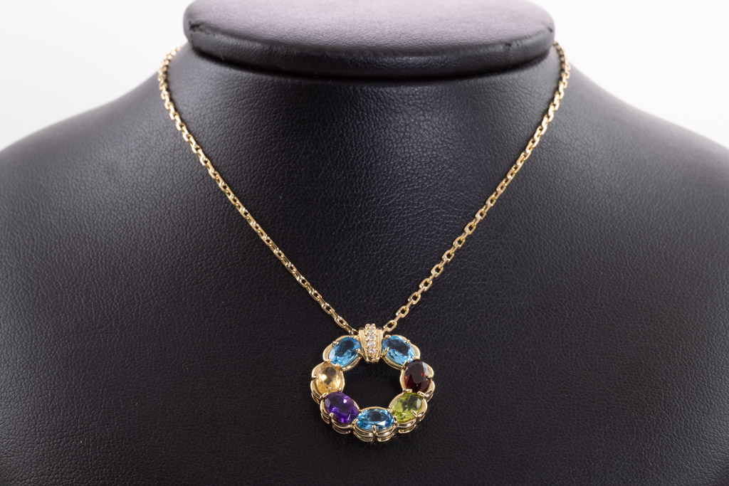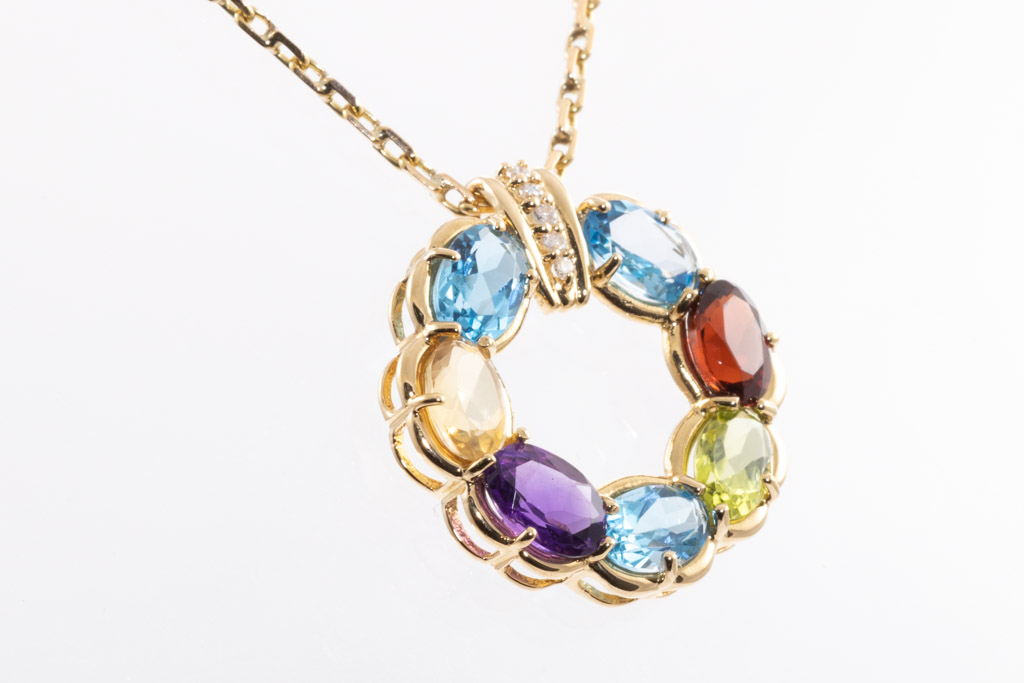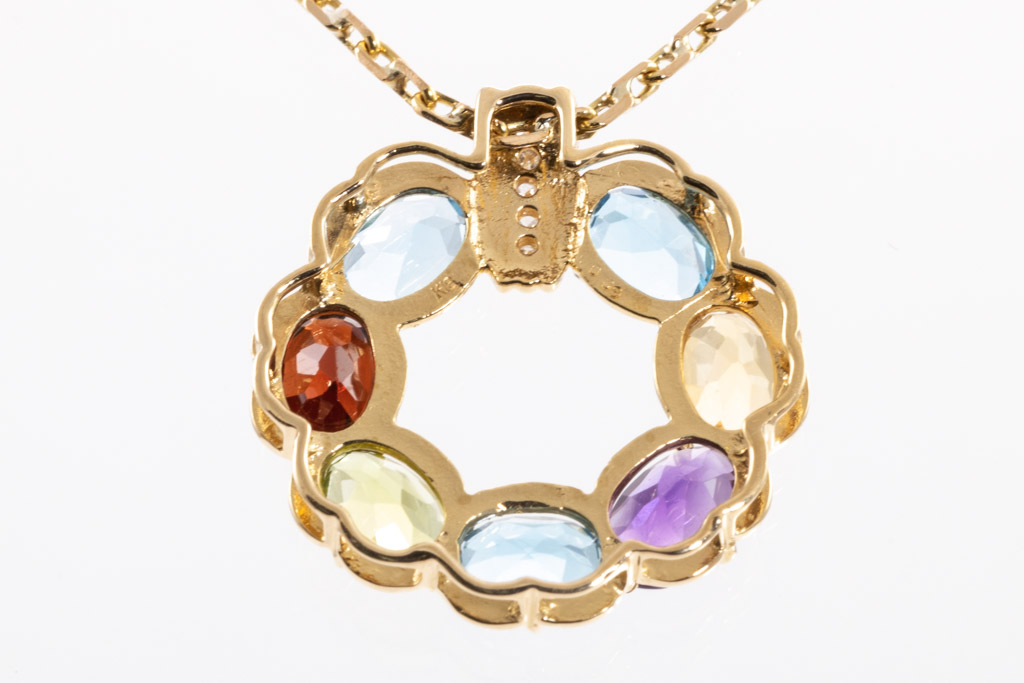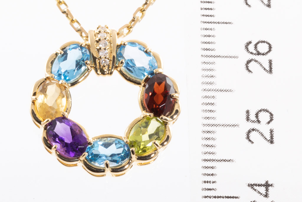 Mixed Gemstones and Diamond pendant with 7 oval shape Topaz, Amethyst, Citrine, Garnet and Peridot totalling approximately c2.75ts and Diamonds totalling 0.03cts. 18ct yellow gold with 42cm 18ct yellow gold chain. Weight: 6.4g. (Pre-owned)