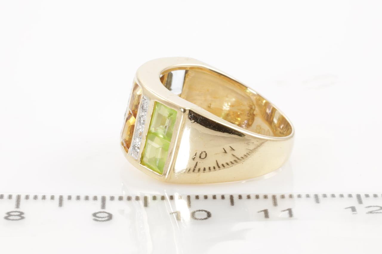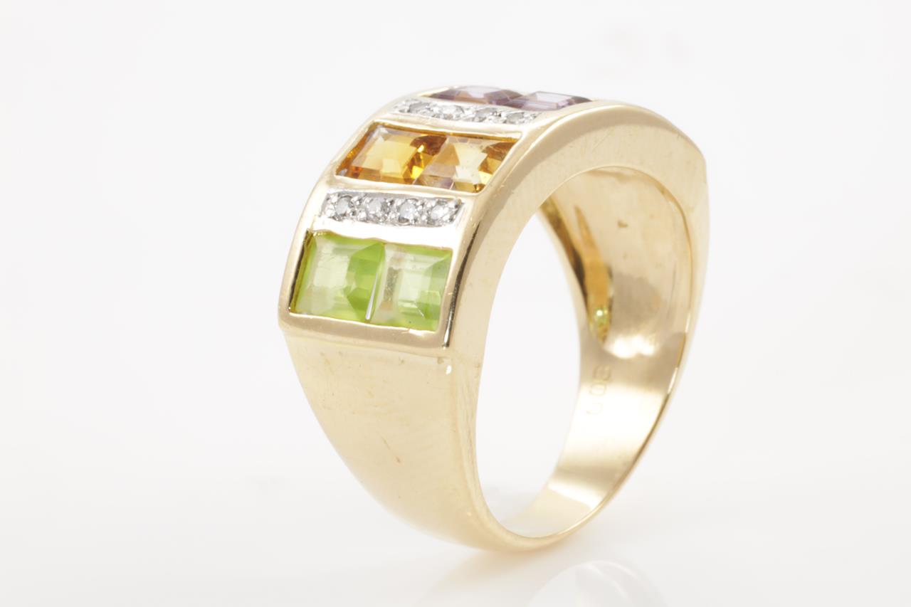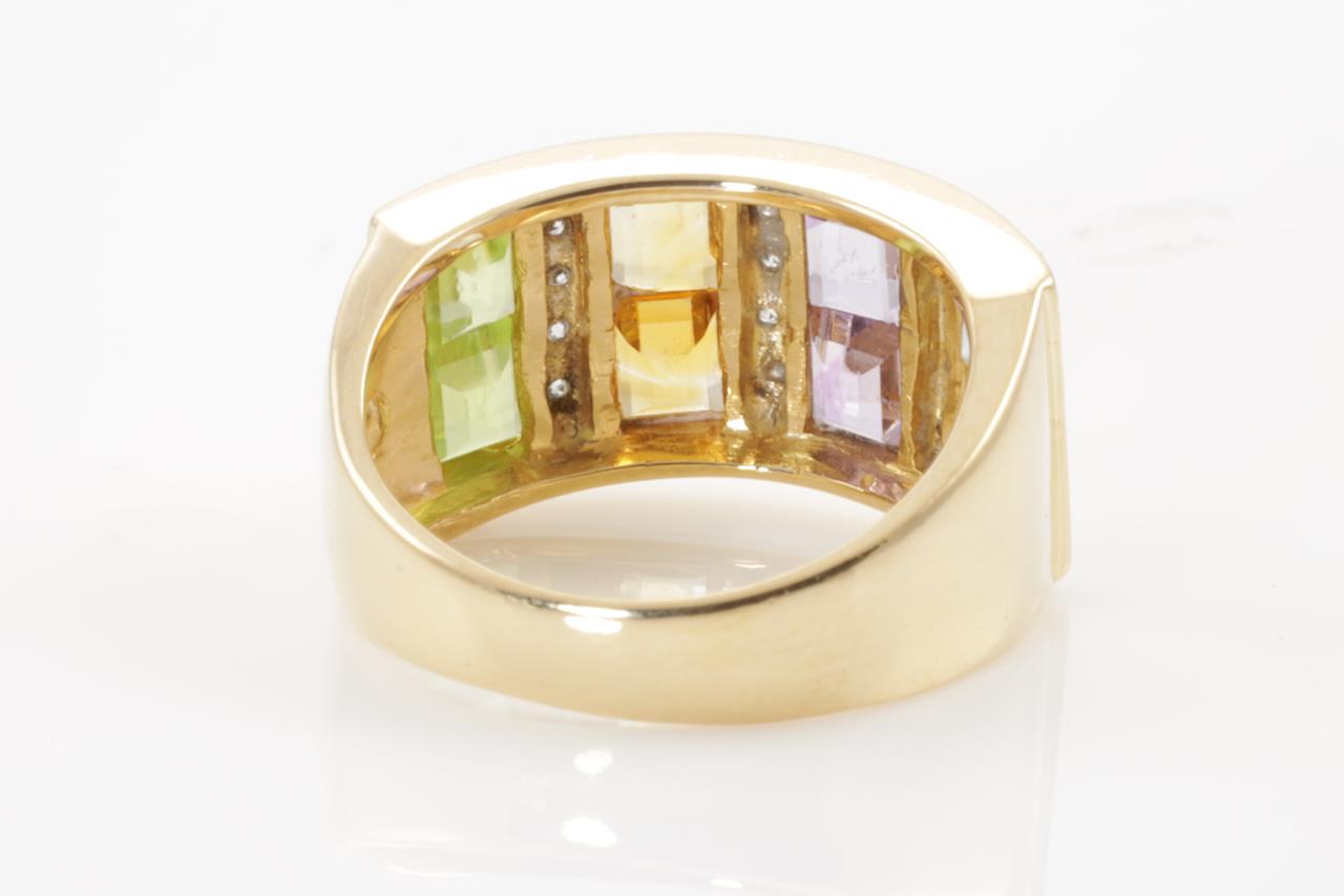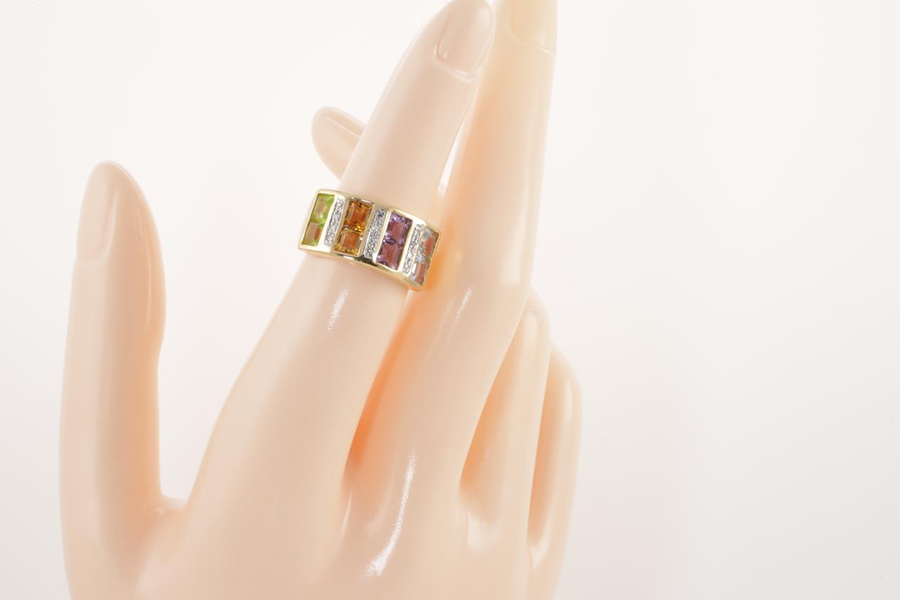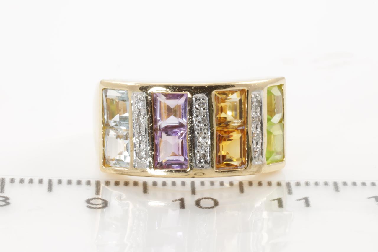 Mixed Gemstones and Diamond ring with Aquamarine, Amethyst, Citrine & Peridot and 12 Diamonds totalling 0.08cts. 18ct yellow gold and platinum. Ring size K. Weight: 6.4g (Pre-owned)