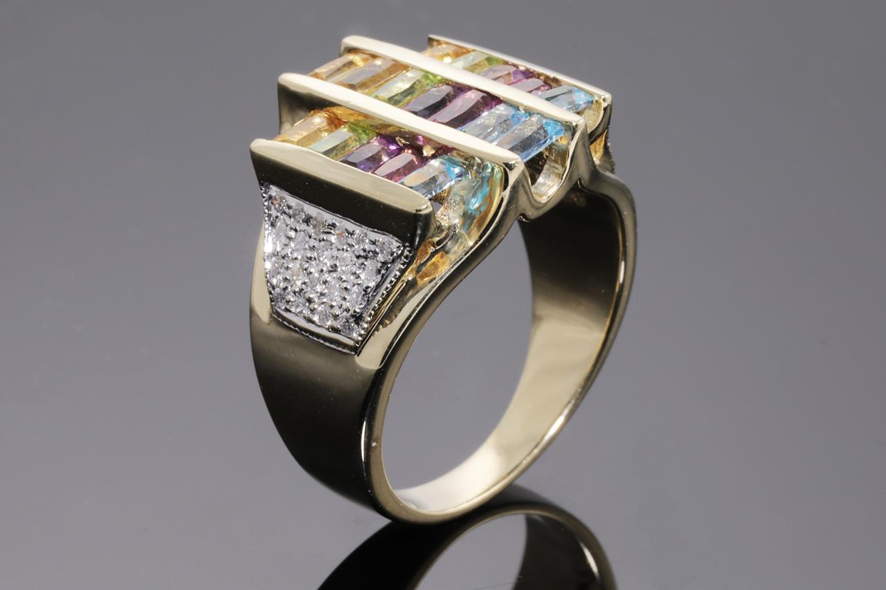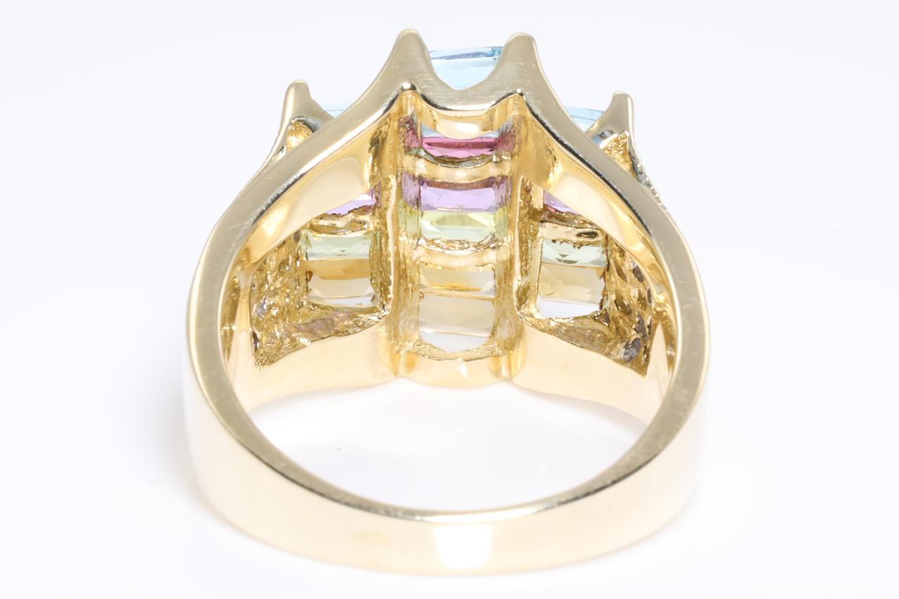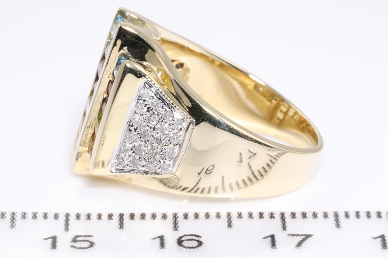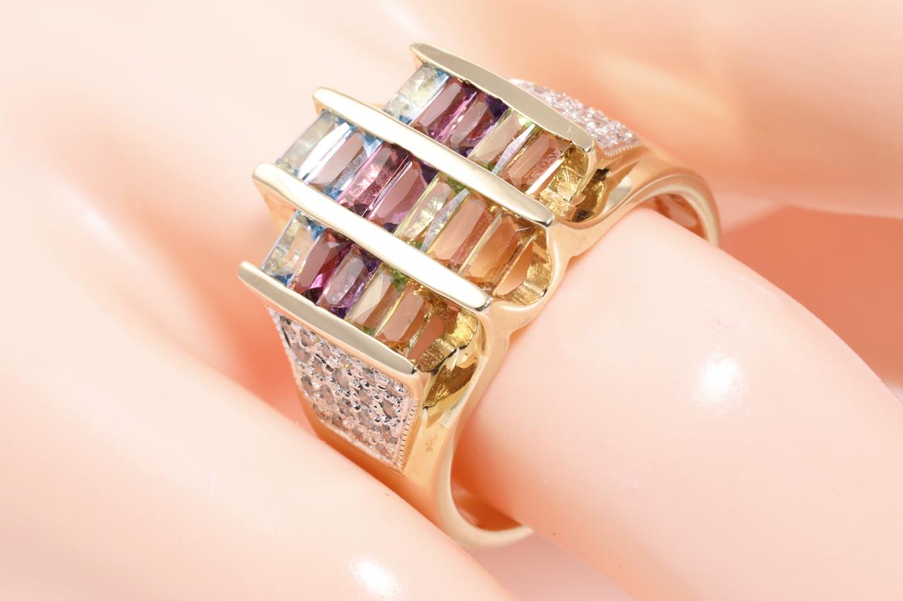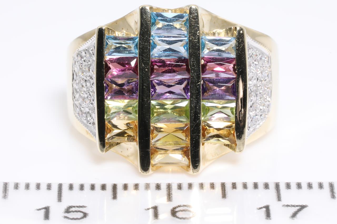Mixed Gemstone and Diamond ring with rectangular cut Topaz, Amethyst, Citrine, Peridot & Garnet totalling approximately 1.25cts and round Diamonds totalling approximately 0.25cts. 14ct yellow and white gold. Ring size N - ring resizing is not recommended. Weight 9.4g. (Pre-owned)