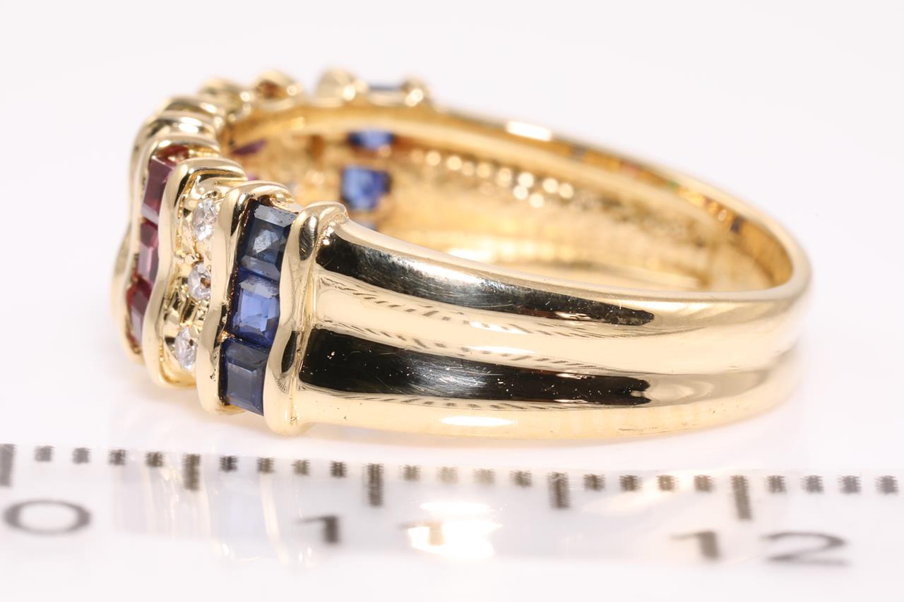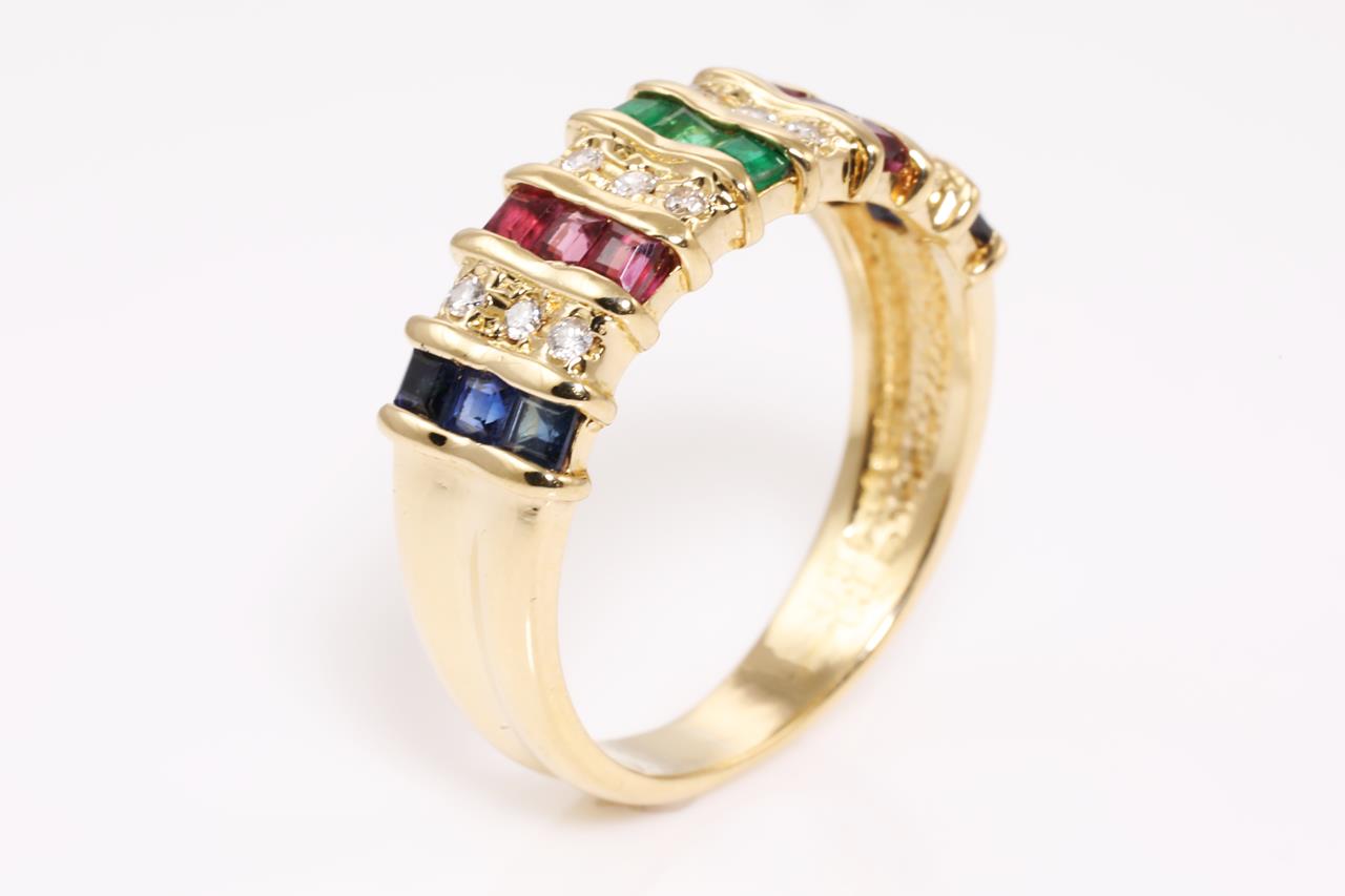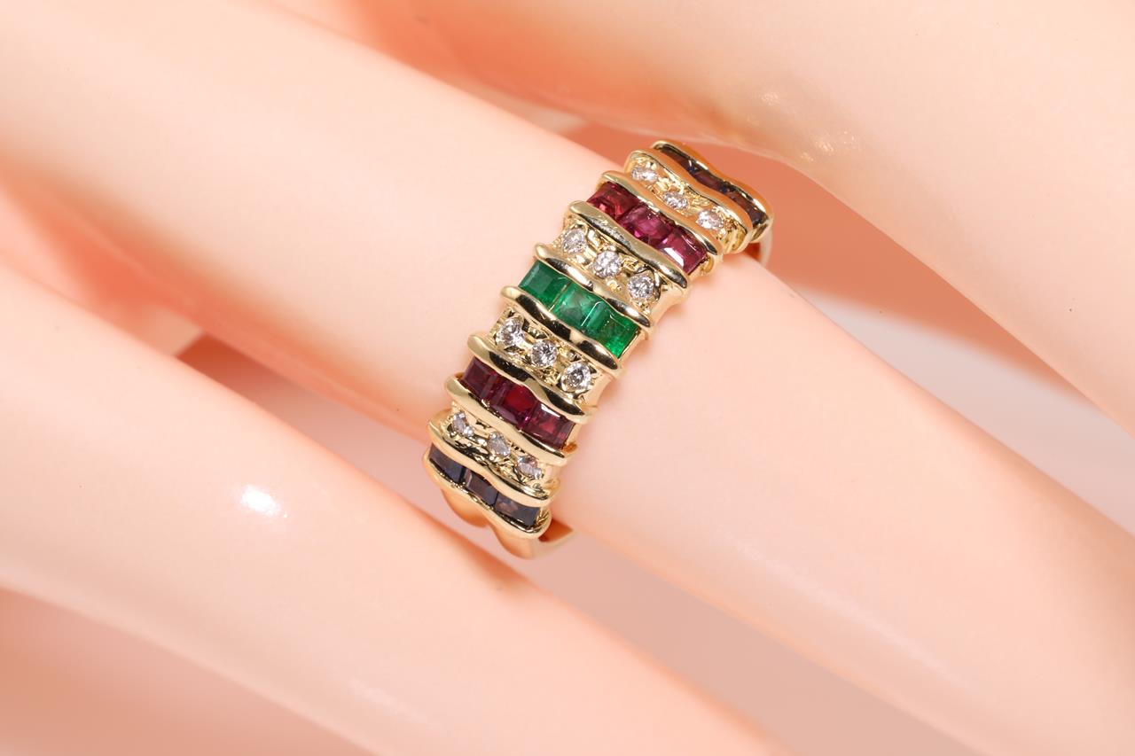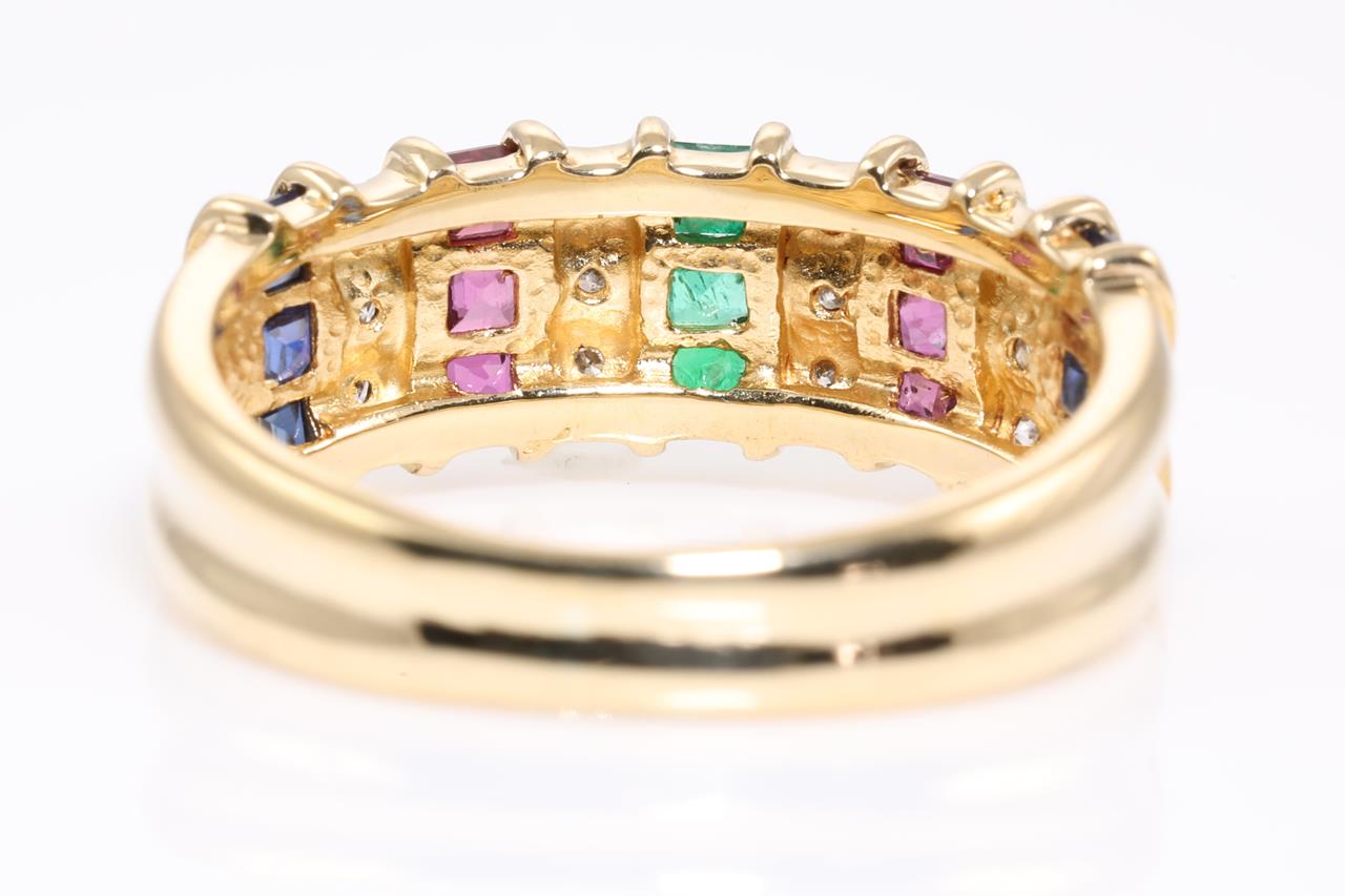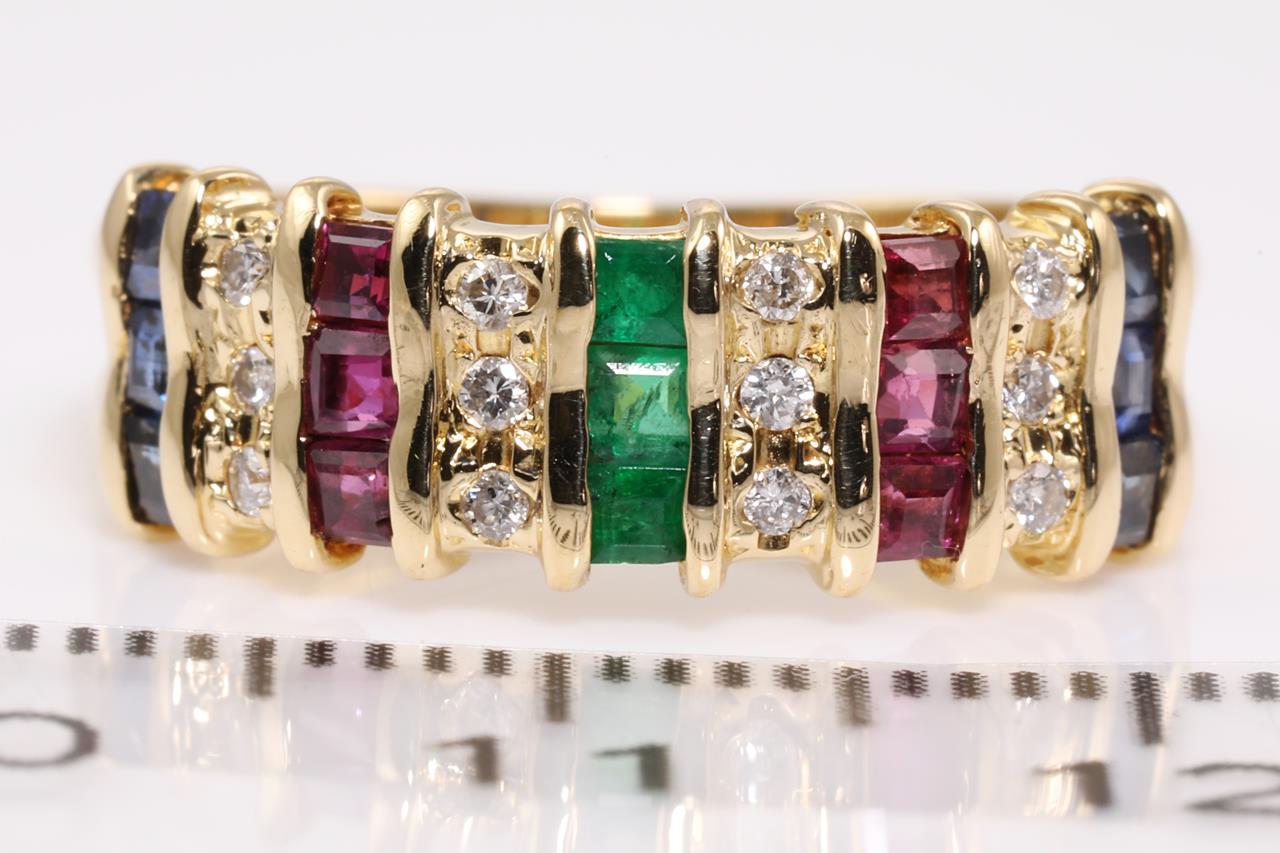 Mixed gemstone and Diamond ring with carre cut blue Sapphires, Emeralds and Rubies. Diamonds totalling approximately 0.15cts. 18ct yellow gold. Ring size L - ring resizing is not recommended. Weight: 4g. (Pre-owned)