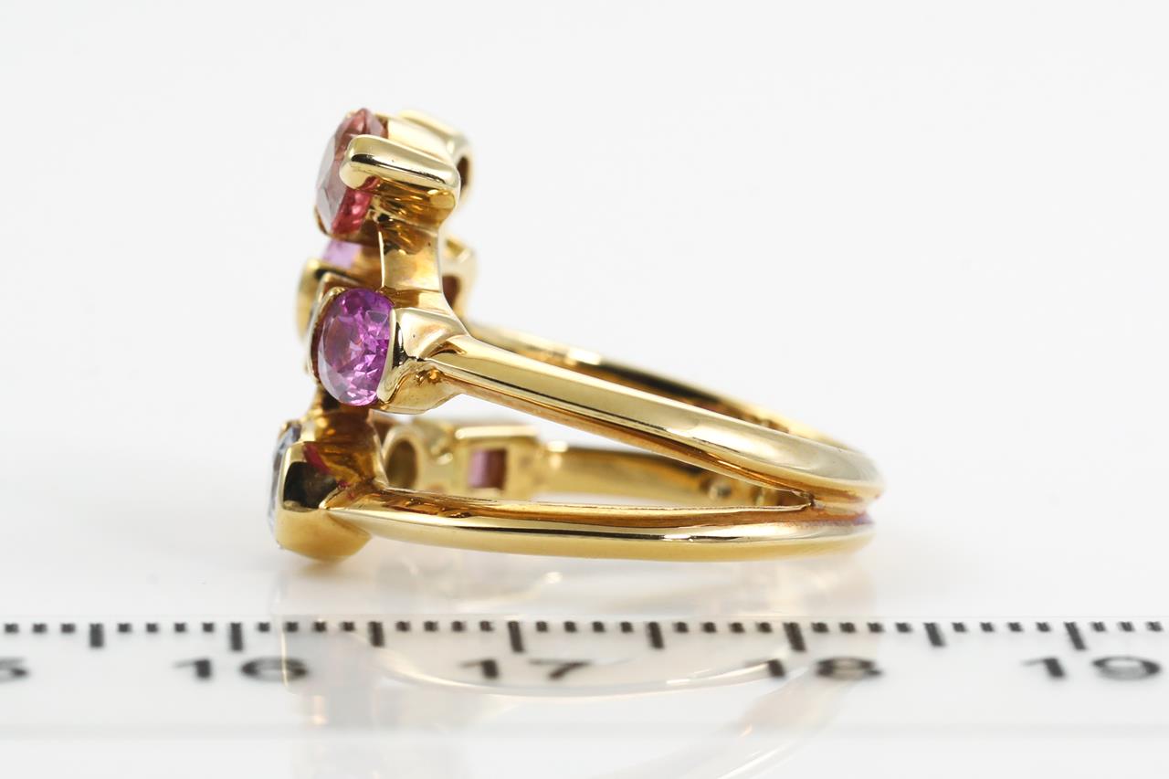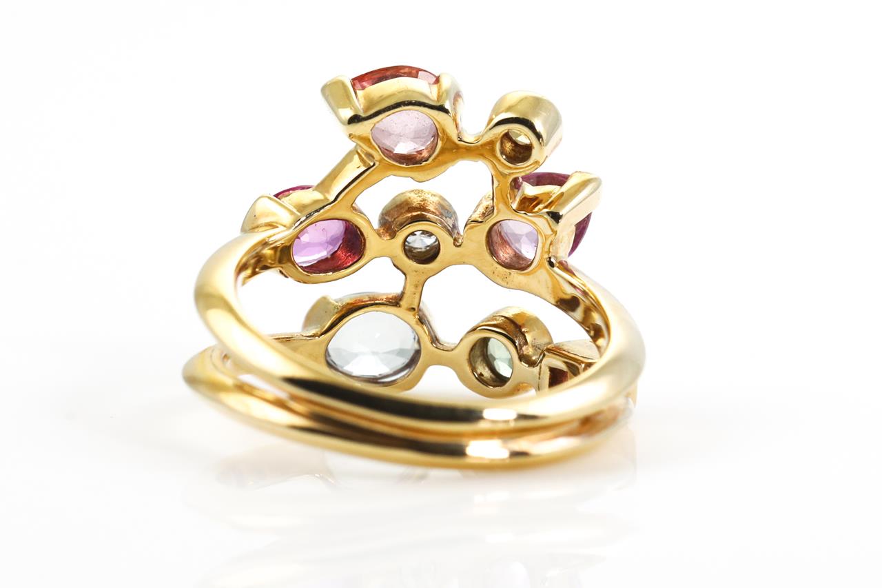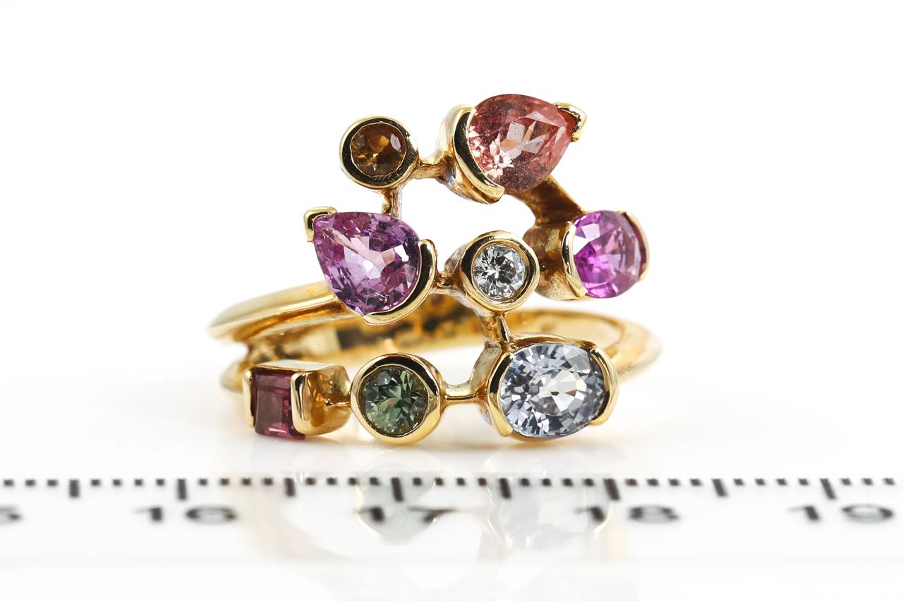 Mixed gemstone ring with mixed shapes of Topaz, pink Tourmaline, Green Amethyst, pink & yellow Sapphire and a round Diamond of approximately 0.10ct. 18ct yellow gold. Ring size: N1/2 - ring resizing is not recommended. Weight: 8.2g (Pre-owned)