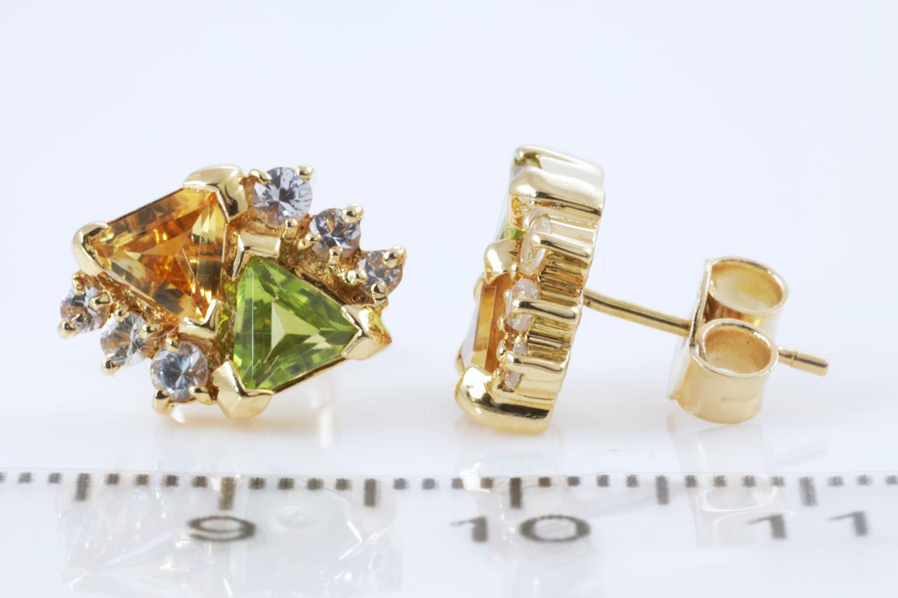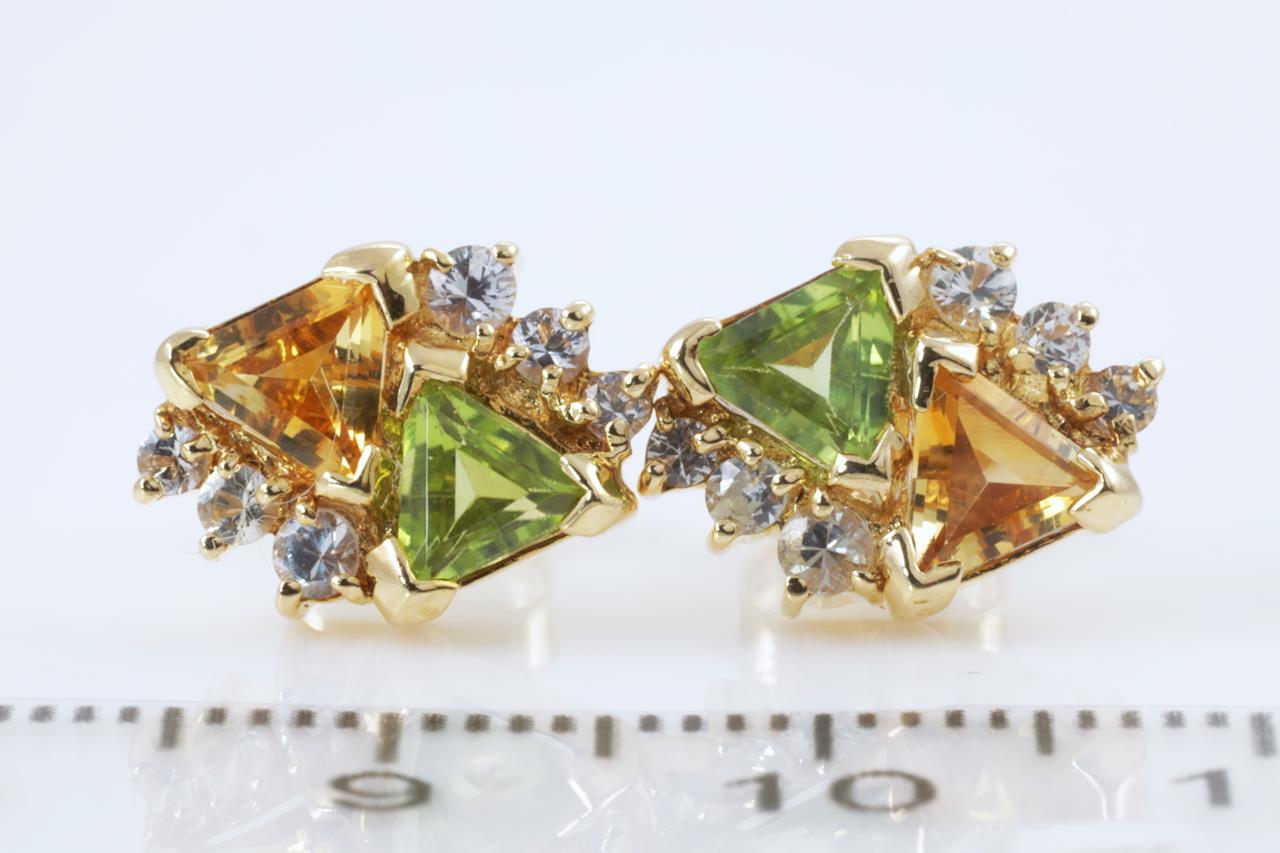 Peridot and Citrine earrings with 2 trilliant cut Peridot totalling approximately 0.76cts, 2 trilliant cut Citrine totalling approximately 0.60cts and round white Topaz. 18ct yellow gold. Weight: 3.9g (Pre-owned)
