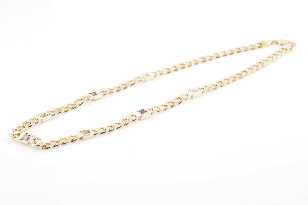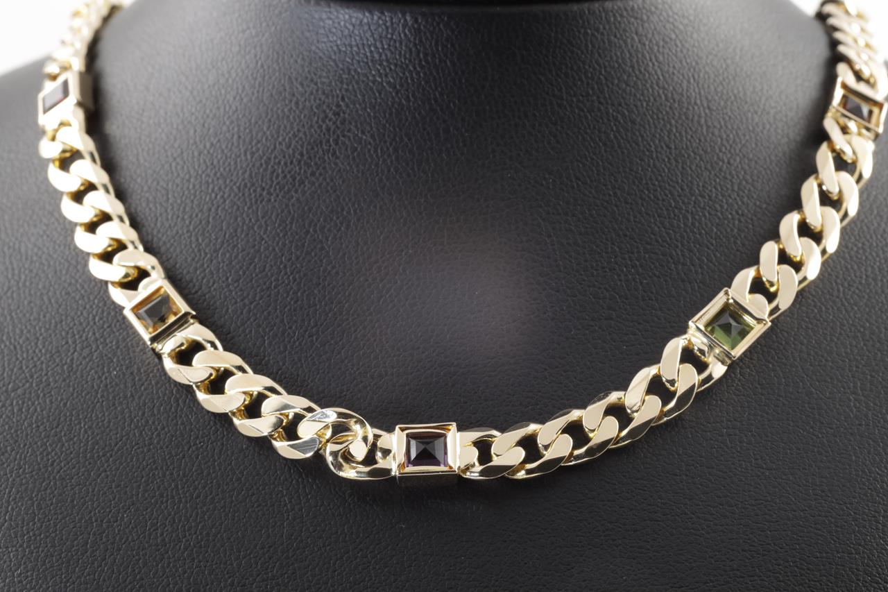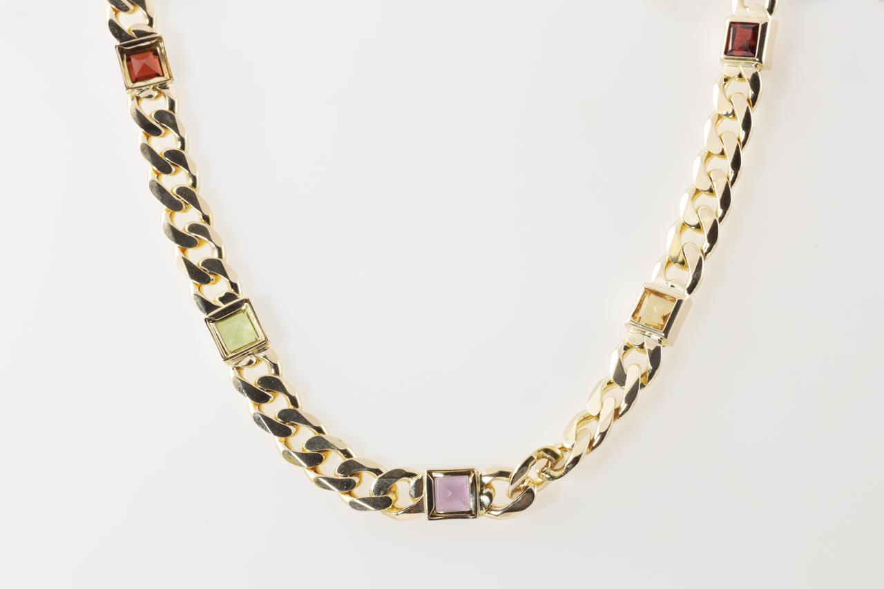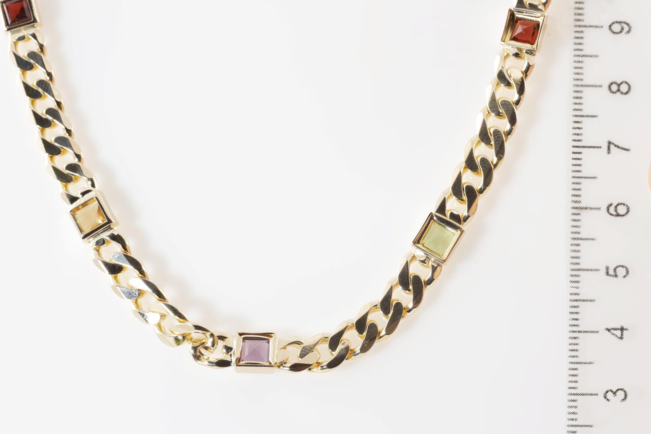 Mixed Gemstone necklace with Aquamarine, Garnet, Peridot, Amethyst & Citrine. 14ct yellow gold. Length: 42cm. Weight: 34.3g (Pre-owned)