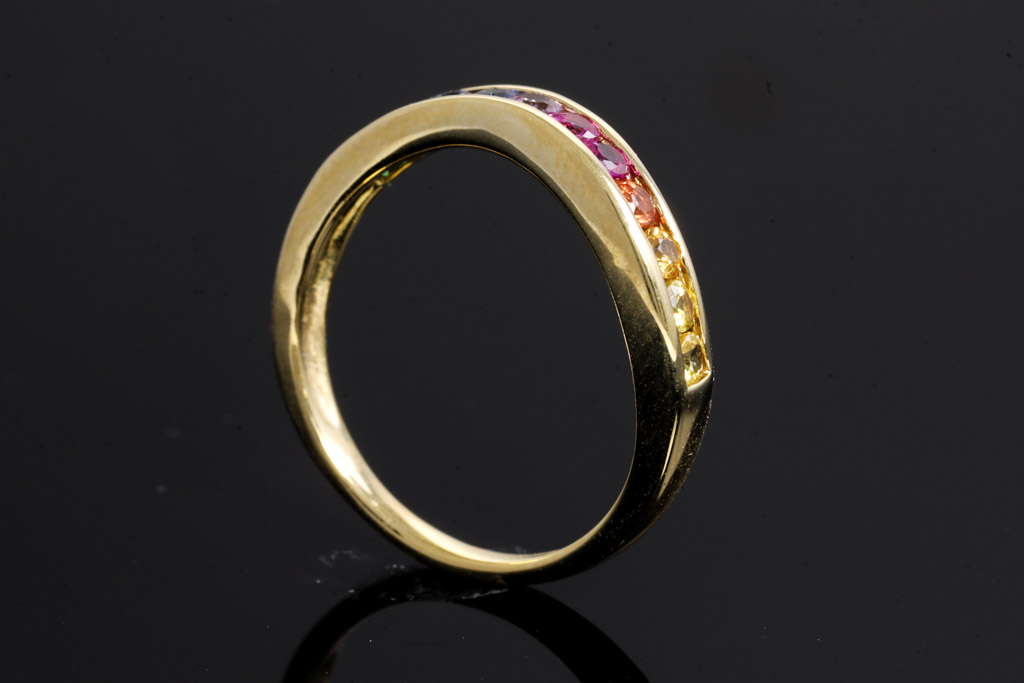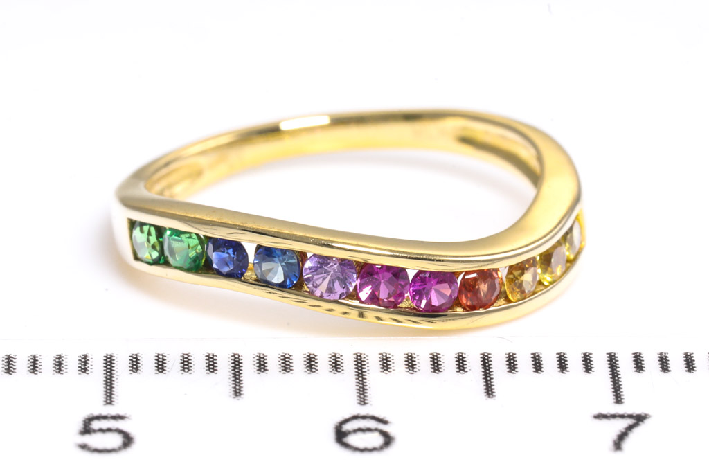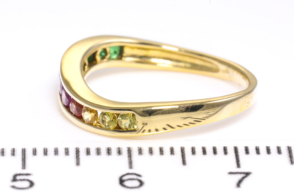 Mixed Gemstone ring with round multi-colour Sapphire totalling 0.35cts, round green Garnet totalling 0.07cts and round Rubies totalling 0.05cts. 18ct yellow gold. Ring size K - ring resizing is not recommended. Weight: 2.6g. (Pre-owned)