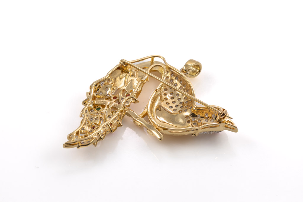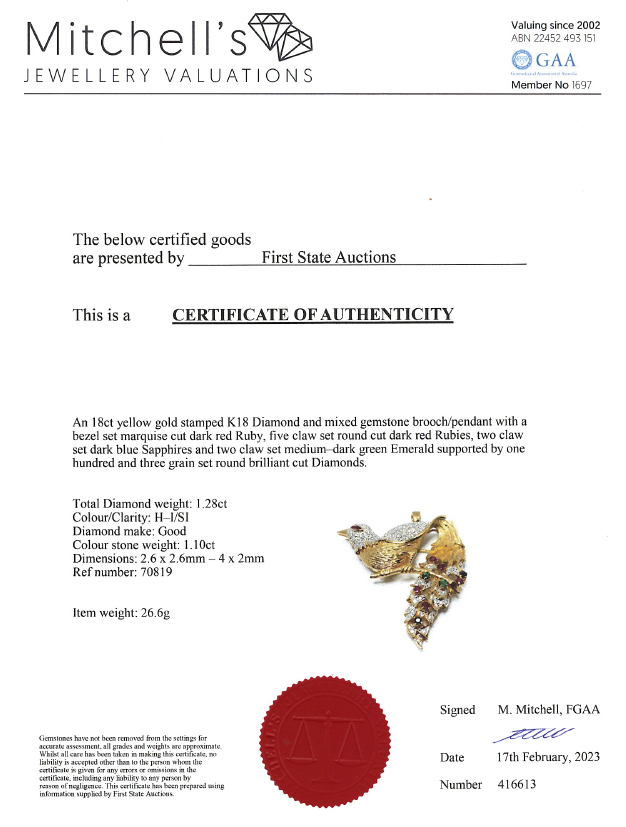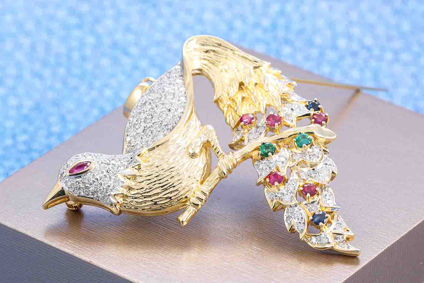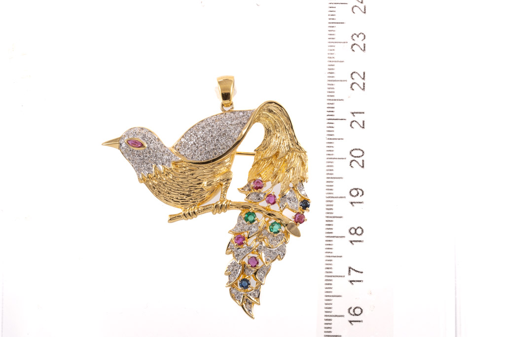 Mixed Gemstones and Diamond bird design Brooch/Pendant with round & marquise cut Rubies, round blue Sapphires, round Emeralds totalling 1.10cts and round Diamonds totalling 1.28cts (Estimated grading: H-I SI). 18ct yellow gold. Weight: 26.6g. With certificate #416613. (Pre-owned)