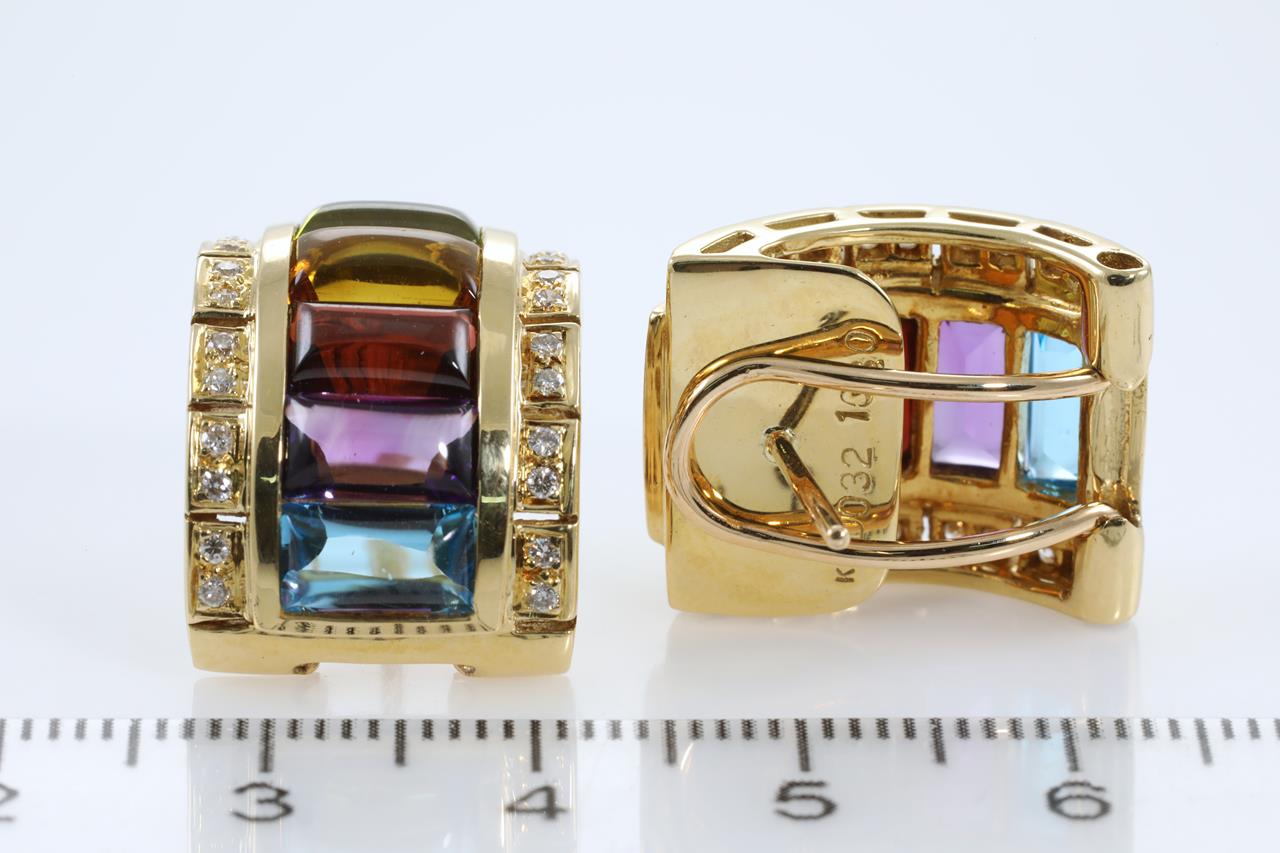 Mixed Gemstones and Diamond earrings with rectangular cabochon cut Topaz, Amethyst, Garnet, Citrine & Peridot totalling 10.80cts and Diamonds totalling 0.32cts (Estimated grading: H SI). 18ct yelow gold. Weight: 16.9g (Pre-owned)