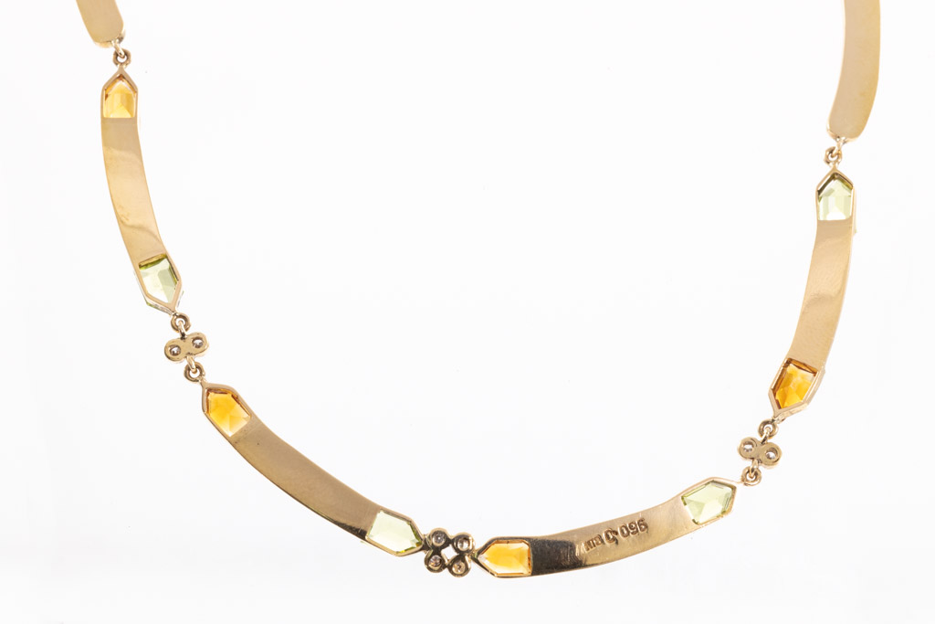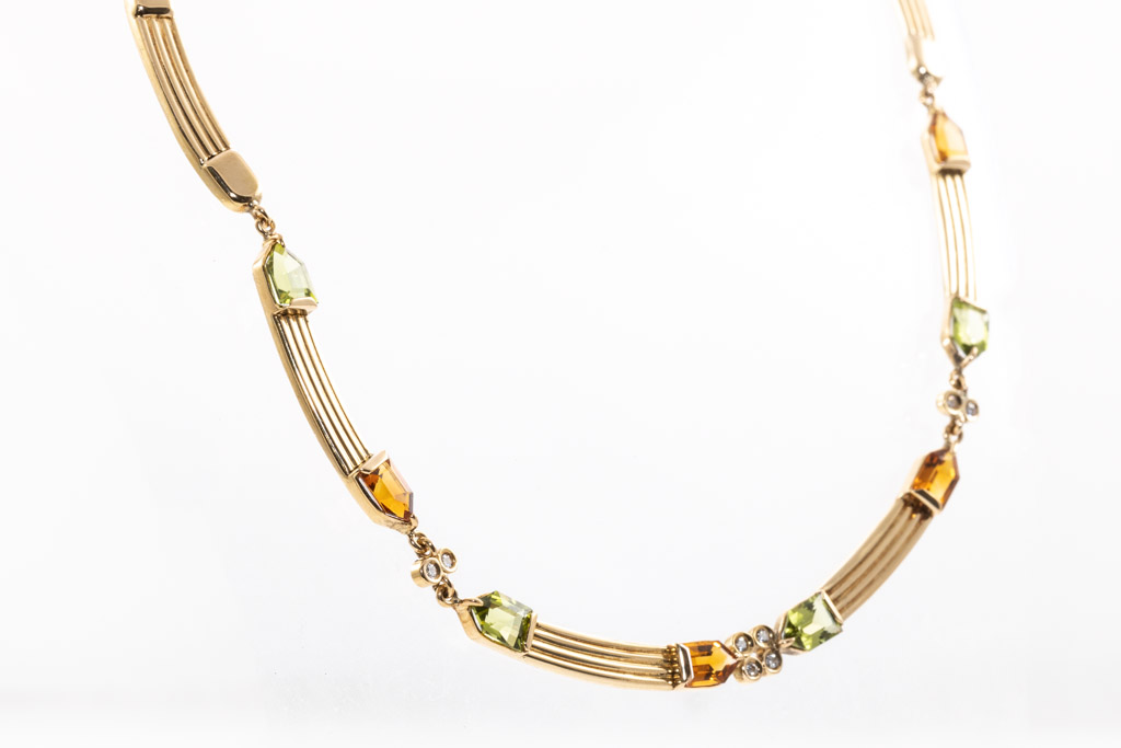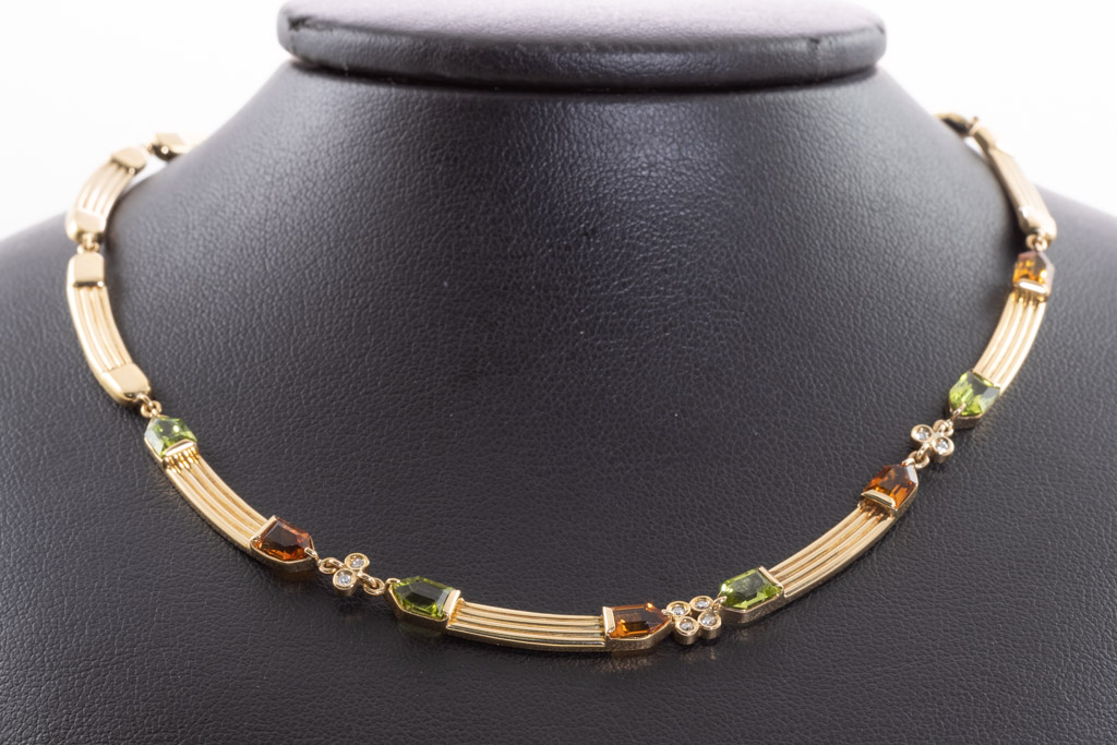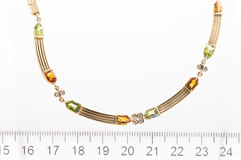 Mixed Gemstones and Diamond necklace with 4 fancy cut Peridot totalling 1.90cts, 4 fancy cut Citrine totalling 1.50cts and round Diamonds totalling 0.09cts. 18ct yellow gold. Length: 41cm. Weight: 16.1g. (Pre-owned)