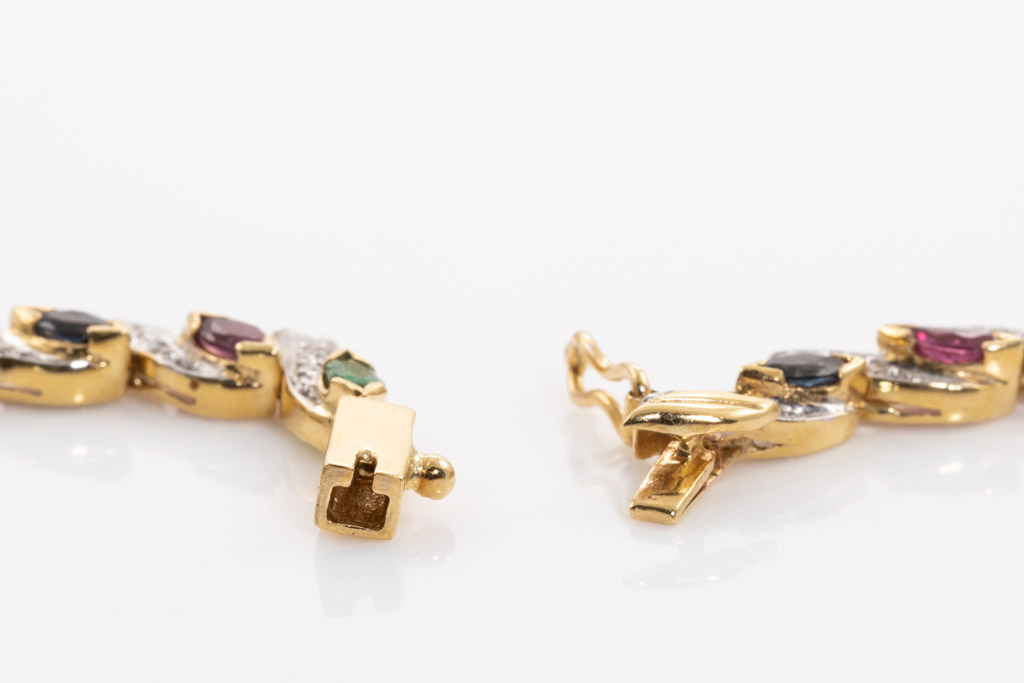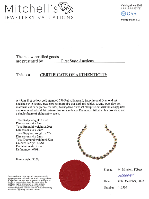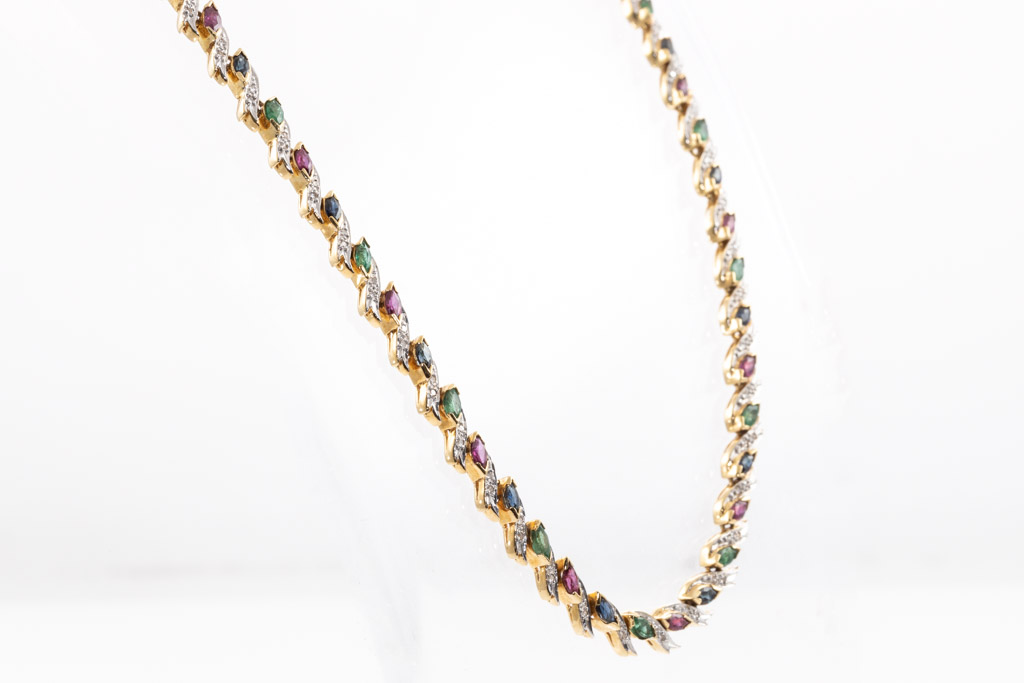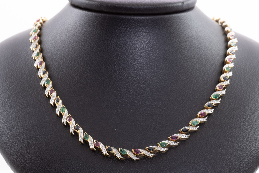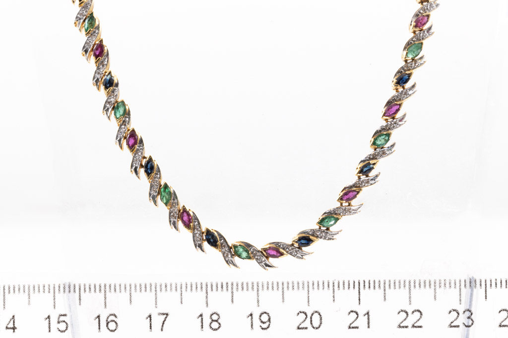 Mixed Gemstones and Diamond necklace with marquise cut Emerald totalling 2.20cts, marquise cut Ruby totalling 2.75cts, marquise cut blue Sapphires totalling 2.75cts and round Diamonds totalling 0.82cts (Estimated grading: H-I SI). 18ct yellow gold. Length 43cm. Weight: 30.9g. With Certificate #416510. (Pre-owned)