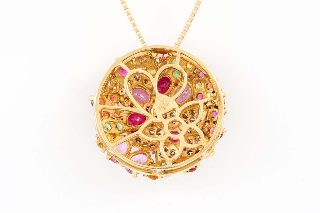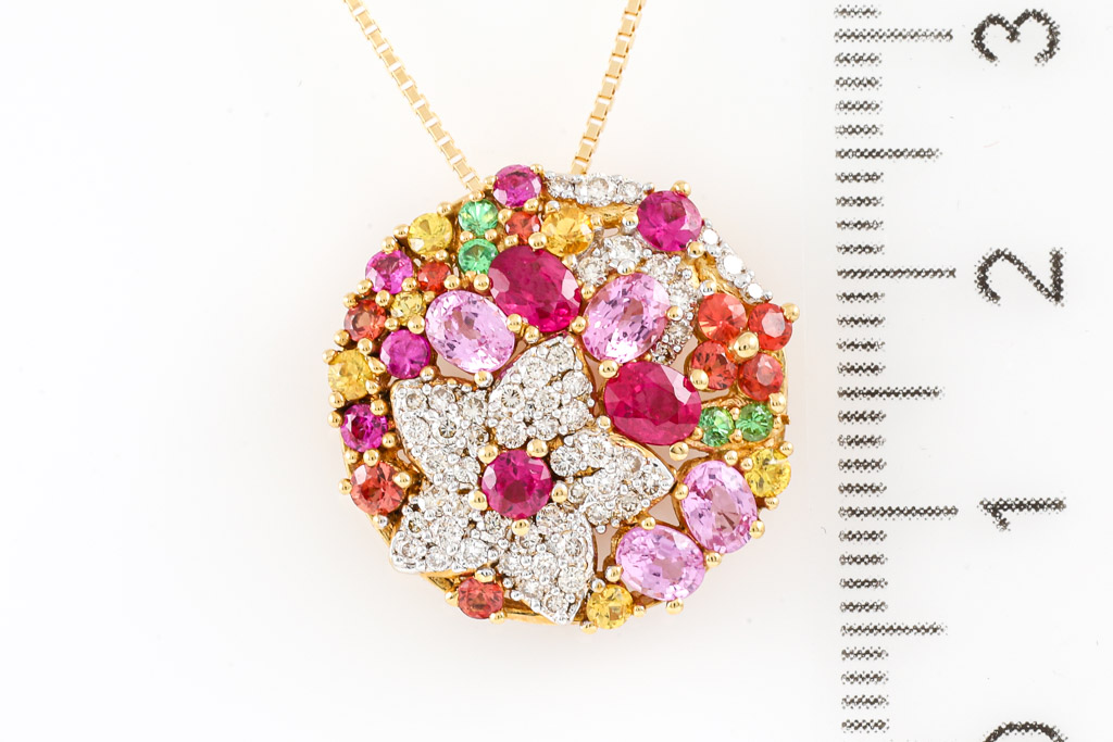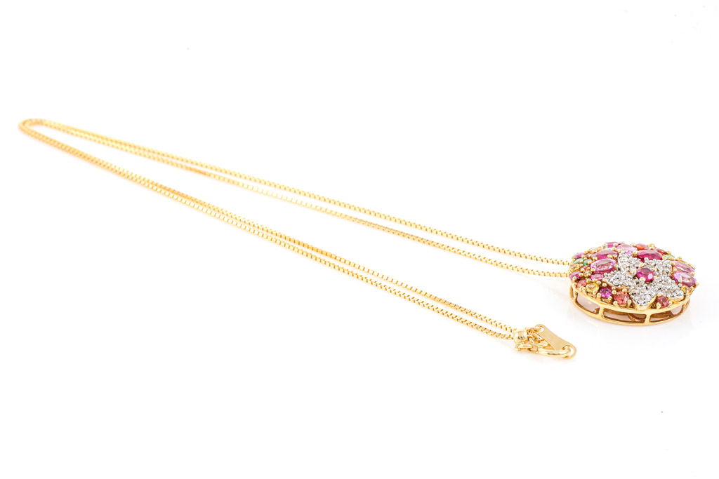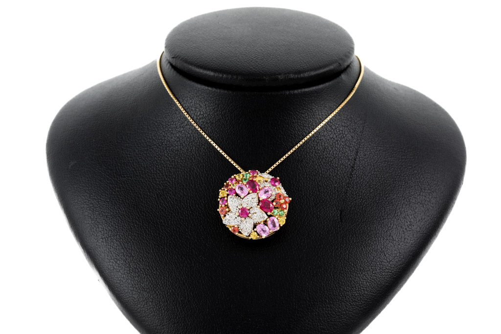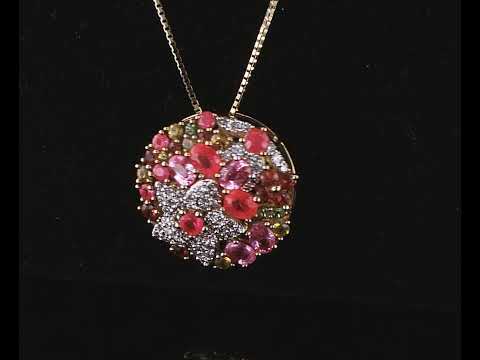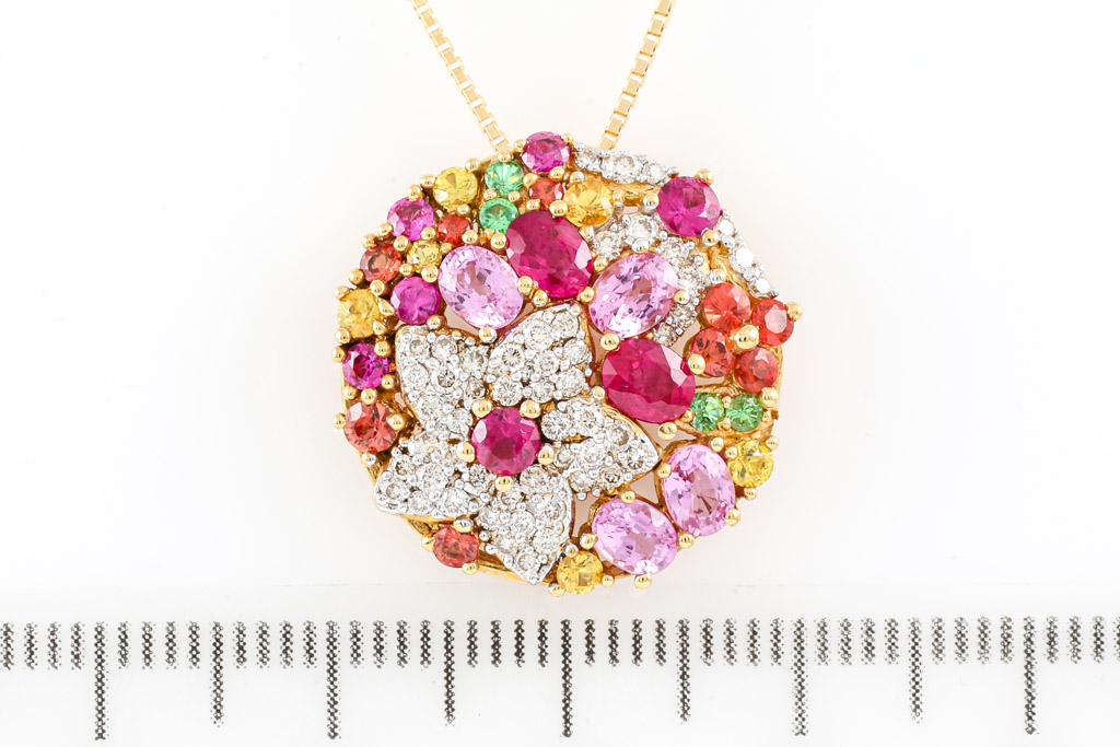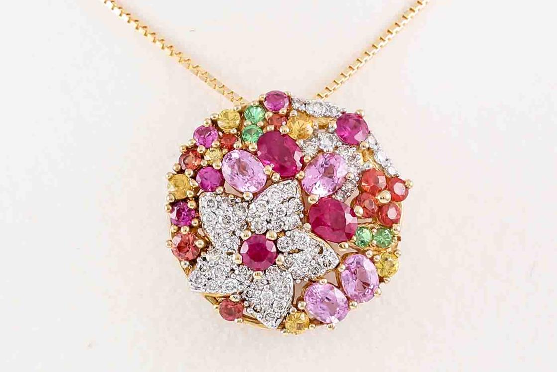 Mixed Gemstones and Diamond pendant with Rubies totalling 0.67cts, round green Garnet totalling 0.06cts, Pink Sapphires totalling 1.40cts, round orange and yellow Topaz totalling 0.70cts and round Diamonds totalling 0.40cts (Estimated grading: J-K SI). 18ct yellow gold with 44cm 18ct yellow gold adjustable chain. Weight: 7.1g. (Pre-owned)