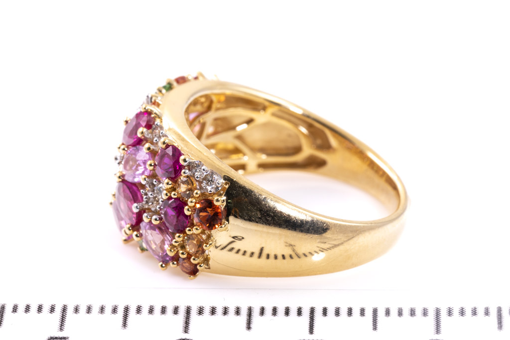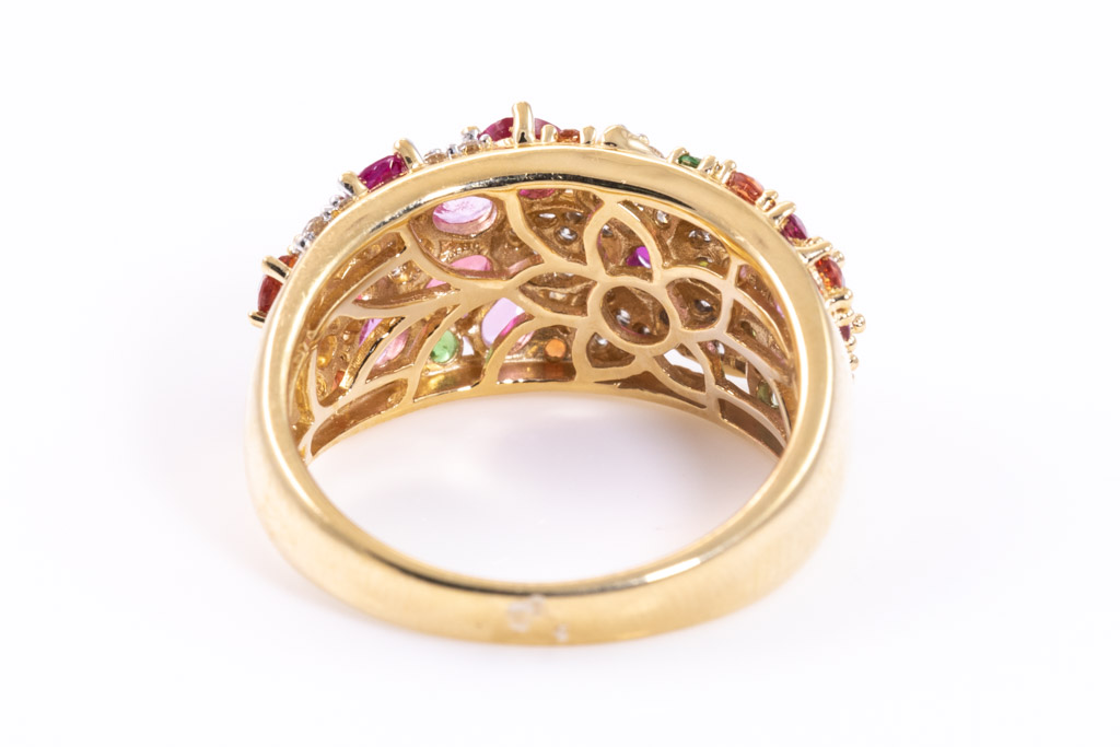 Mixed Gemstones and Diamond ring with round & oval Rubies totalling 0.67cts, oval pink Sapphires totalling 1.12cts, round green Garnet totalling 0.11cts, round orange & yellow Topaz totalling 0.40cts and round Diamonds totalling 0.34cts (Estimated grading: J-K SI). 18ct yellow gold. Ring size Q1/2. Weight: 8.4g. (Pre-owned)