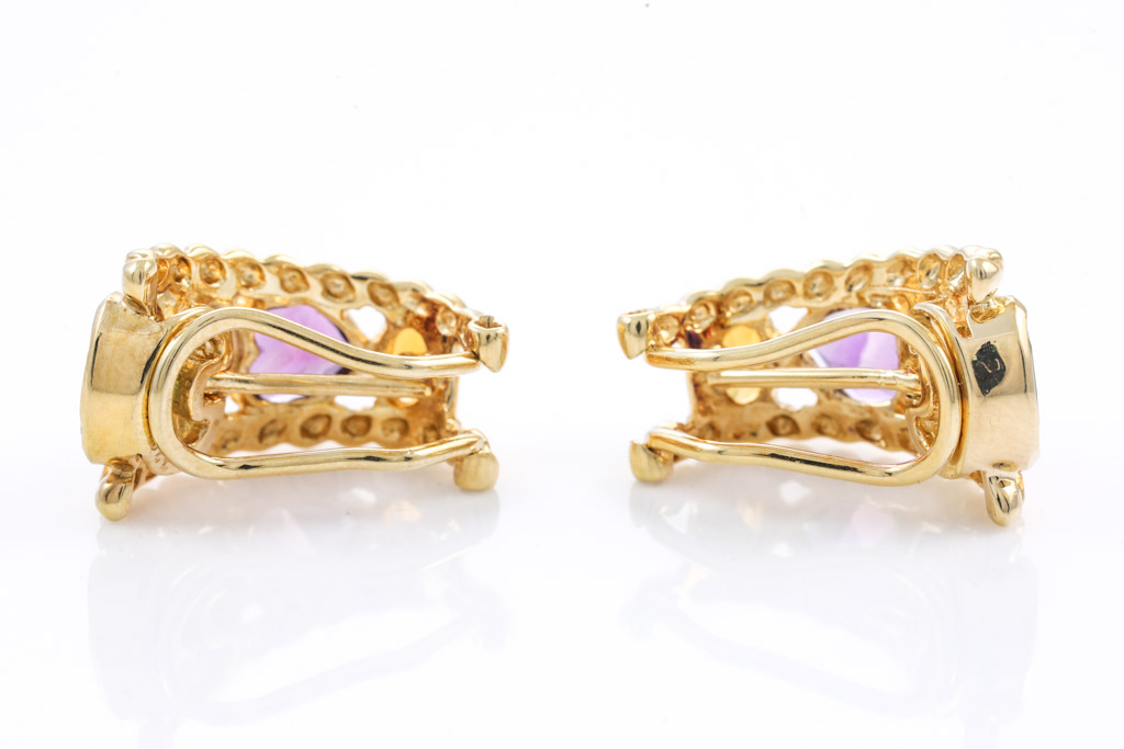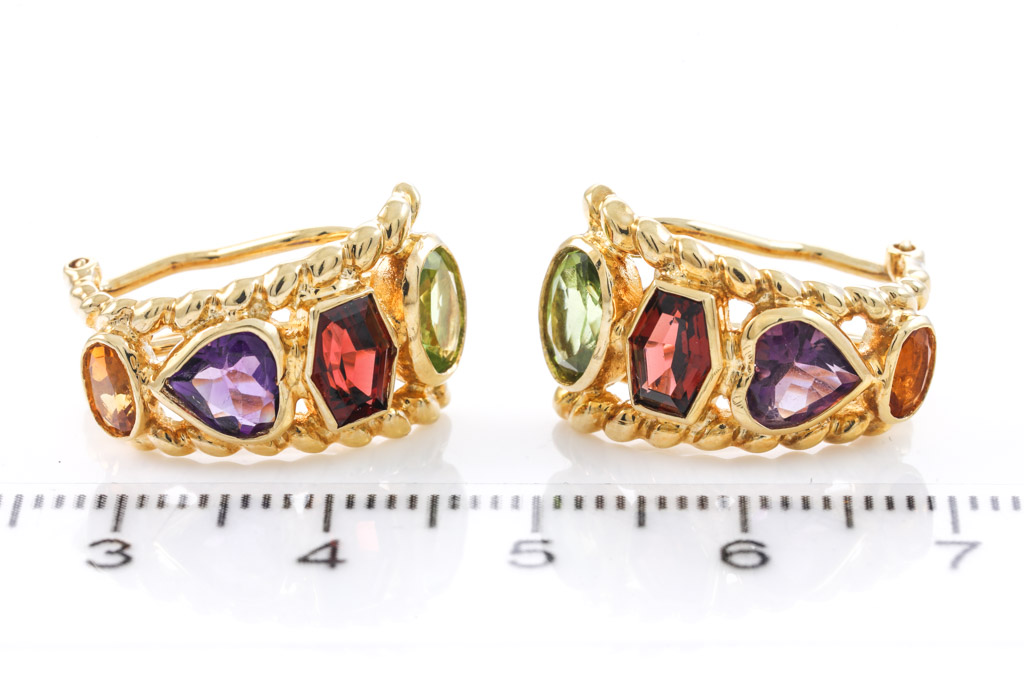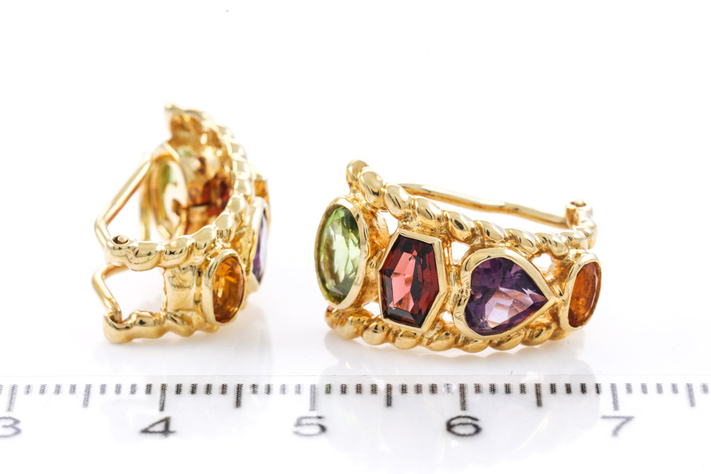 Mixed Gemstones clip-on earrings (with foldable posts) with fancy shape Amethysts, Citrine, Garnets and Peridots totalling 2.29cts. 18ct yellow gold. Weight: 9.6g. (Pre-owned)