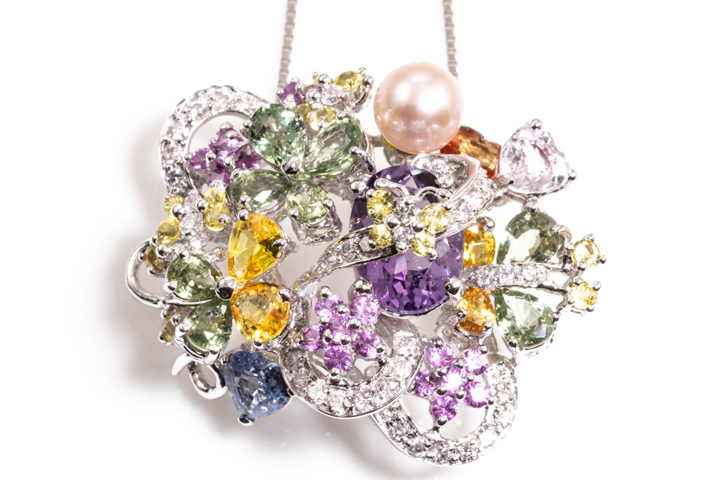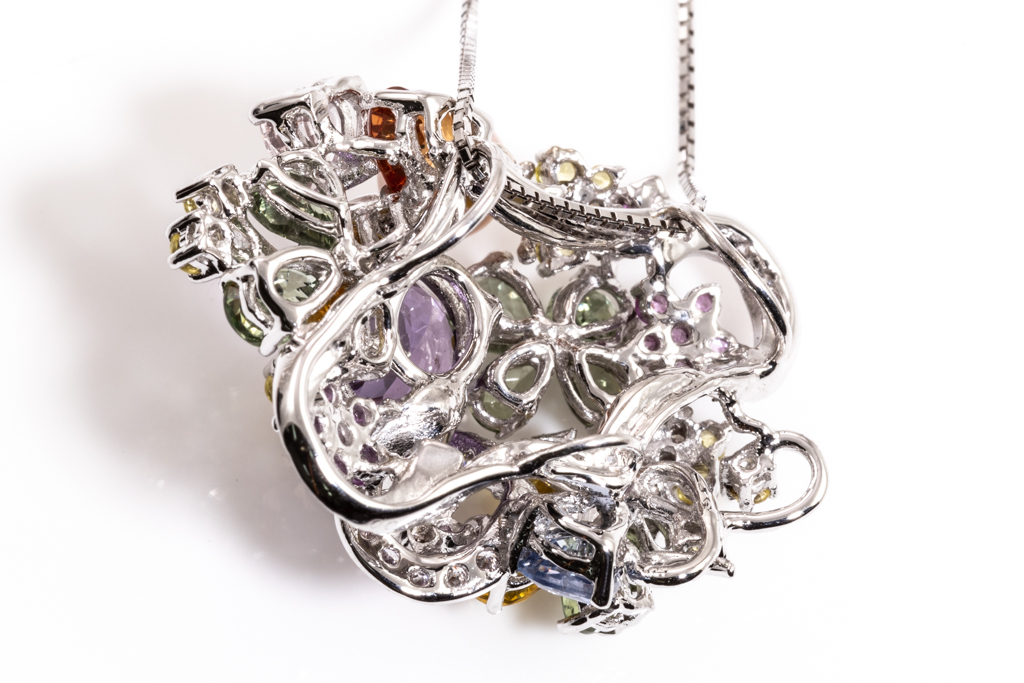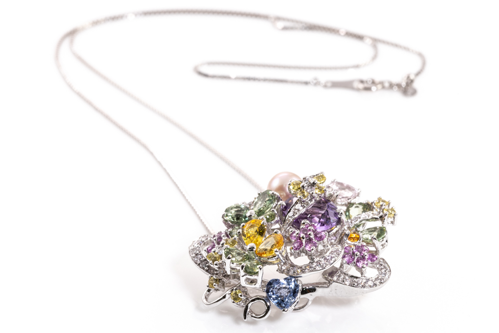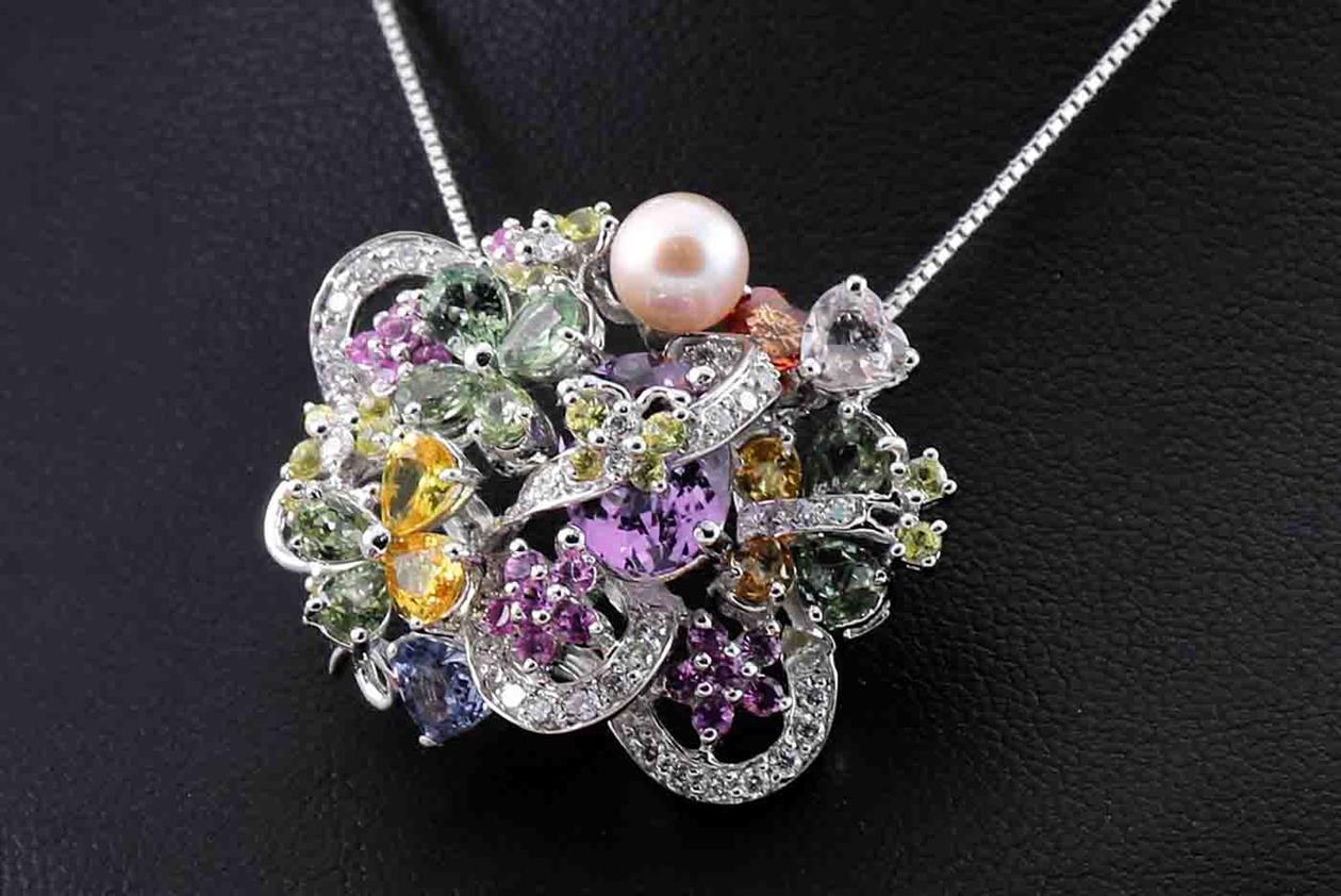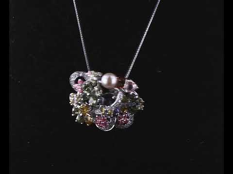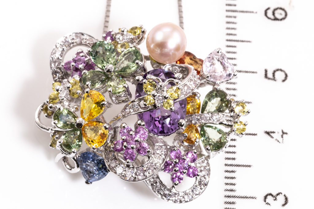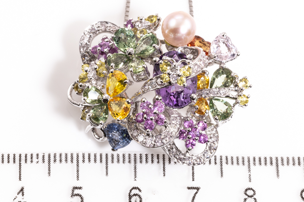 Mixed Gemstone, Pearl and Diamond pendant with multi-colour Sapphires (colour including pink, orange, yellow, green and blue) totalling 6.00cts, oval Amethyst of 2.30ct, a cultured Pear of 6mm and round Diamonds totalling 0.56cts (Estimated grading: G SI). 18ct white gold with 44cm adjustable chain. Weight: 14.5g. (Pre-owned)