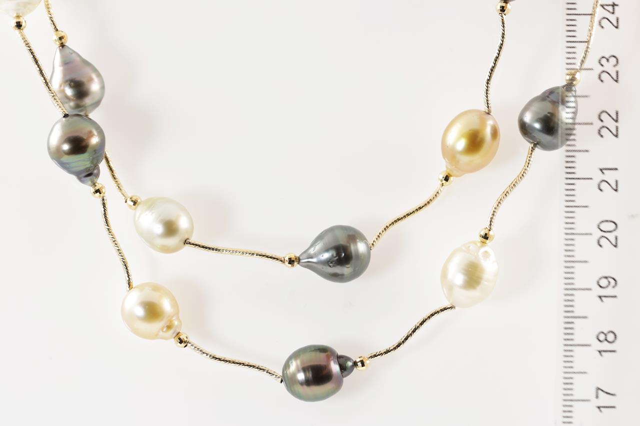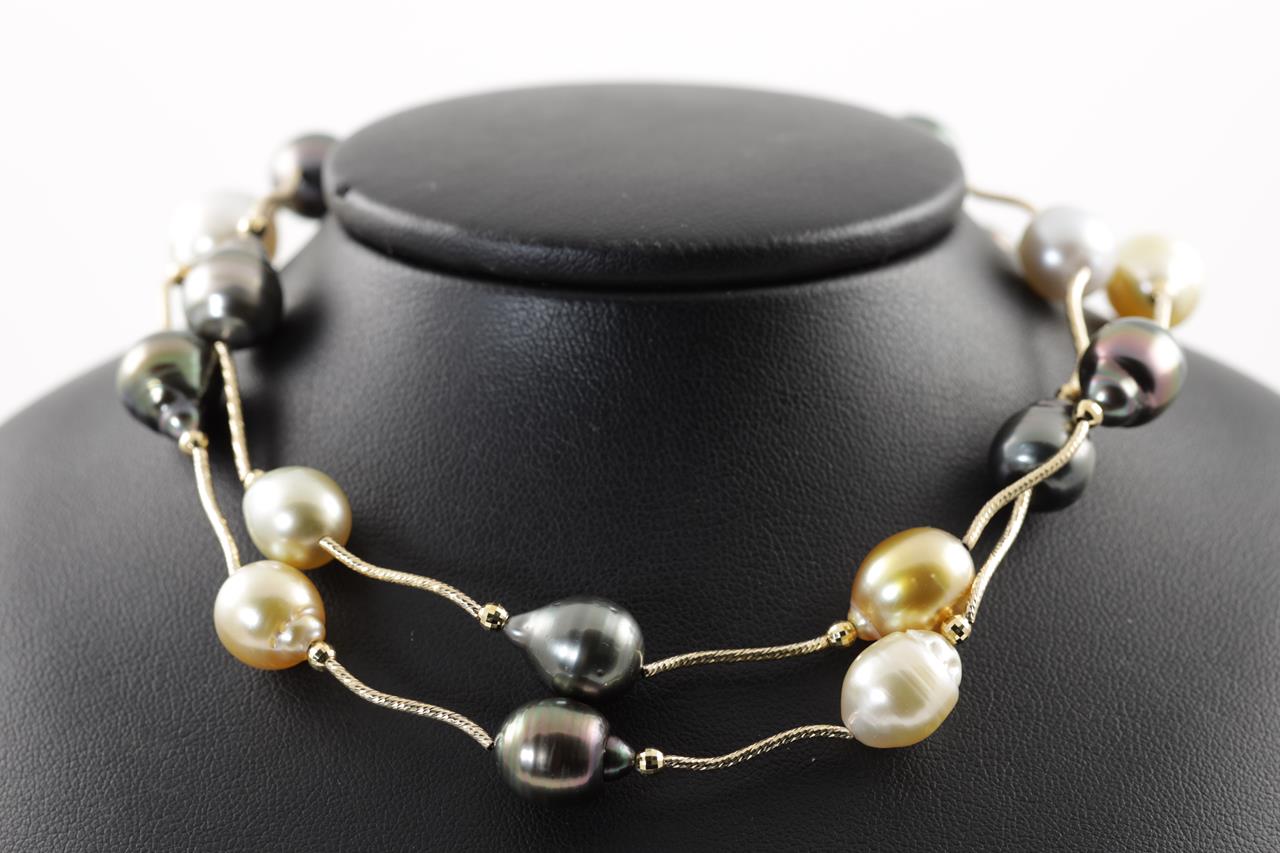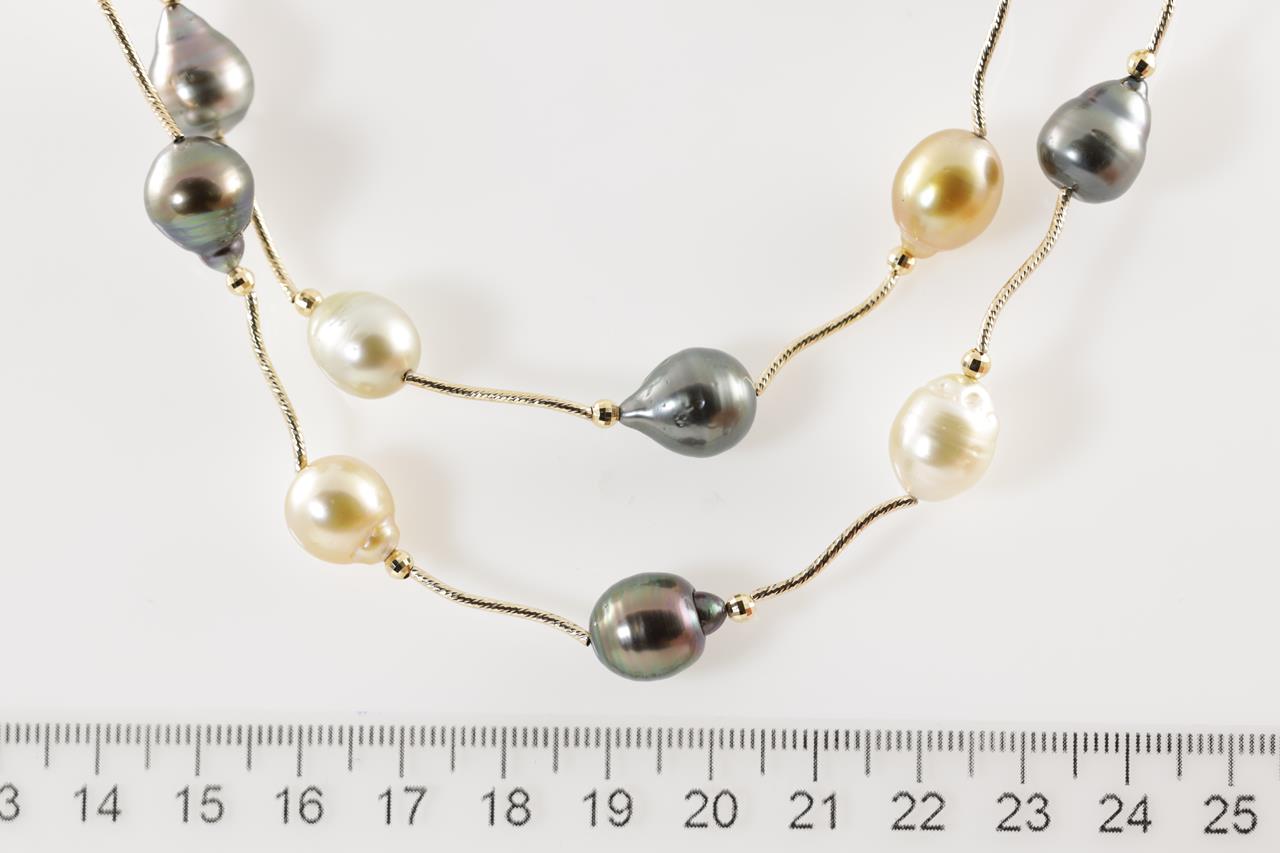 Pearl necklace with Tahitian, golden & white South Sea circle Pearls of 10mm - 13mm. 18ct yellow gold. Length: 90cm. Weight: 53.7g. (Pre-owned)