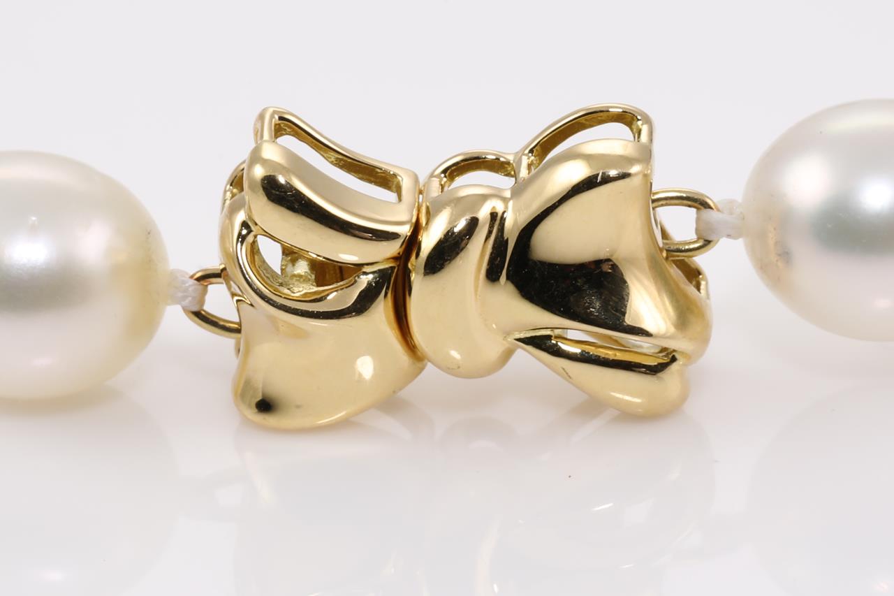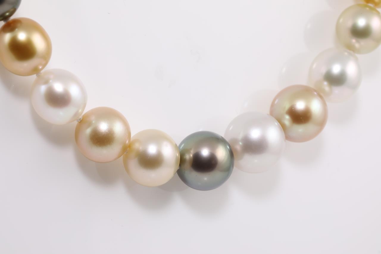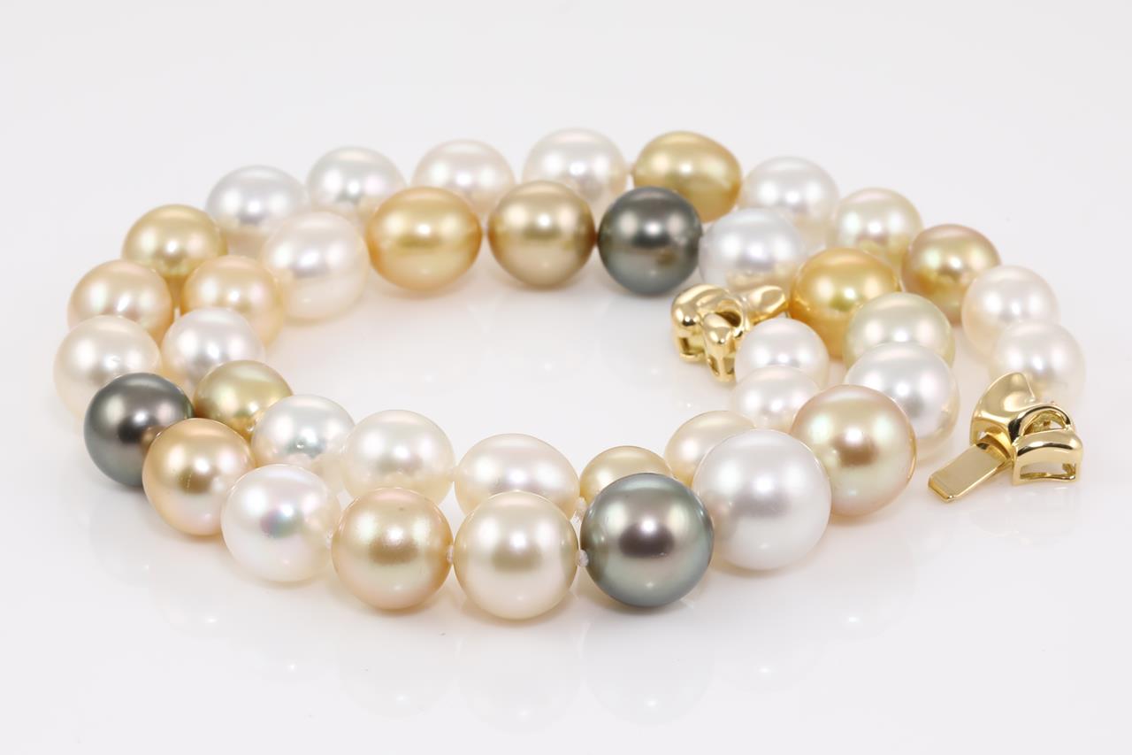 Pearl necklace with oval shape graduated Tahitian, white & golden South Sea pearls of 8.7mm - 11.9mm. 18ct yellow gold clasp. Length: 42cm. Weight: 29.4g (Pre-owned)