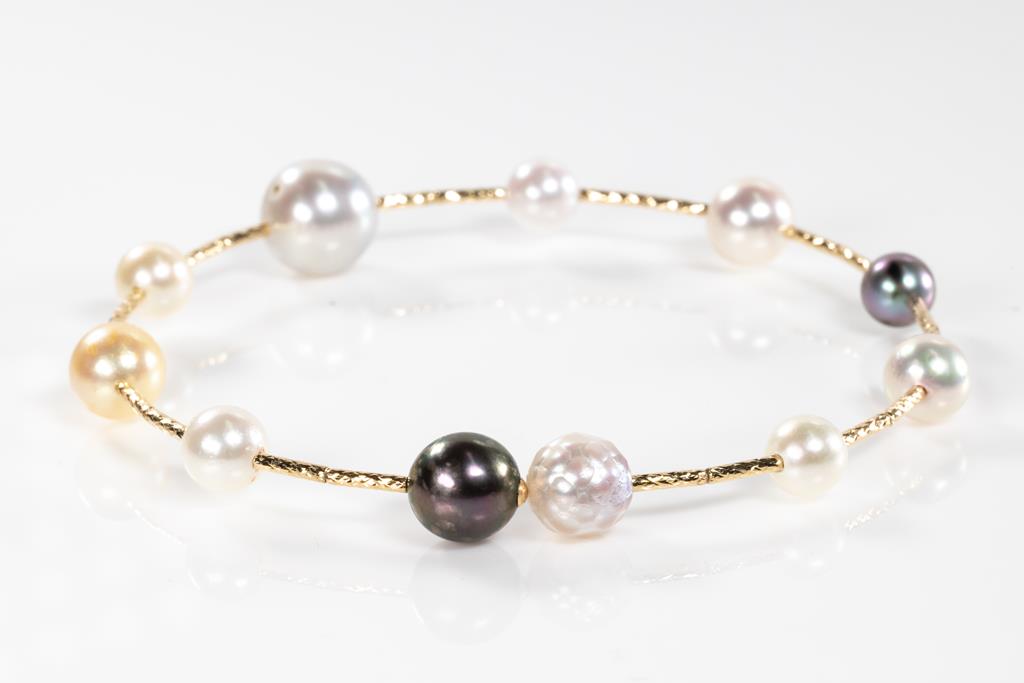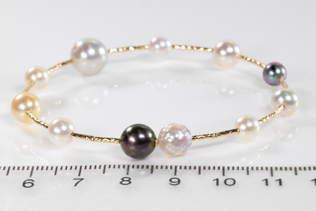 Pearl wire bangle with South Sea, Tahitian and Akoya Pearls (note one faceted pearl) of 10.0mm-5.5mm. 18ct yellow gold. Length: 18cm. Weight: 5.9g. (Pre-owned)