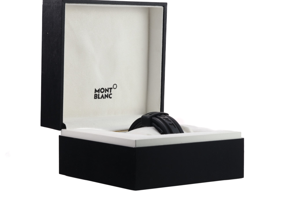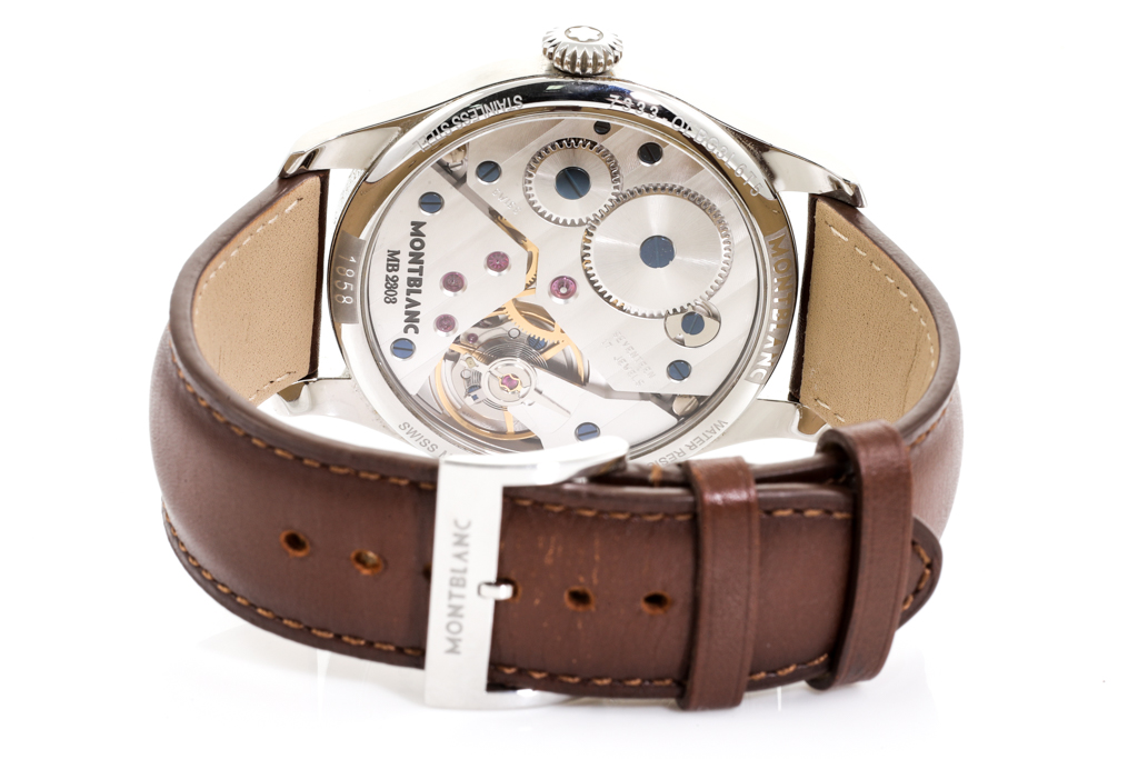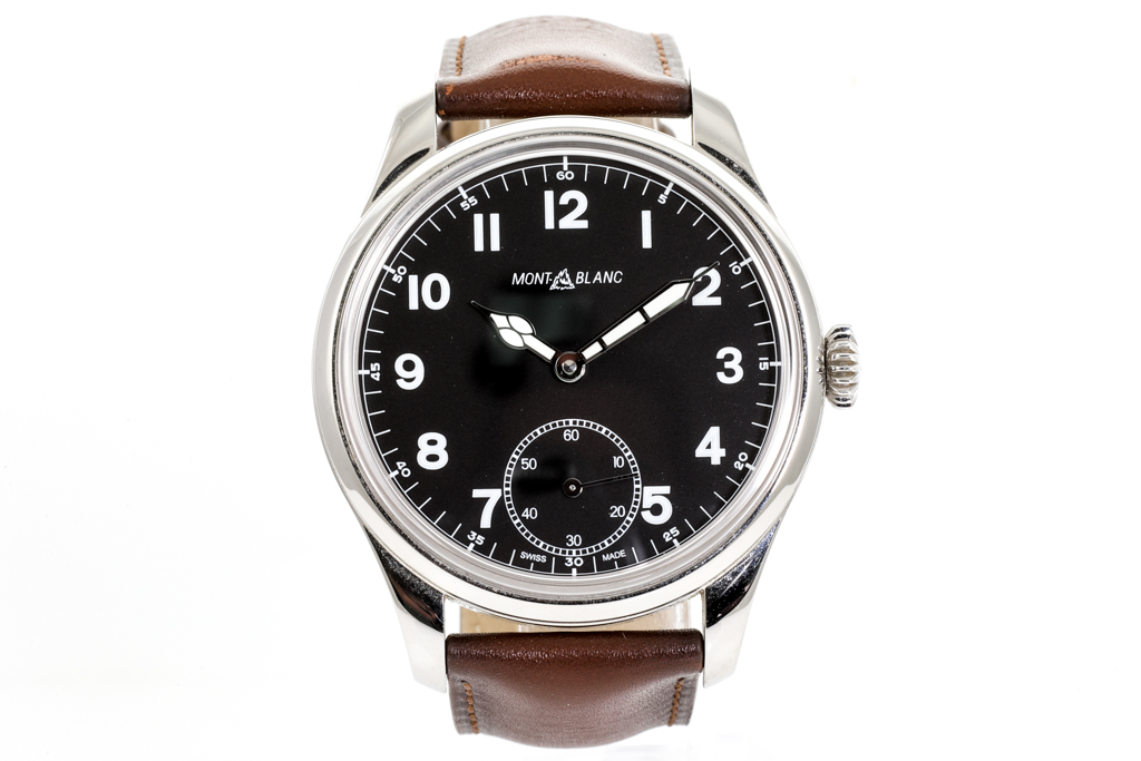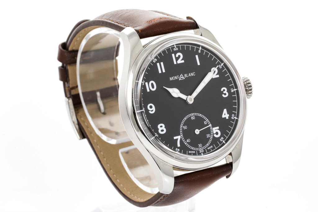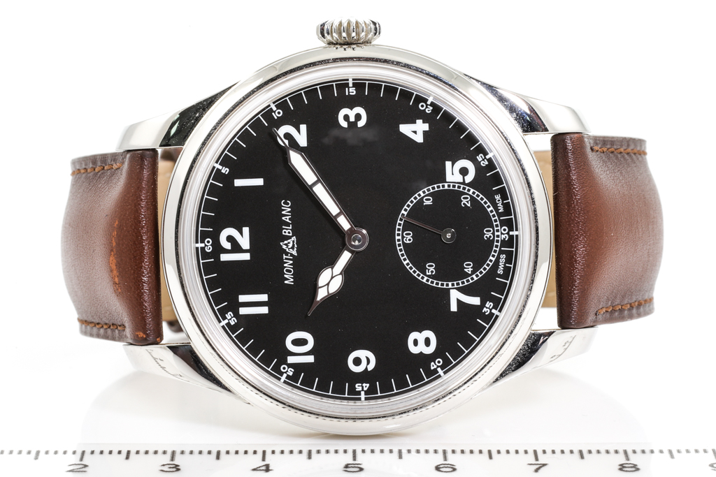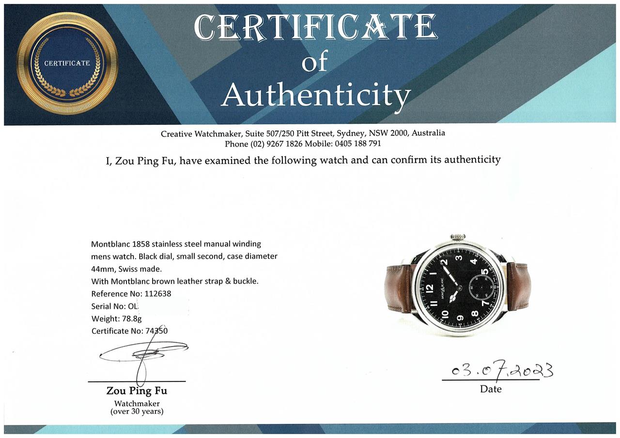 Montblanc 1858 stainless steel manual winding mens watch. Black dial, small second, case diameter 44mm, strap length: 21cm, Swiss made. Ref# 112638. With Montblanc brown leather strap & buckle. With Certificate of Authenticity and Montblanc box. 3 month FSA warranty. (Pre-owned)