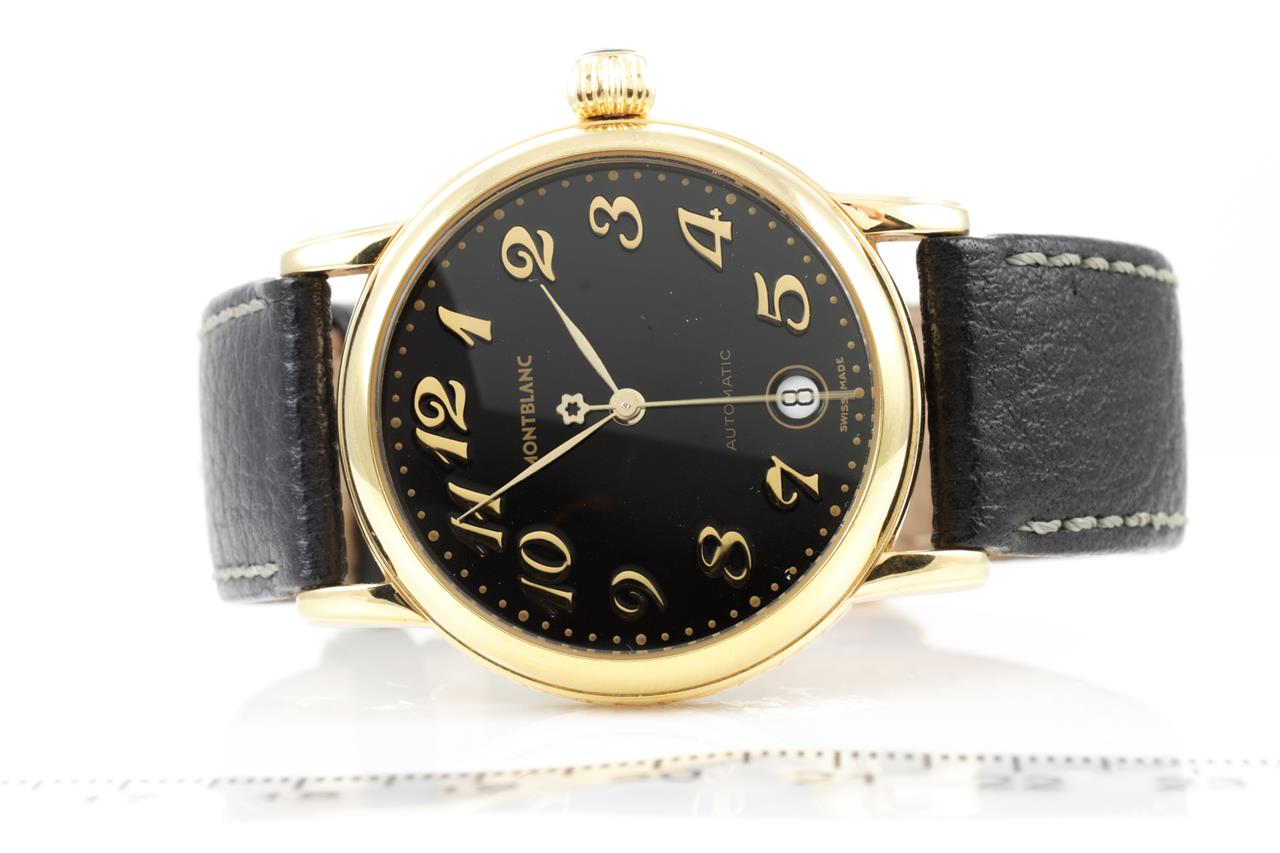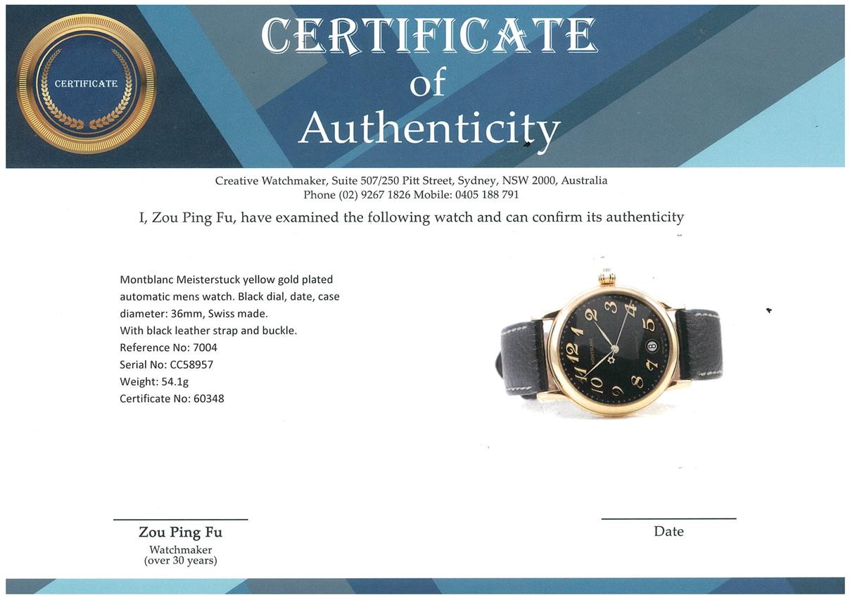 Montblanc Meisterstuck yellow gold plated automatic mens watch. Black dial, date, case diameter: 36mm, length: 20cm, Swiss made. Ref# 7004. With black leather strap and buckle. With Certificate of Authenticity. 3 month FSA warranty. (Pre-owned)