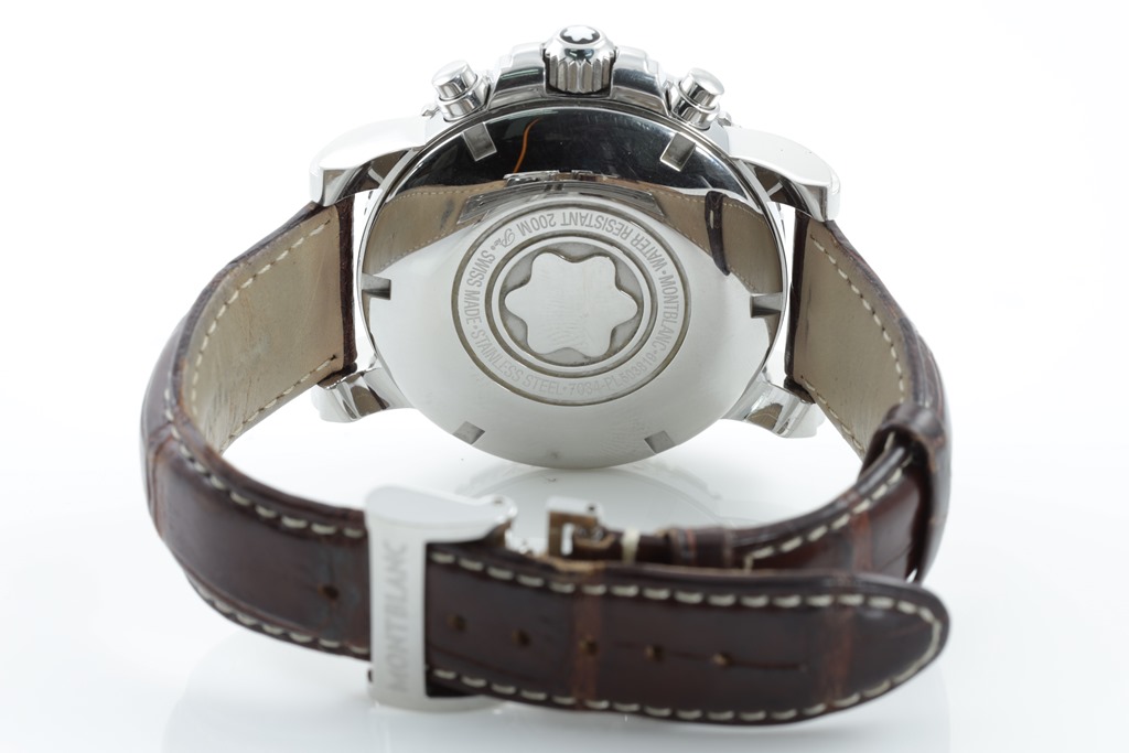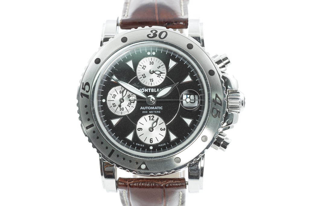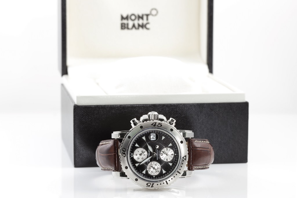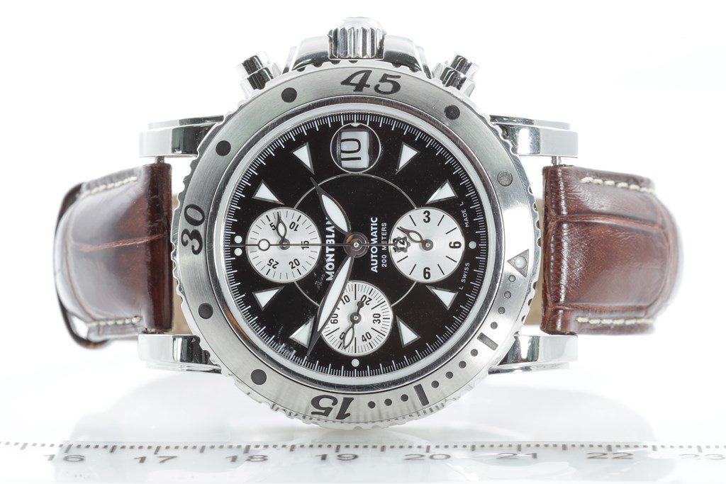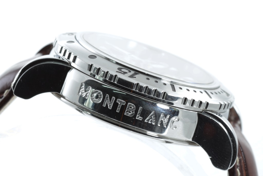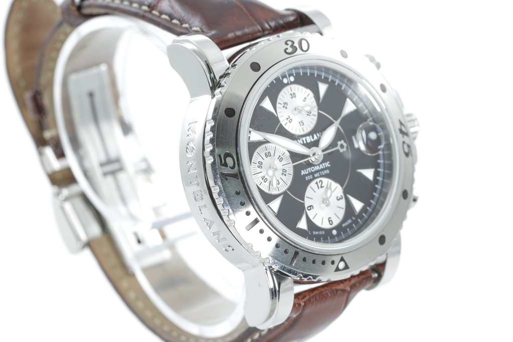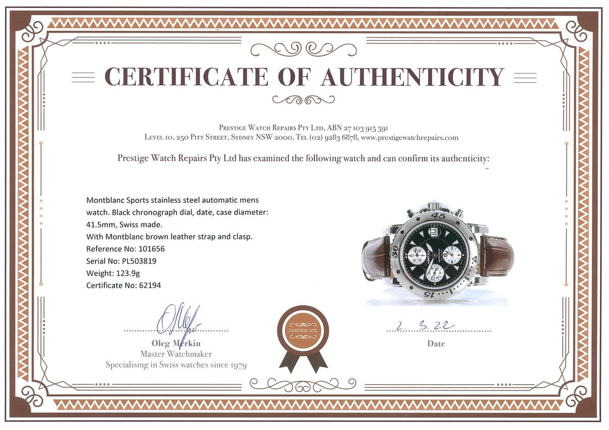 Montblanc Sports stainless steel automatic mens watch. Black chronograph dial, date, case diameter: 41.5mm, writ size: 17cm, Swiss made. Ref# 101656. With Montblanc brown leather strap and clasp. With Certificate of Authenticity, Montblanc International Guarantee Certificate Booklet and Montblanc box. (Pre-owned)