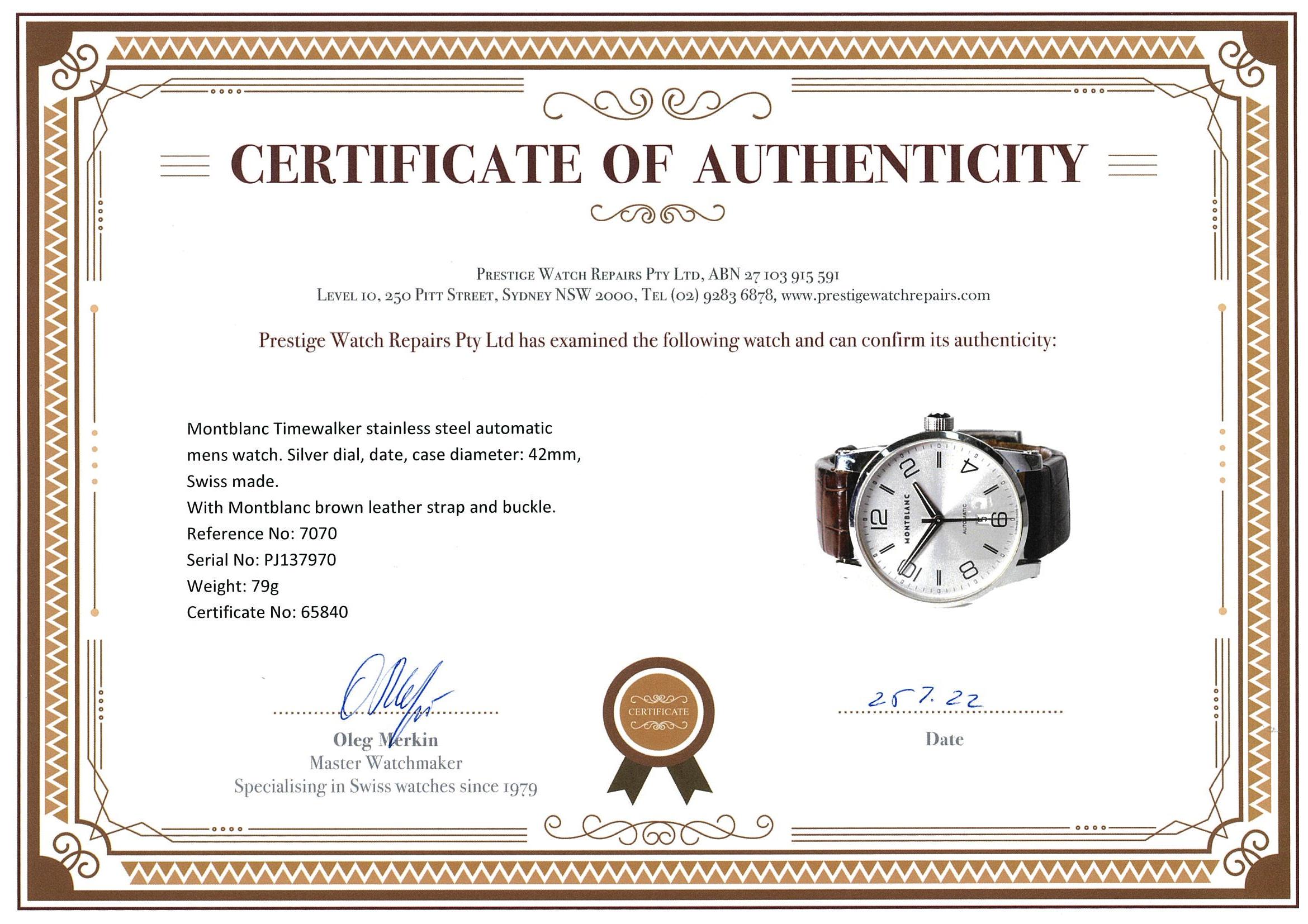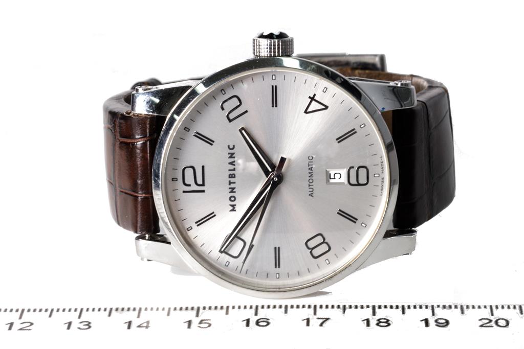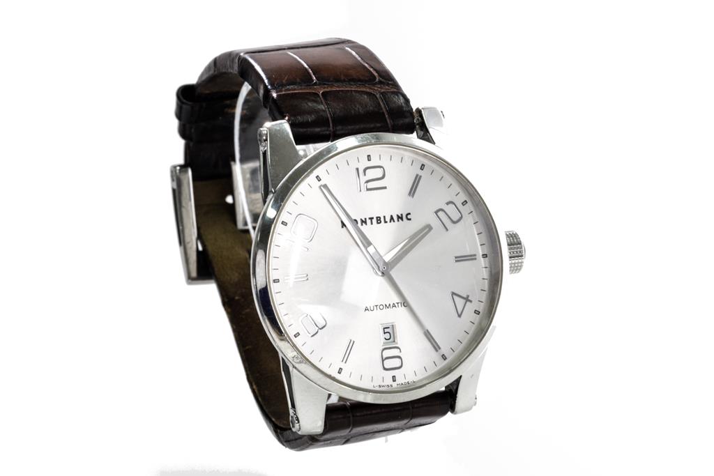 Montblanc Timewalker stainless steel automatic mens watch. Silver dial, date, case diameter: 42mm, strap length: 20.5cm, Swiss made. Ref# 7070. With Montblanc brown leather worn strap and buckle. With Certificate of Authenticity. 3 month FSA warranty. (Pre-owned)